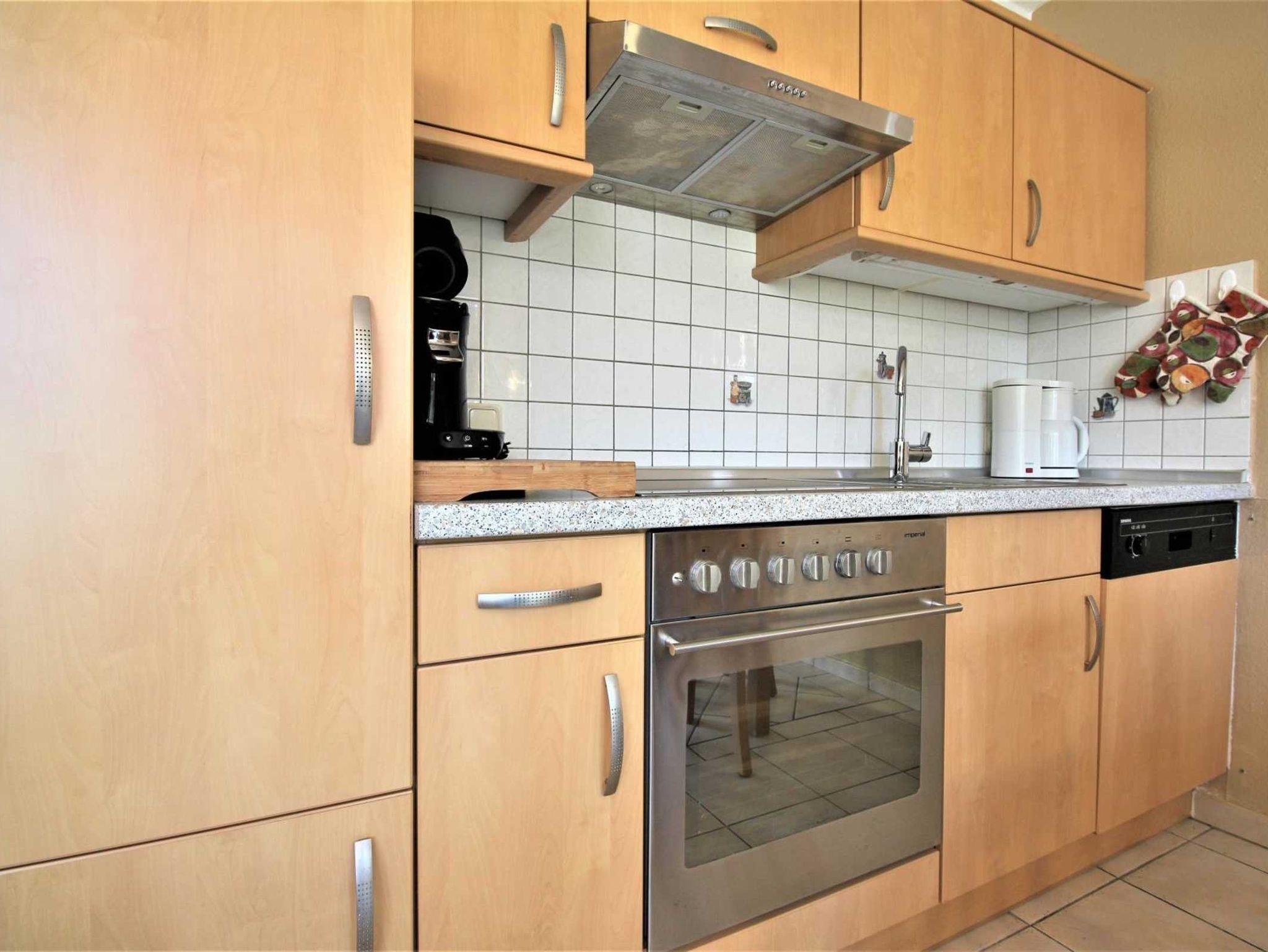 Der Küchenbereich besteht aus einer Küchenzeile mit Geschirrspüler, Umluftherd mit Backofen und großem kindergesichertem Ceranfeld, einer separaten Mikrowelle, Filter- und Senseo-Kaffee-Maschine, Wasserkocher und Toaster. Der geräumige Kühlschrank hat ein 3-Sterne-Gefrierfach. Komplettes Ess- und Kochgeschirr ist in ausreichender Zahl vorhanden.