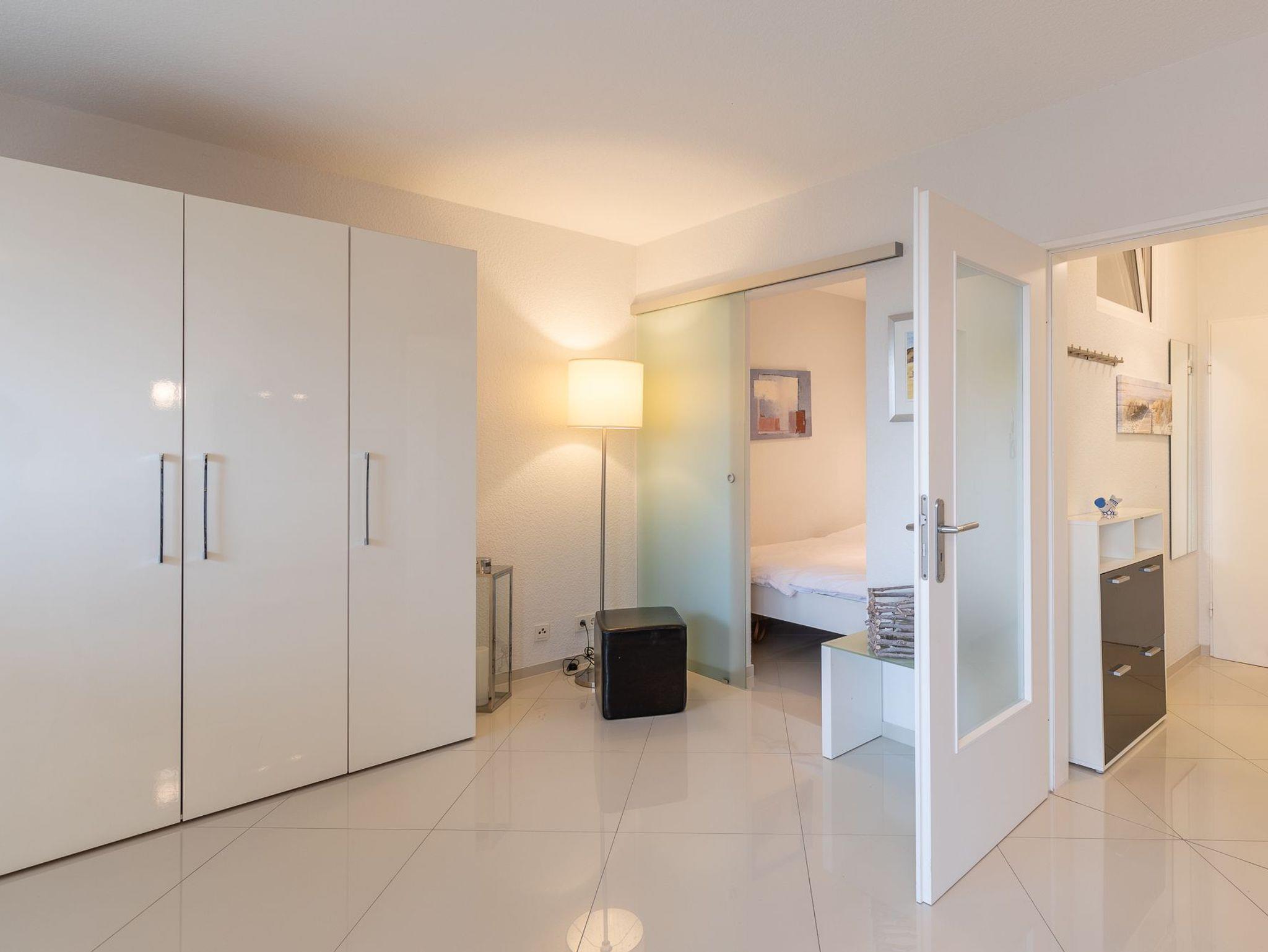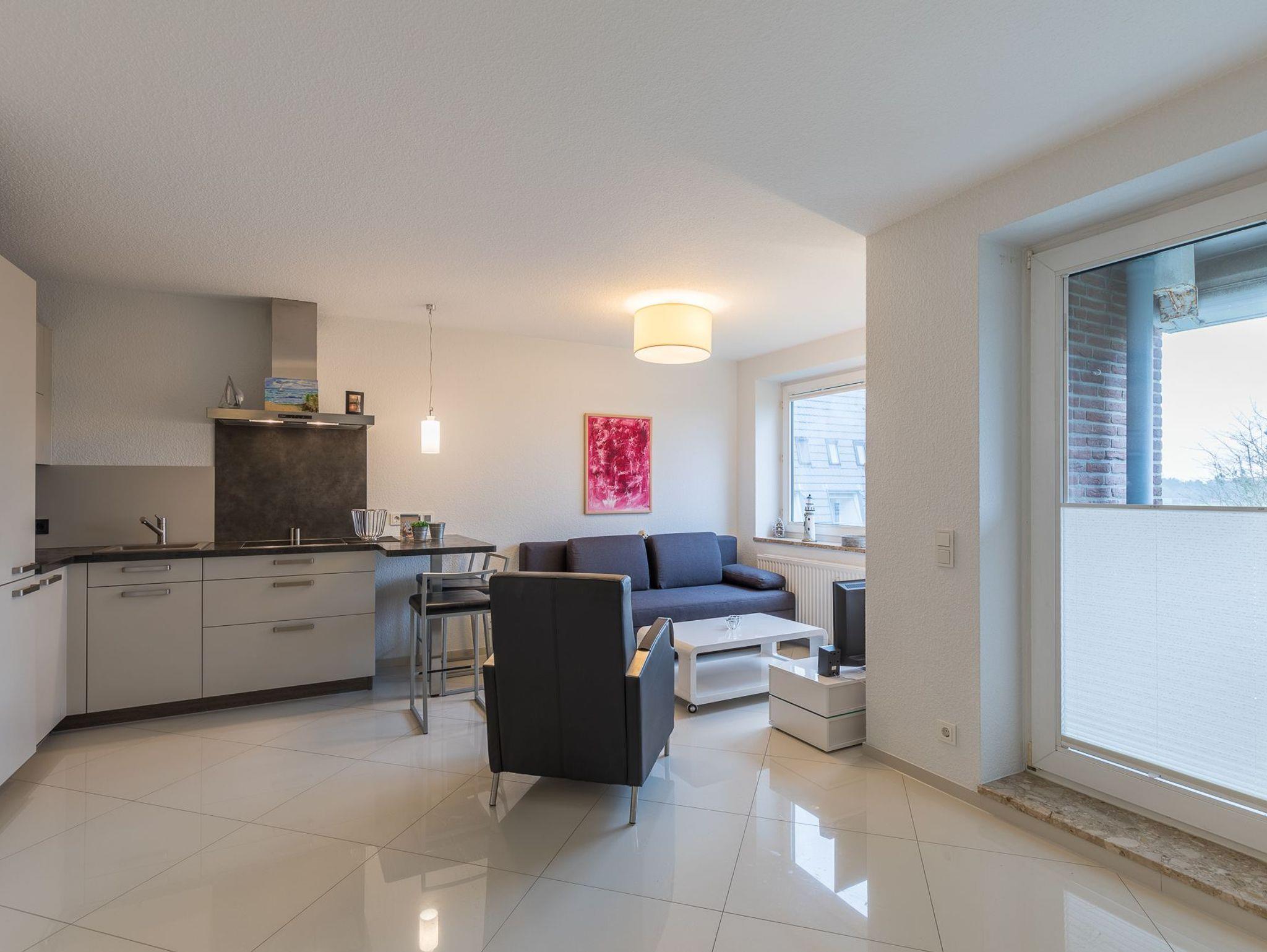 Mit einer Größe von ca. 54 m² Wohnfläche ist die Wohnung komplett bis zu 2 Personen ausgestattet, Wohnzimmer mit kompletter Einbauküche (Backofen, Cerankochfeld, Geschirrspüler, Toaster, Wasserkocher, Kühlschrank), Essplatz/Tresen, Sofa-Ecke[nbsp][nbsp]und direktem Zugang zum Balkon (Balkon mit Markise), der Schlafbereich, mit separaten TV, geht direkt vom Wohnzimmer ab und kann mit einer Glasschiebetür am Tag verschlossen werden, Bad mit Dusche und WC, 1 Flatscreen TV im Wohnzimmer, Nichtraucherwohnung, keine Haustiere, PKW-Stellplatz direkt am Haus.