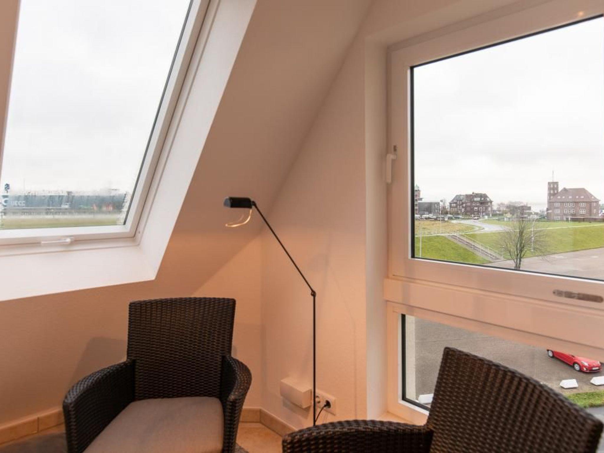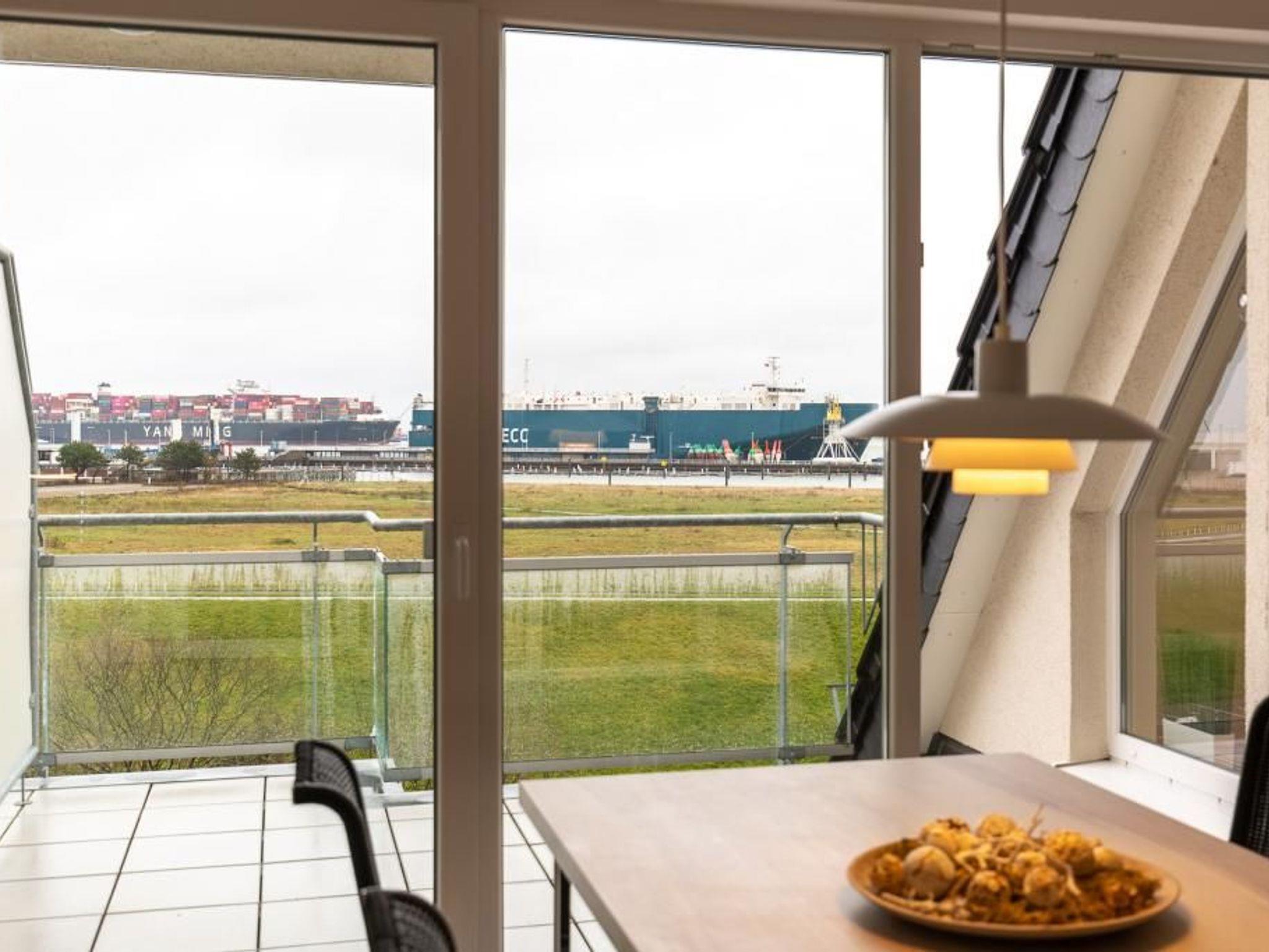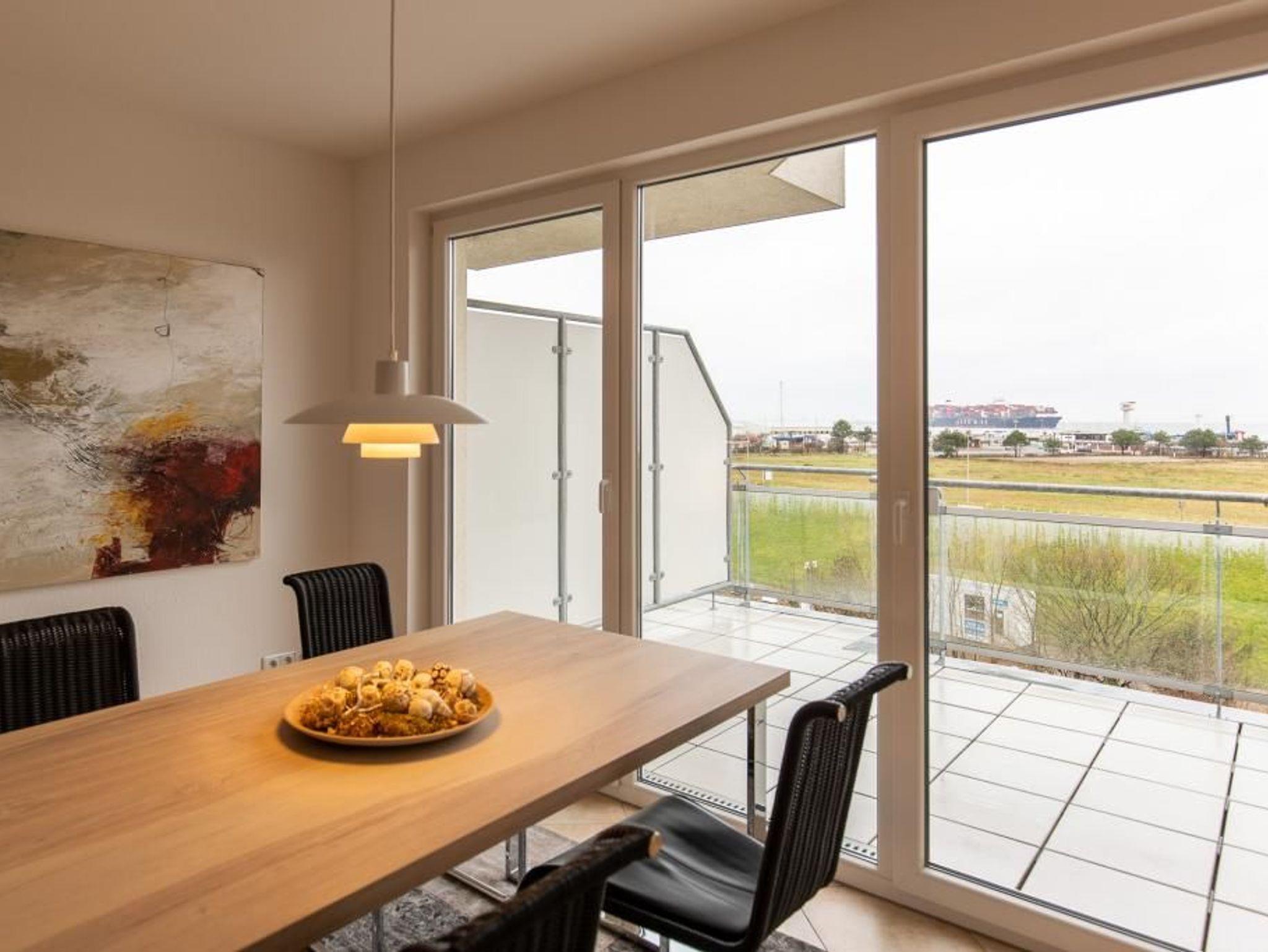 Moderne 3-Zimmer-Seesichtwohnung in Cuxhaven mit Balkon, Aufzug und Blick auf Yachthafen und Weltschifffahrtsweg.