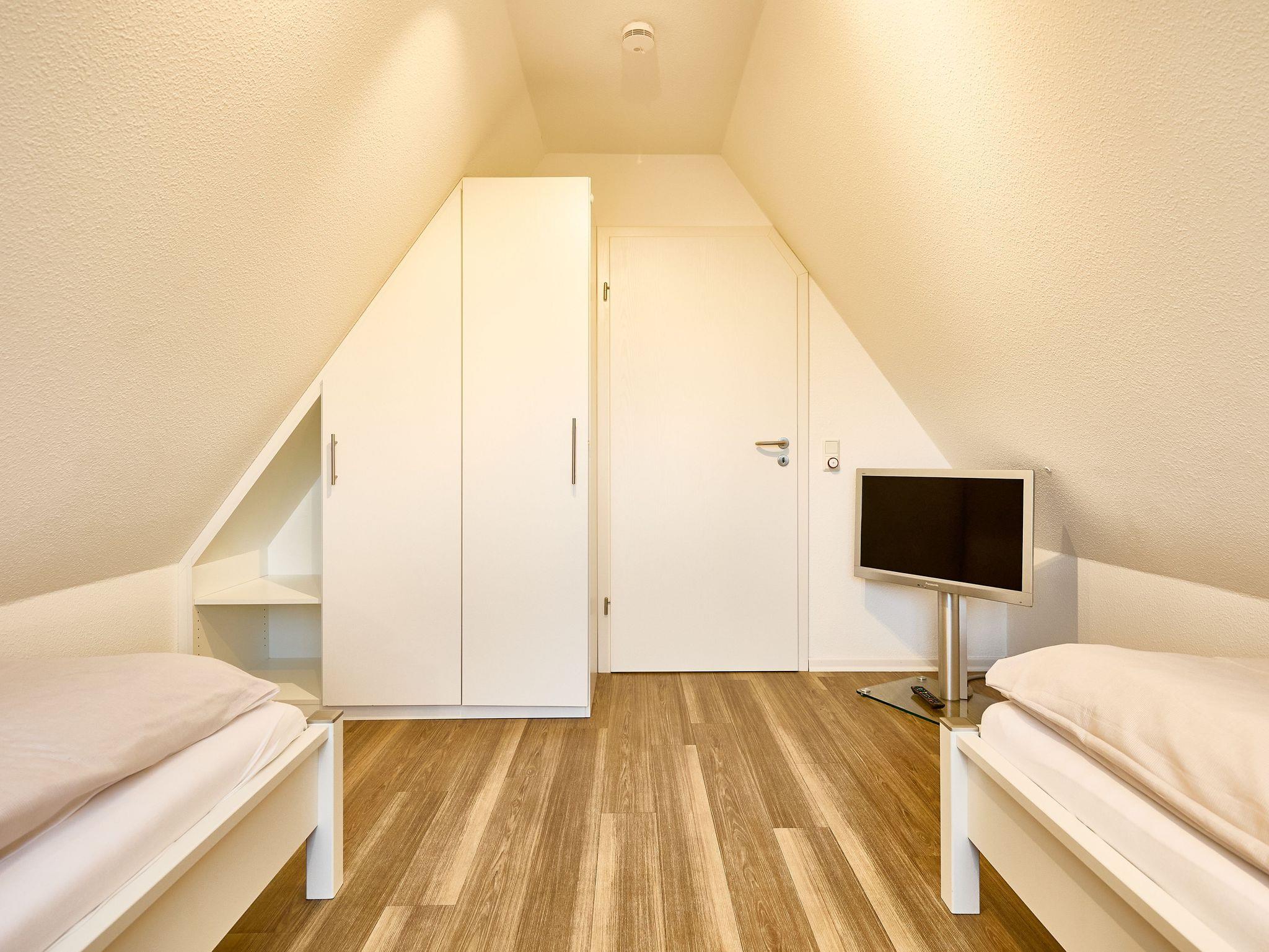 Des Weiteren beherbergt die Wohnung ein geräumiges und stilvolles Duschbad mit WC. Im Dachgeschoss erwartet Sie ein weiteres Schlafzimmer mit zwei Einzelbetten, ein modernes WC mit Waschtisch sowie eine gemütliche Leseecke, ein Schreibtisch mit Stuhl und kostenloser WLAN-Zugang für entspanntes Surfen im Internet. Die gesamte Wohnung ist mit einem bodenfreundlichen Belag ausgestattet, der auch Allergikern gerecht wird. In den beiden Schlafzimmern und im Wohnbereich sind hochwertige HD-TVs installiert.