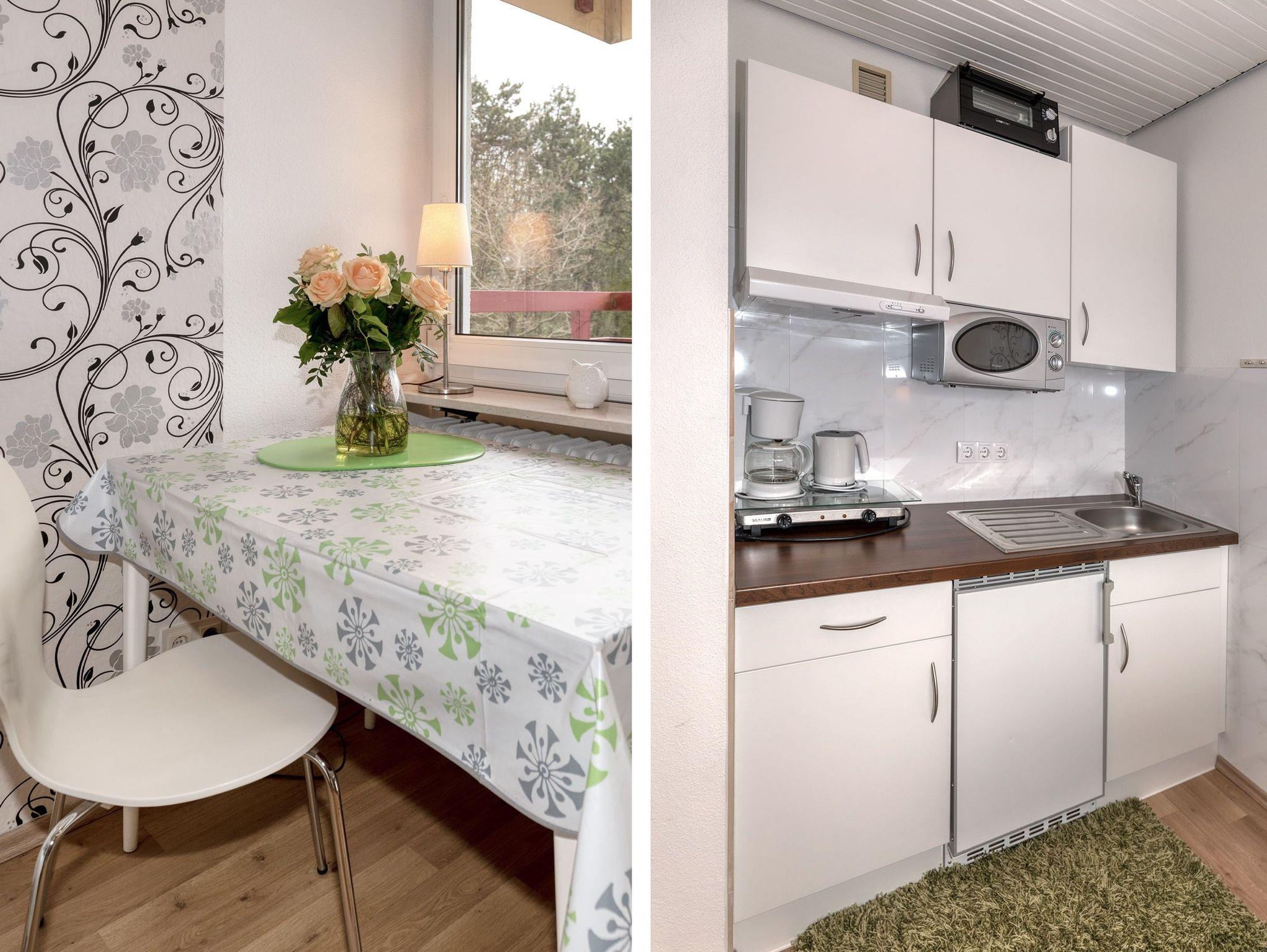 Das Appartement besteht aus einem Wohnbereich und eine Schlafnische mit zwei Einzelbetten für 2 Personen, eine voll ausgestattete integrierter Küche, einem Badezimmer mit Dusche sowie WC.
