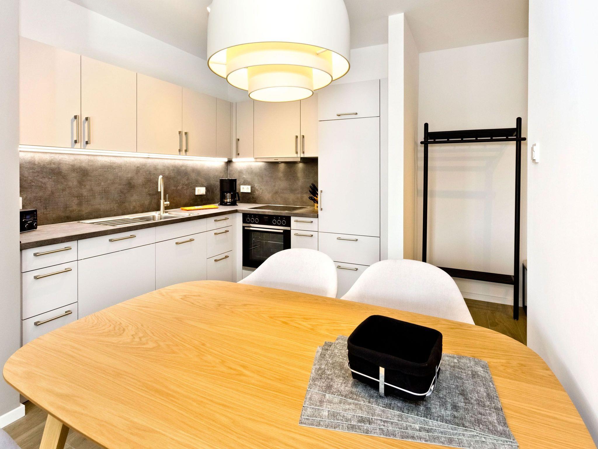 Vollausgestattete Küche (Geschirrspüler, Backofen, Ceranherd, Dunstabzug) Kühlschrank mit Gefrierfach.