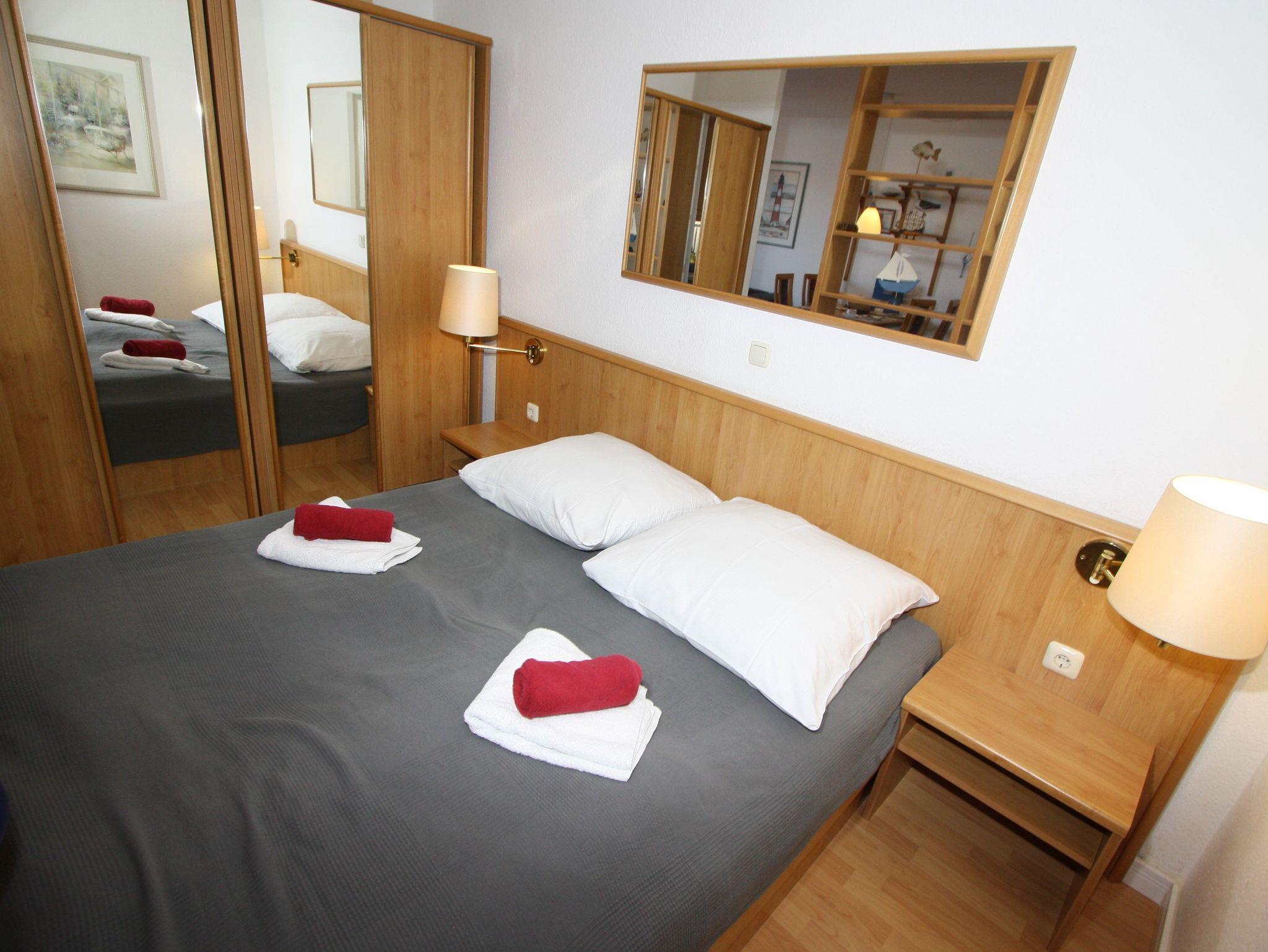 Sie wohnen in einem 2-Zimmer-Appartement für bis zu 4 Personen auf ca. 42 m² Wohnfläche im 2. Obergeschoss. Ein Schlafzimmer mit Etagenbetten, Wohn-/Schlafraum mit einem durch Raumteiler abgetrennten Doppelbett, separater Essplatz, voll ausgestatteter Küchenbereich mit Geschirrspüler, Dusche/WC, Balkon, SAT-Flachbild-TV und Telefon.