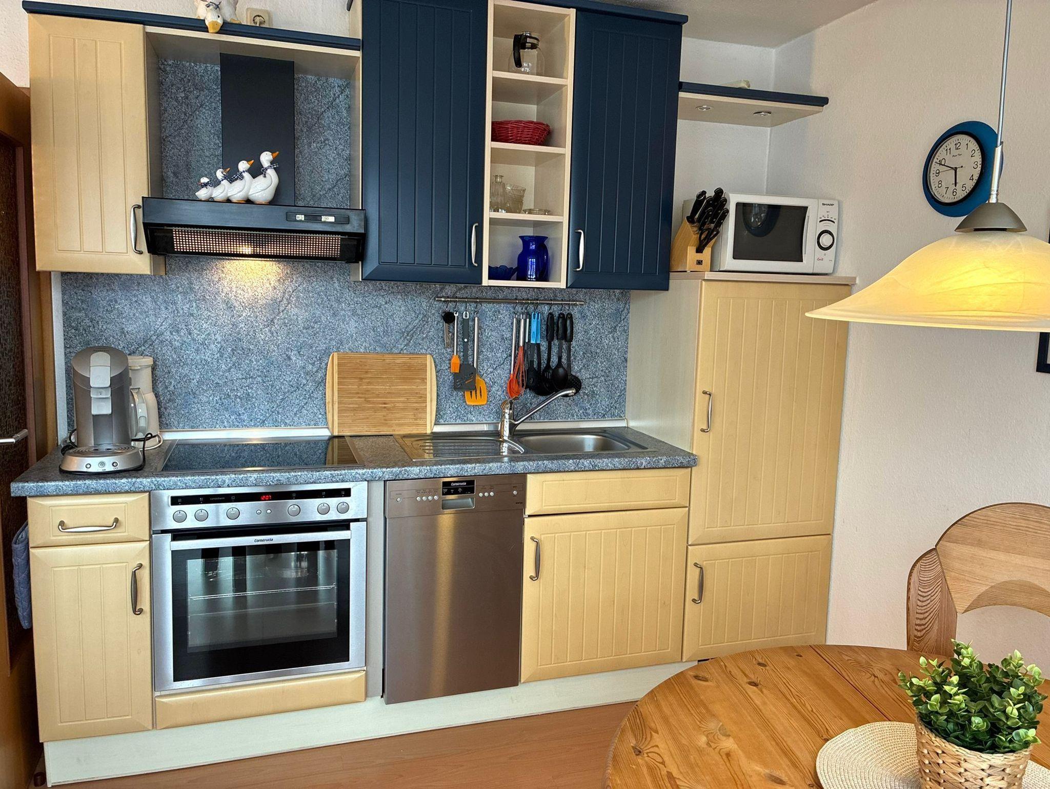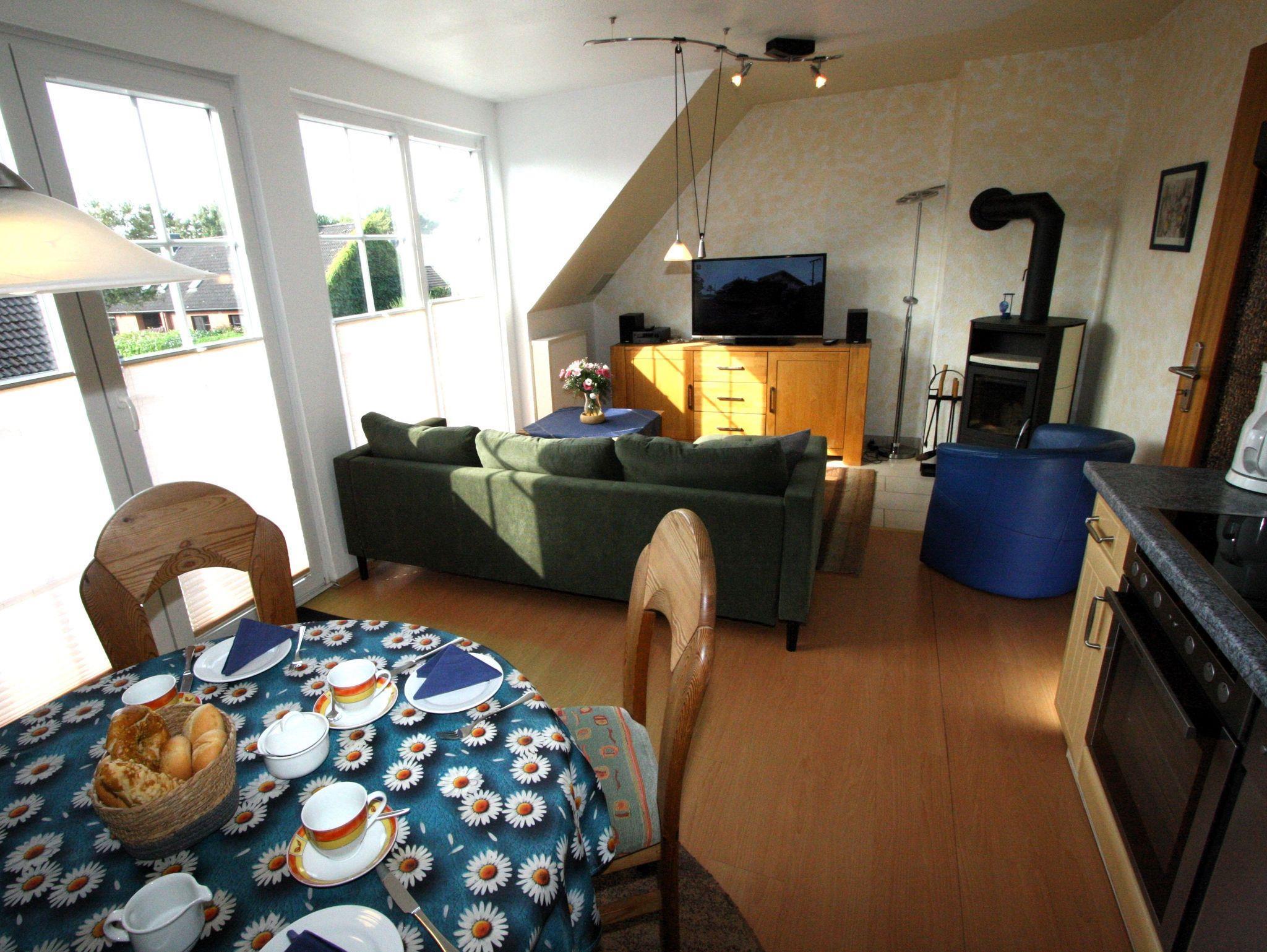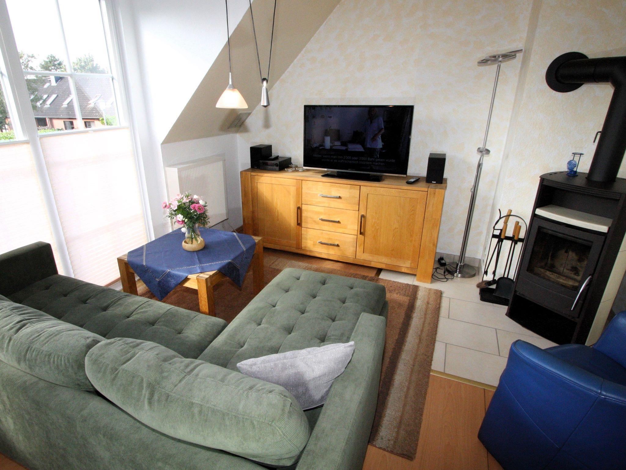 Sie verbringen Ihren Urlaub in einer liebevoll eingerichteten Ferienwohnung: heller Wohnraum mit Kaminofen, SAT-TV (Flat-TV), Stereoanlage mit CD/DVD-Player, Bluetooth, USB. Der Essbereich ist mit einer Küchenzeile ausgestattet (Spülmaschine, Herd mit Ceranfeld, Backofen mit Umluft, Mikrowelle, Kaffeemaschine, Senseo-Kaffeeautomat). Sie finden außerdem gebräuchliche Küchengeräte wie Wasser-, Eierkocher, Pürierstab, Messerblock, Küchenhelfer und Besteck in ausreichender Menge. Für gesellige Abende liegen Spiele für Groß und Klein bereit. Außerdem finden Sie eine Gästemappe mit Ausflugstipps in und rund um Cuxhaven (mit Fahrradkartenteil). Beide Schlafzimmer verfügen über jew. ein Doppelbett, ein Boxspringbett und ein franz. Bett (140 cm x 200 cm). Zusätzlich befindet sich im 2. Schlafzimmer (oder Kinderzimmer) ein weiterer Flat-TV.