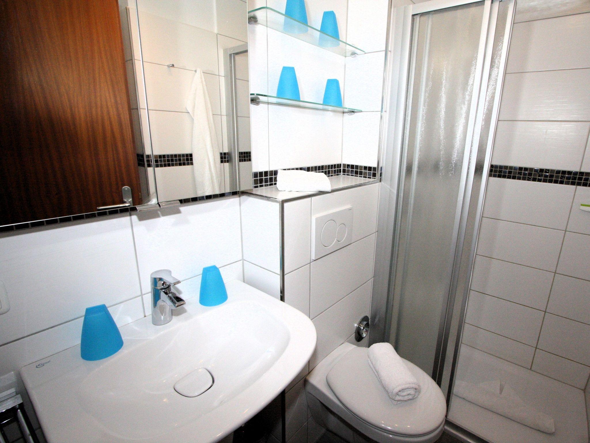 Im neuen exklusiv gestalteten Bad verwöhnt Sie eine Fußbodenheizung und Dusche mit ebenem Einstieg und Regenbrause.