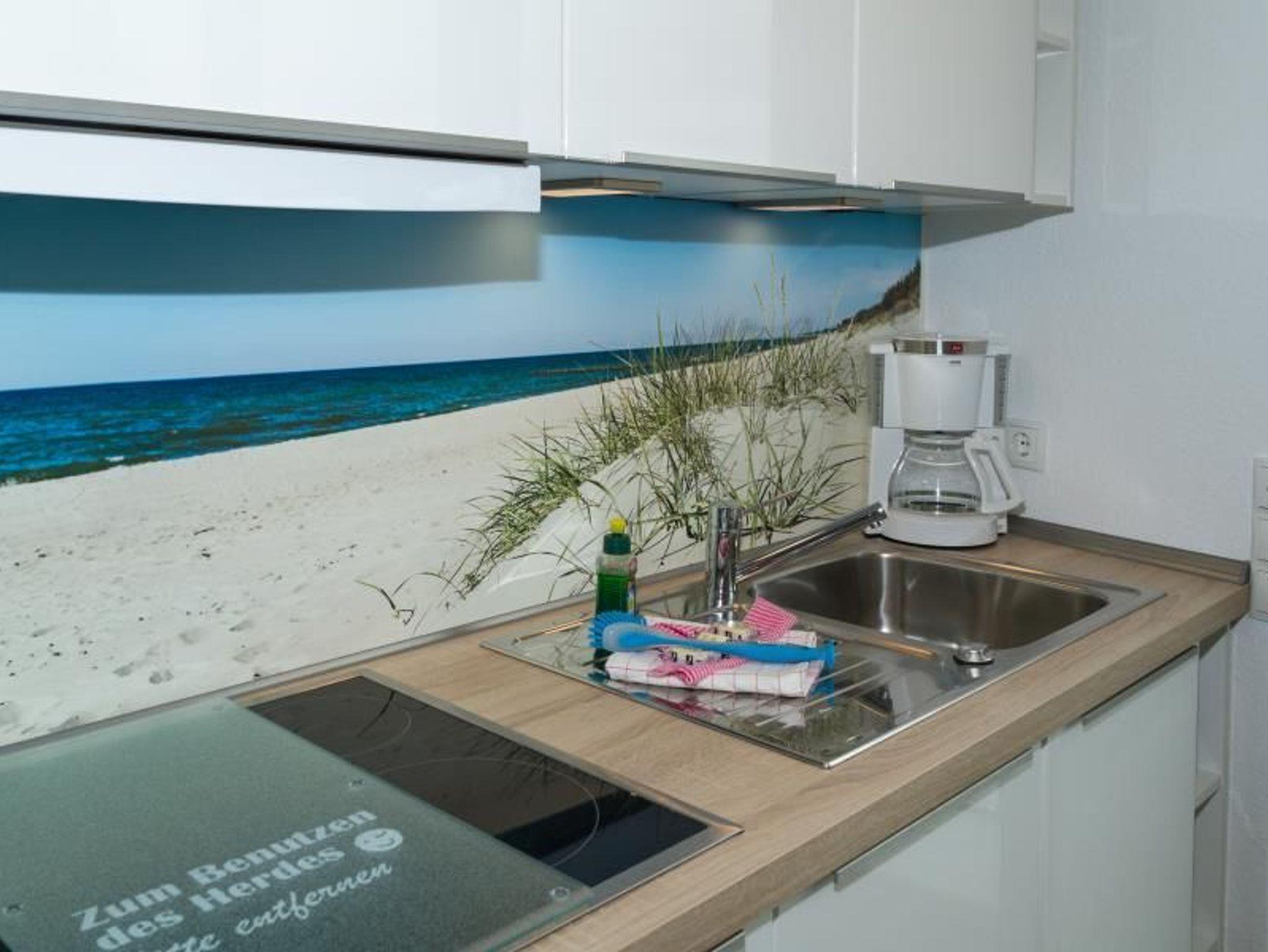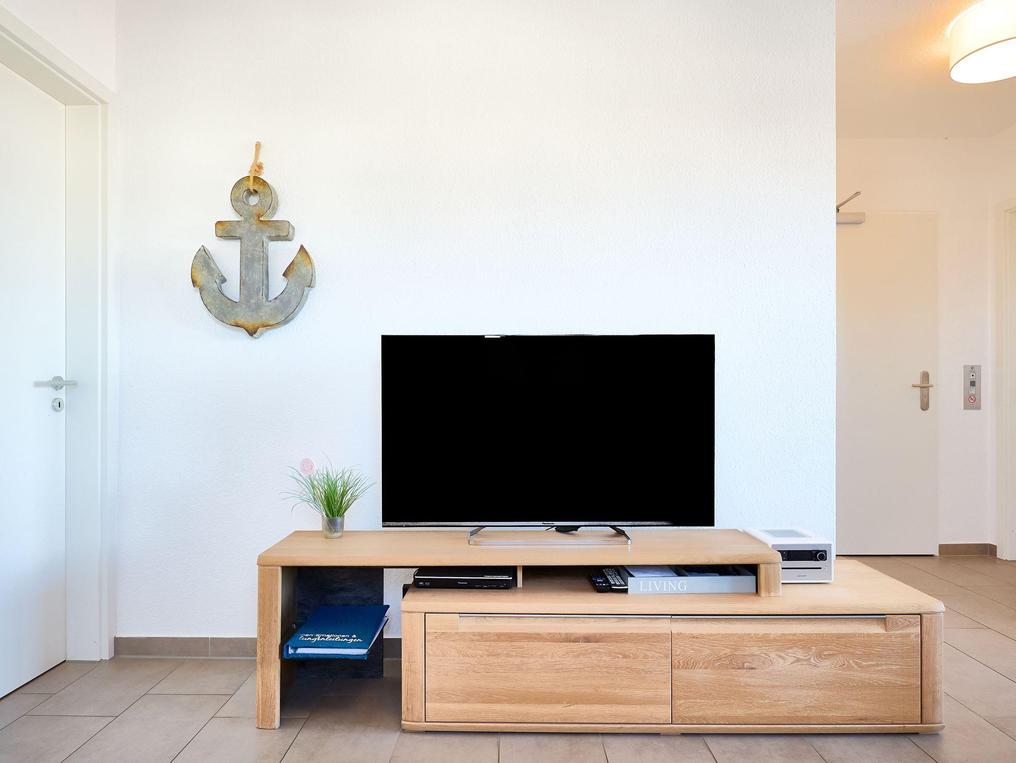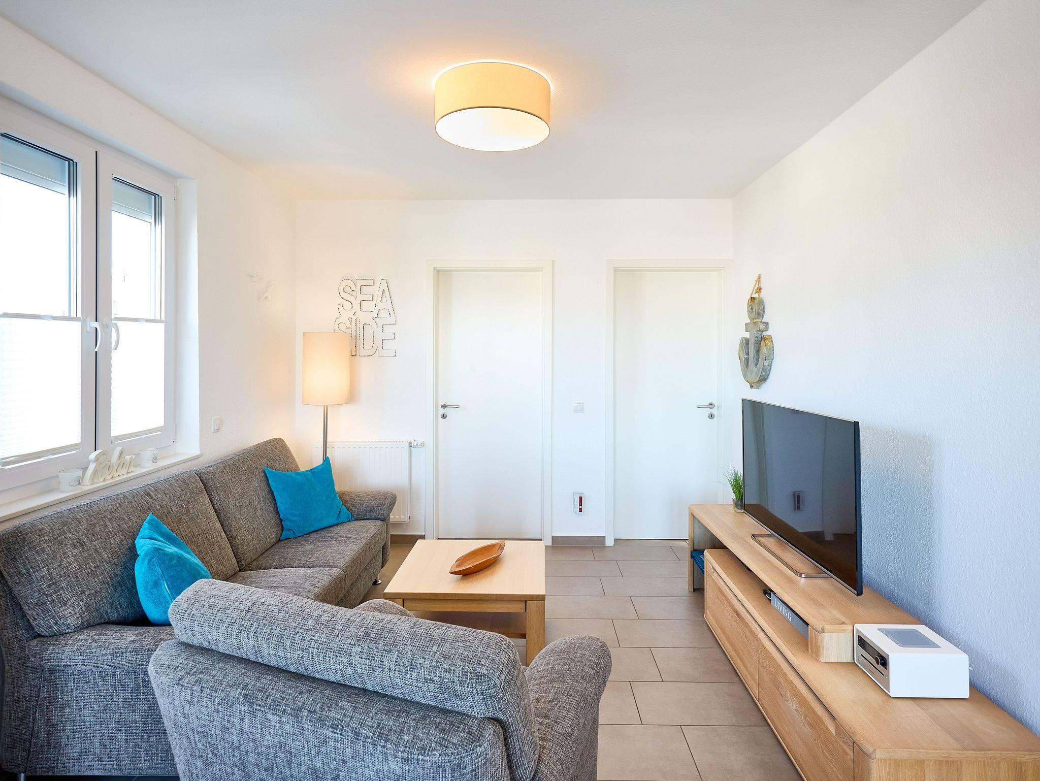 Die hochwertig ausgestattete 3-Zimmer-Wohnung überzeugt mit ihrem durchdachten Design, das auch auf die Bedürfnisse von Familien mit kleinen Kindern abgestimmt ist. So stehen unter anderem eine Wickelunterlage, ein WC-Sitz sowie Kindergeschirr bereit. Für die Kleinen sorgen Kinderbücher und Spielsachen an trüben Tagen für Unterhaltung. Der helle Wohnbereich ist mit einer komfortablen Couchgarnitur, einem Flatscreen-TV, einem Blu-Ray-Player und einer Bluetooth-fähigen Soundanlage ausgestattet, über die Sie Ihre eigene Musik abspielen können. An die Essecke schließt sich die offene Einbauküche an, die mit einem Ceranfeld, einer Backofen-/Mikrowellenkombination und einem Geschirrspüler keine Wünsche offenlässt. Eine Filter-Kaffeemaschine und ein Eierkocher gehören ebenfalls zur Ausstattung.