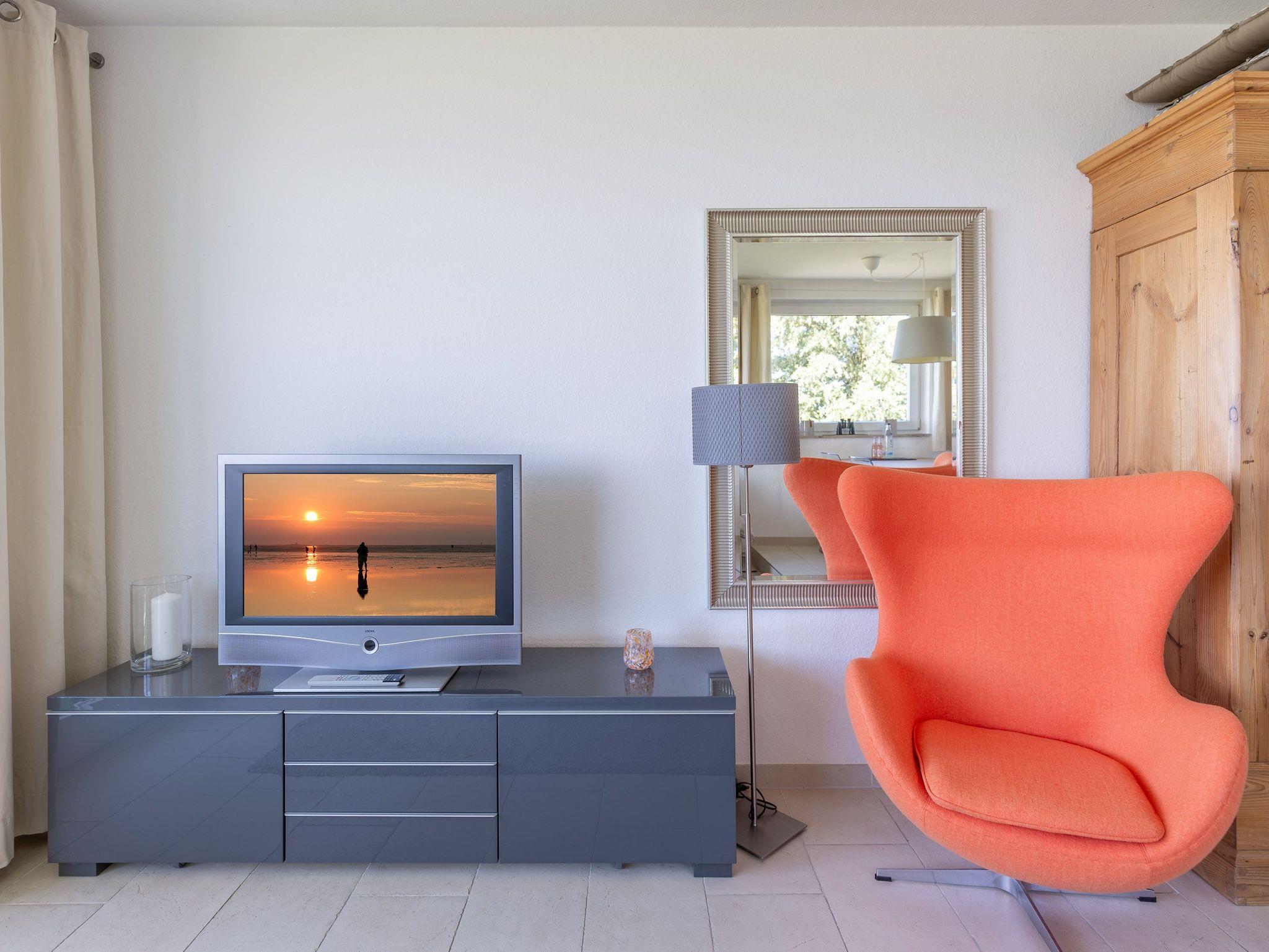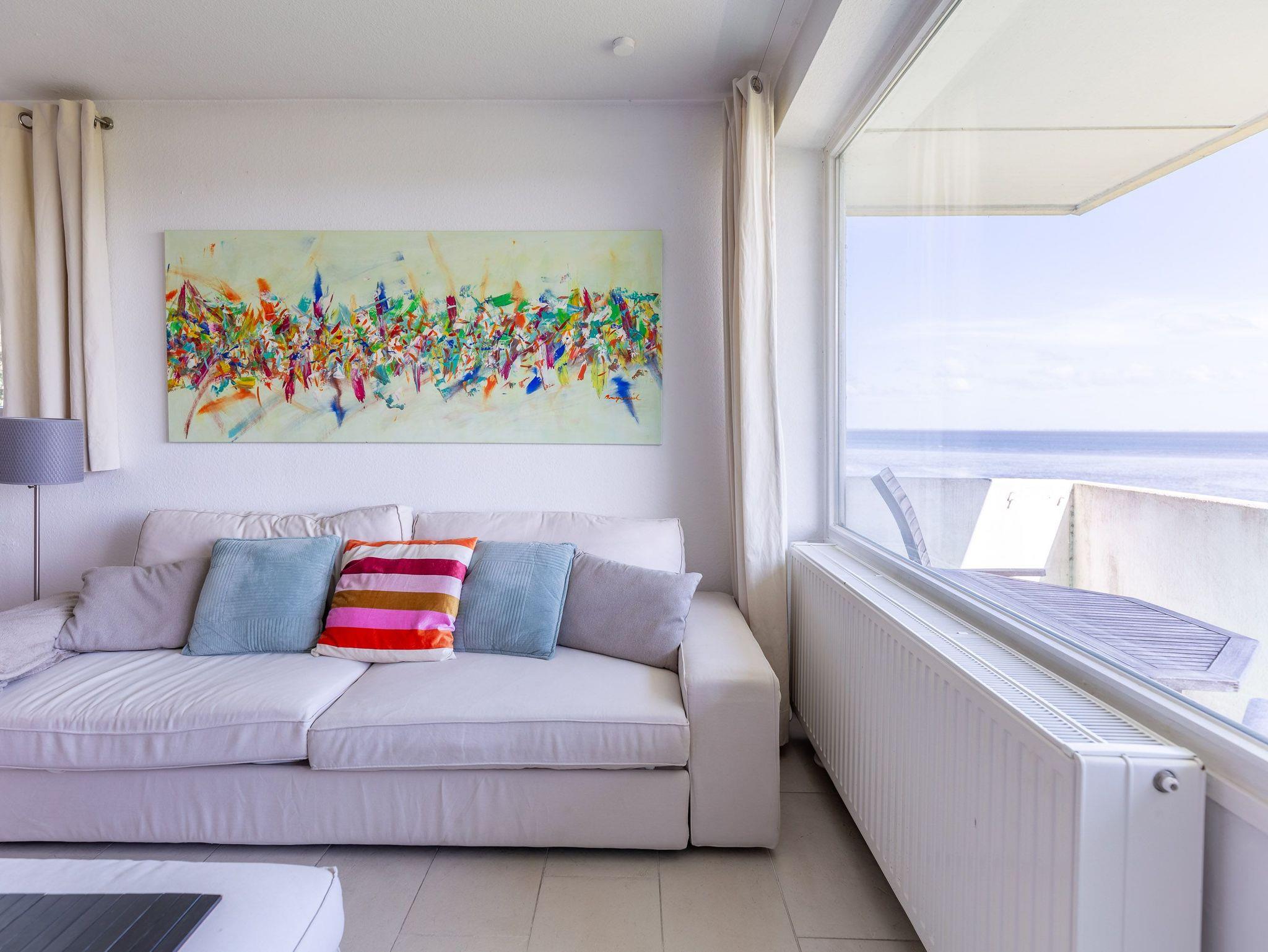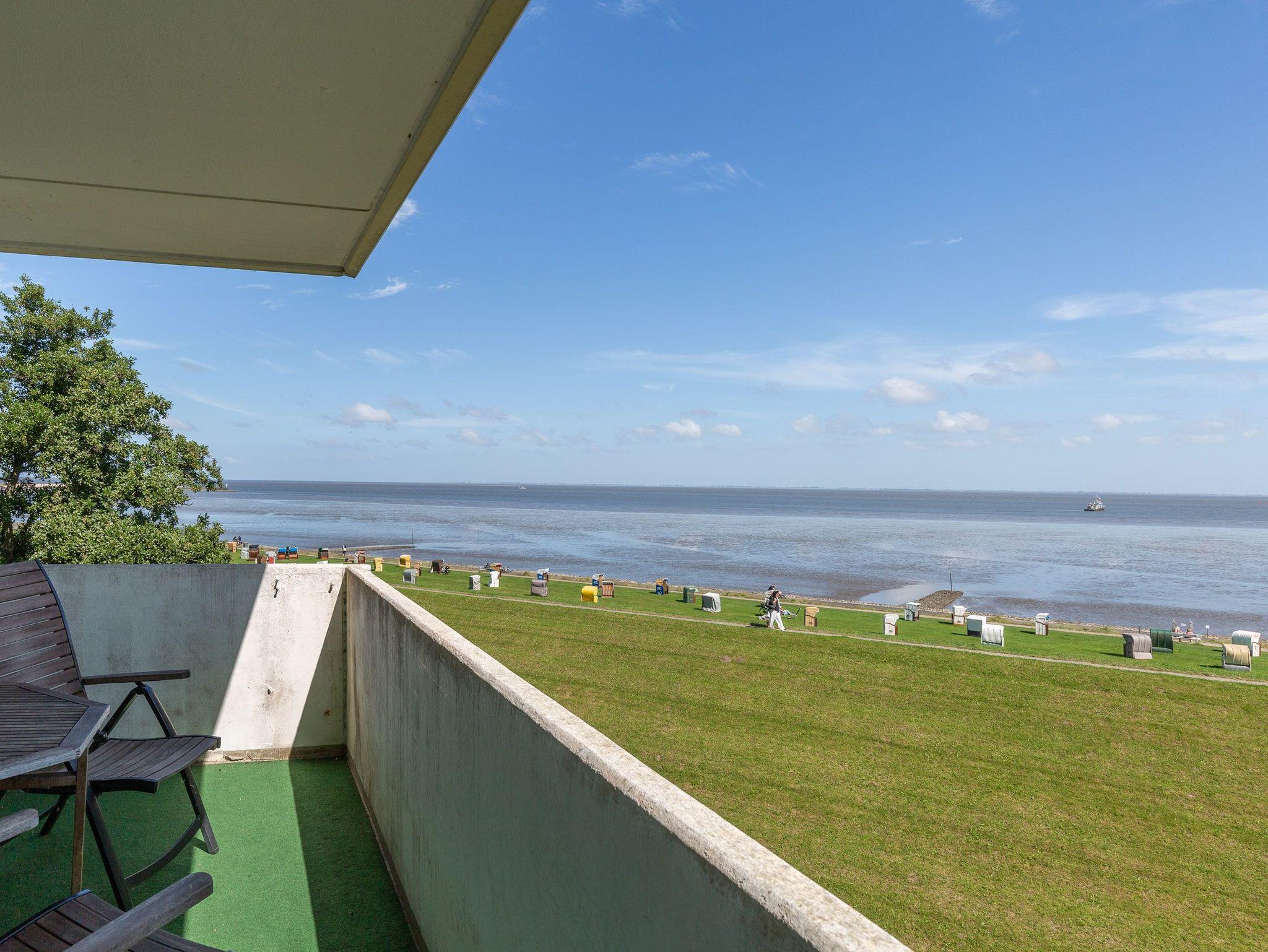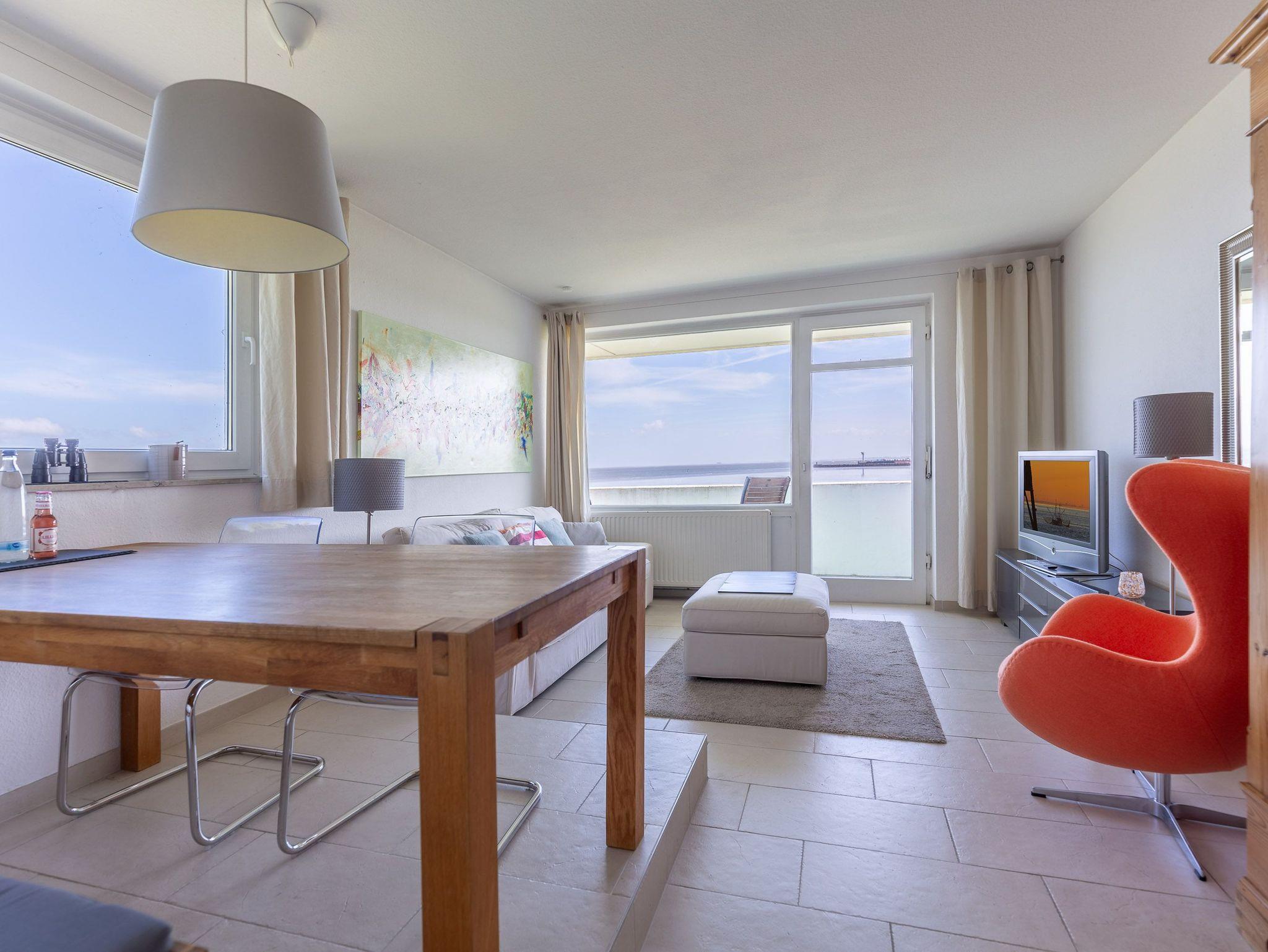 Nach einem erlebnisreichen Tag können Sie am Esstisch auf der Empore relaxen - durch den erhöhten Sitzbereich lassen sich die vorbeifahrenden Ozeanriesen besonders gut beobachten. Der kombinierte Wohn- und Schlafbereich bietet ein ausziehbares Schlafsofa. In der Diele befindet sich ein weiteres Schlafsofa, welches getrenntes Schlafen ermöglicht. Kostenloses WLAN und ein Flachbildfernseher sorgen für beste Unterhaltung. Die separate Küche mit Fenster lässt für Selbstversorger keine Wünsche offen und ist mit einem 4 Plattenherd, einem Backofen und einem Geschirrspüler ausgestattet. Das modern sanierte Bad mit Dusche und WC verfügt über ein Fenster zum Belüften. Auch der Balkon bietet einen spektakulären Meerblick.