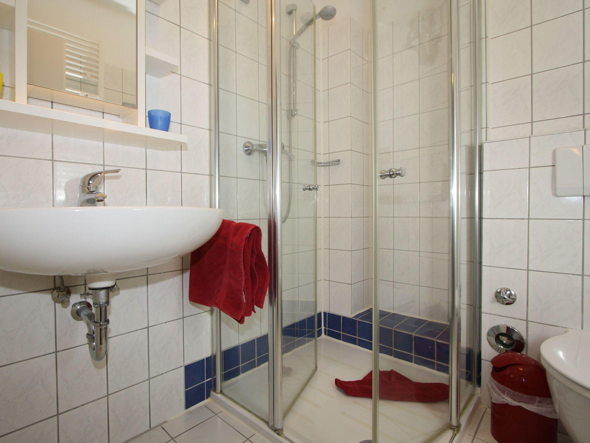 Duschbad mit flacher Duschtasse, mit WC, Haartrockner und Handtuchheizung. Abschließbarer Schrank,