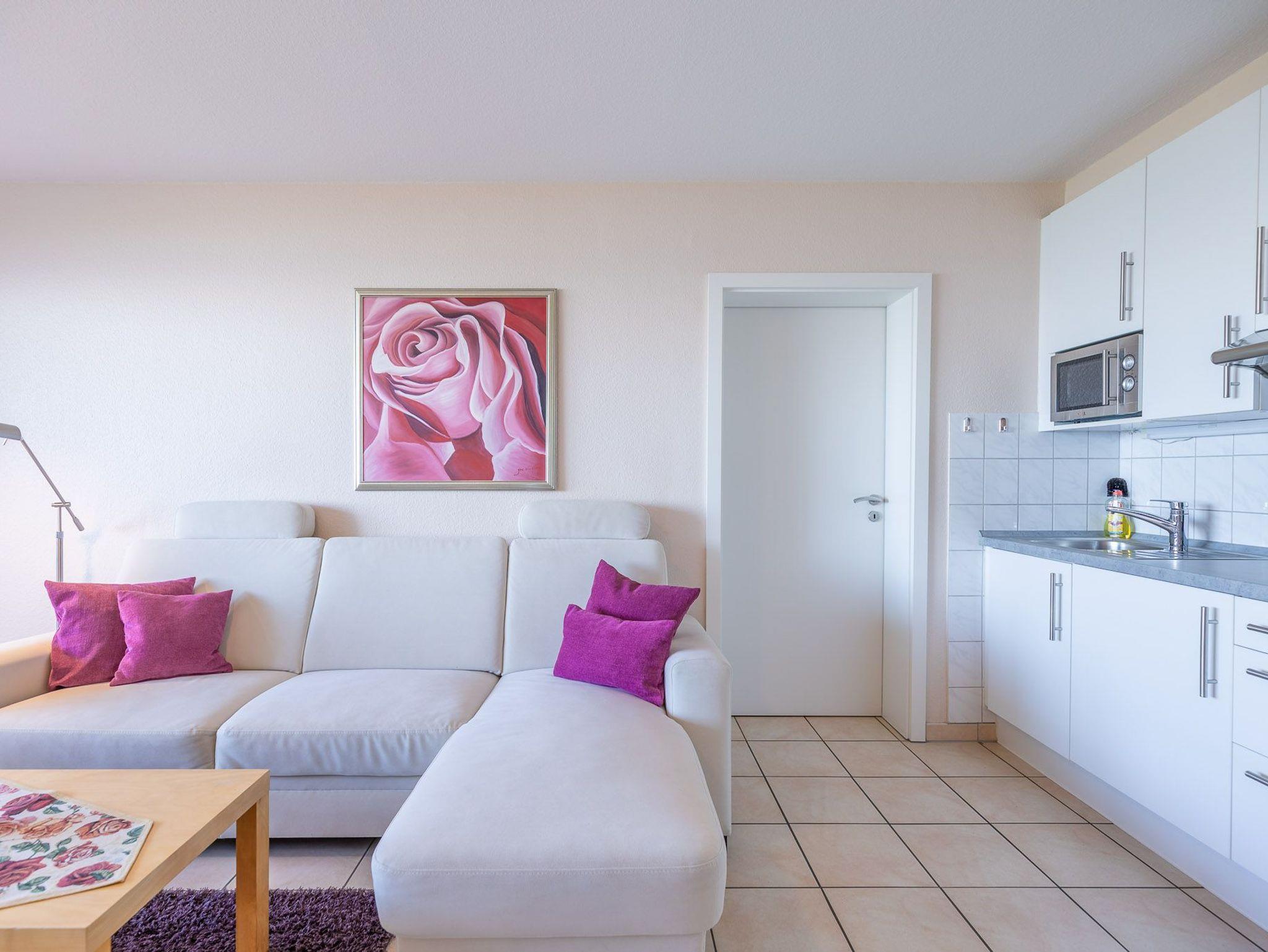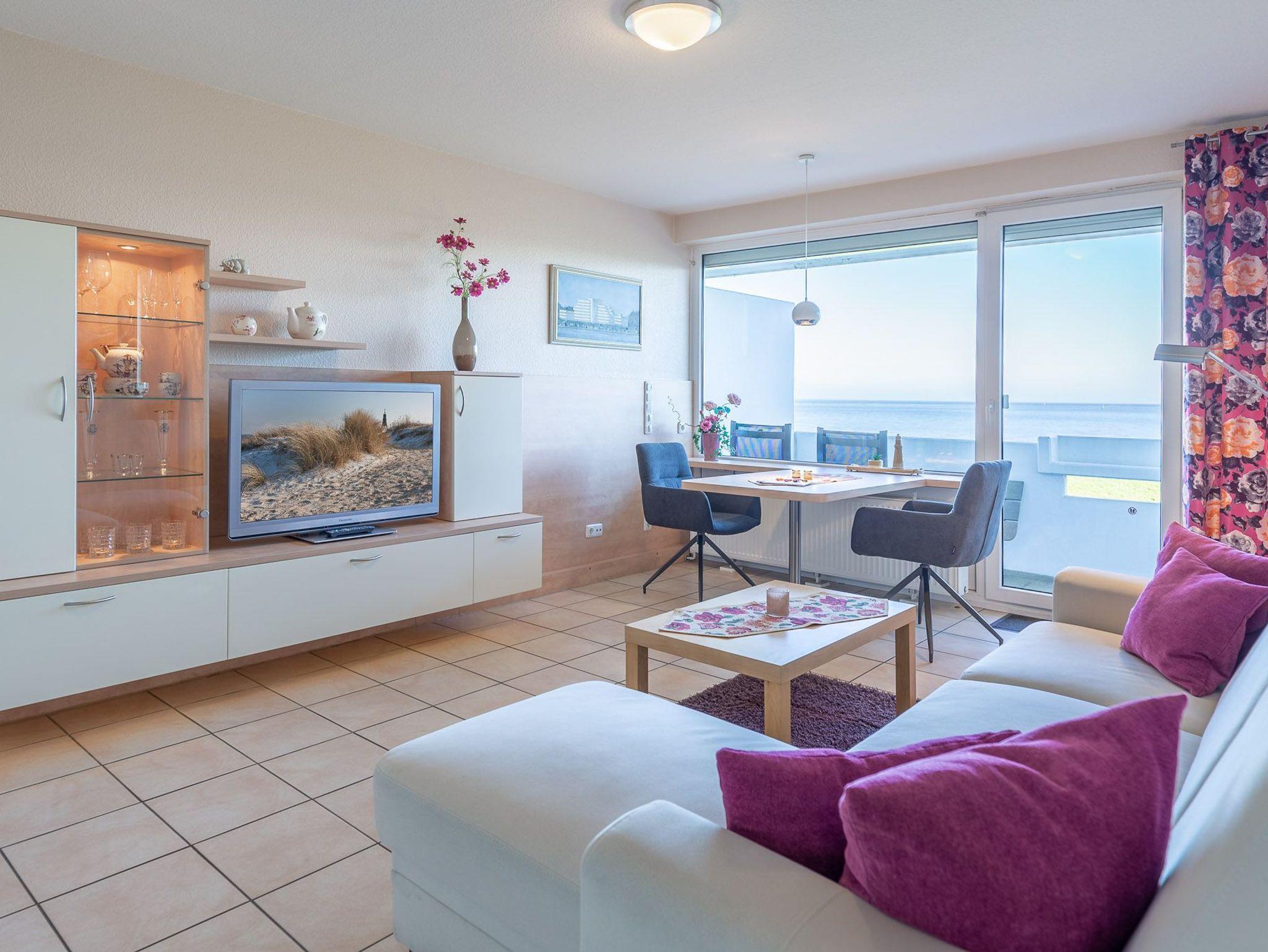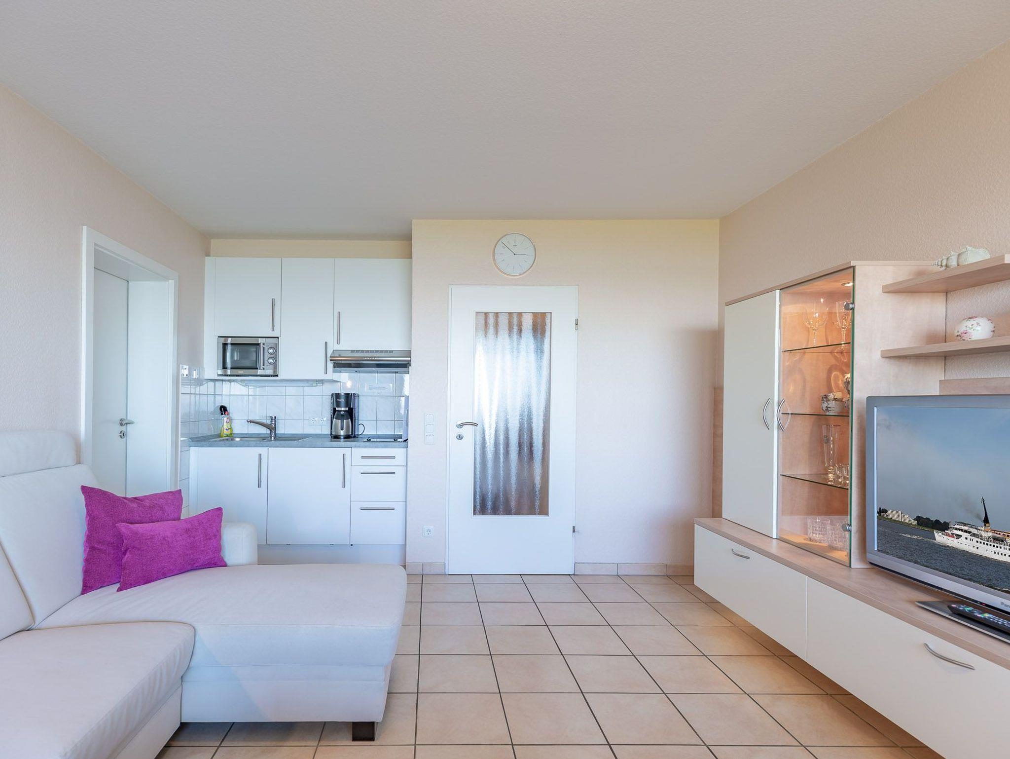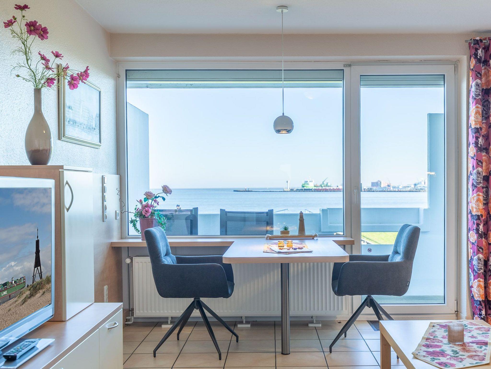 Egal ob Sie am Esstisch, auf dem Ecksofa oder auf dem Balkon sitzen, immer genießen Sie den fantastischen Blick auf den Weltschifffahrtsweg, die Grimmershörnbucht und den Hafen. Ein großer Flachbildfernseher sorgt dafür, dass Sie auch im Urlaub nicht auf die Sportschau oder Ihre Lieblingsserie verzichten müssen. Eine Küchenzeile ist im Wohnbereich integriert. Selbstverständlich genießen Sie auch vom möblierten Balkon den atemberaubenden Meerblick, der mehr als beeindruckt. Zur Ferienwohnung gehört ein modernes Bad mit Dusche und WC.