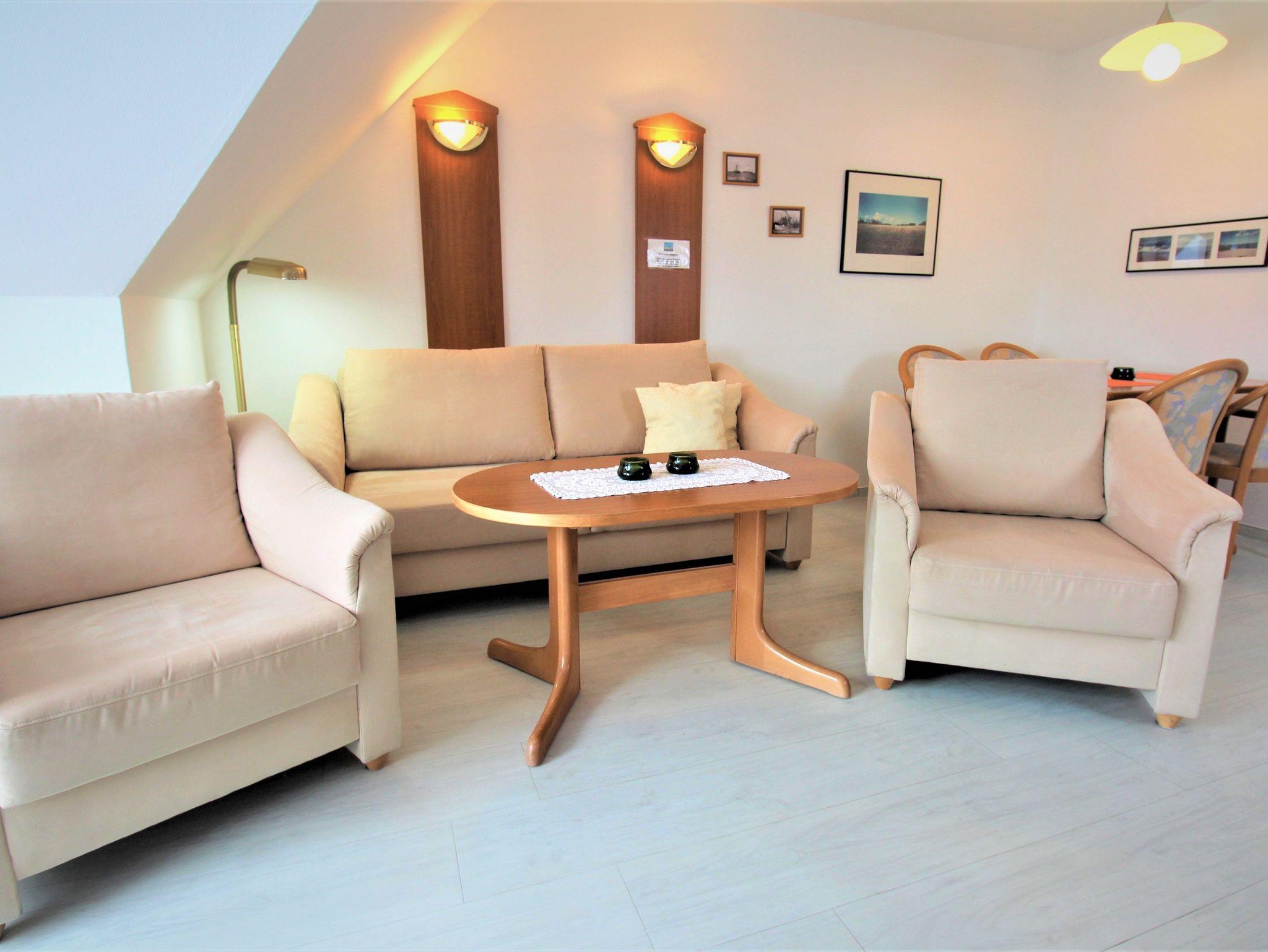 - Wohnraum mit bequemer Doppelbettcouch und separatem Eßplatz
