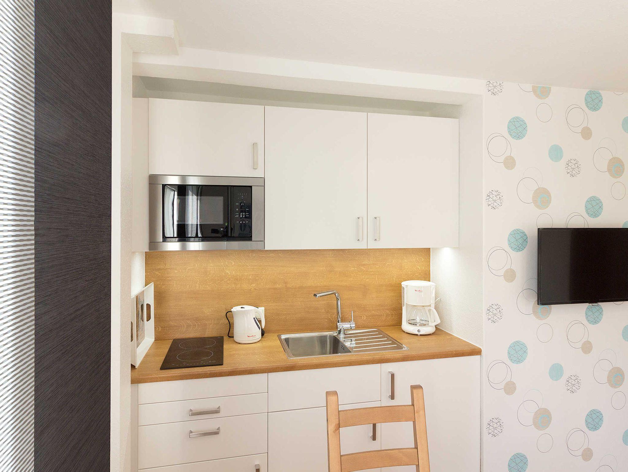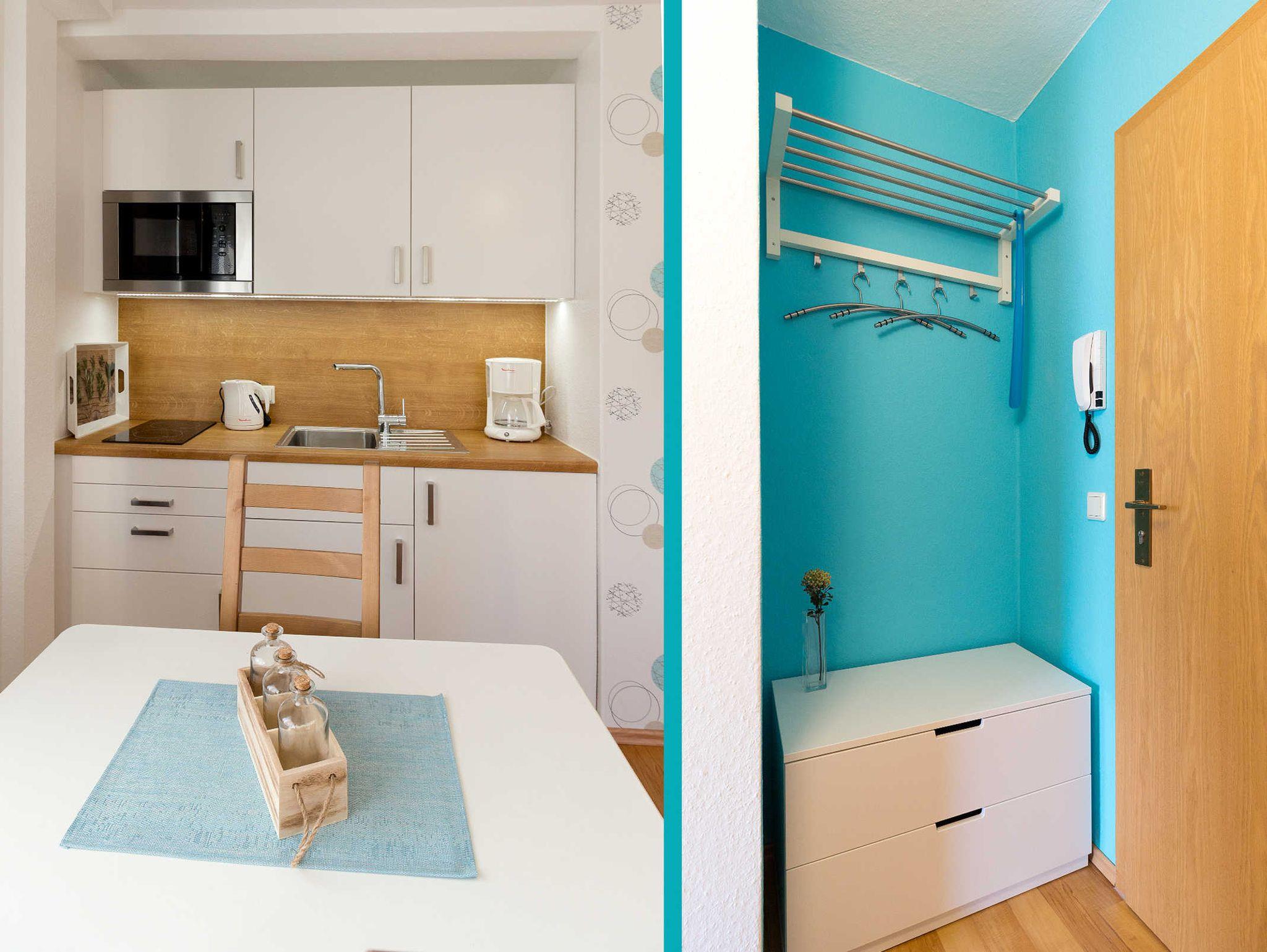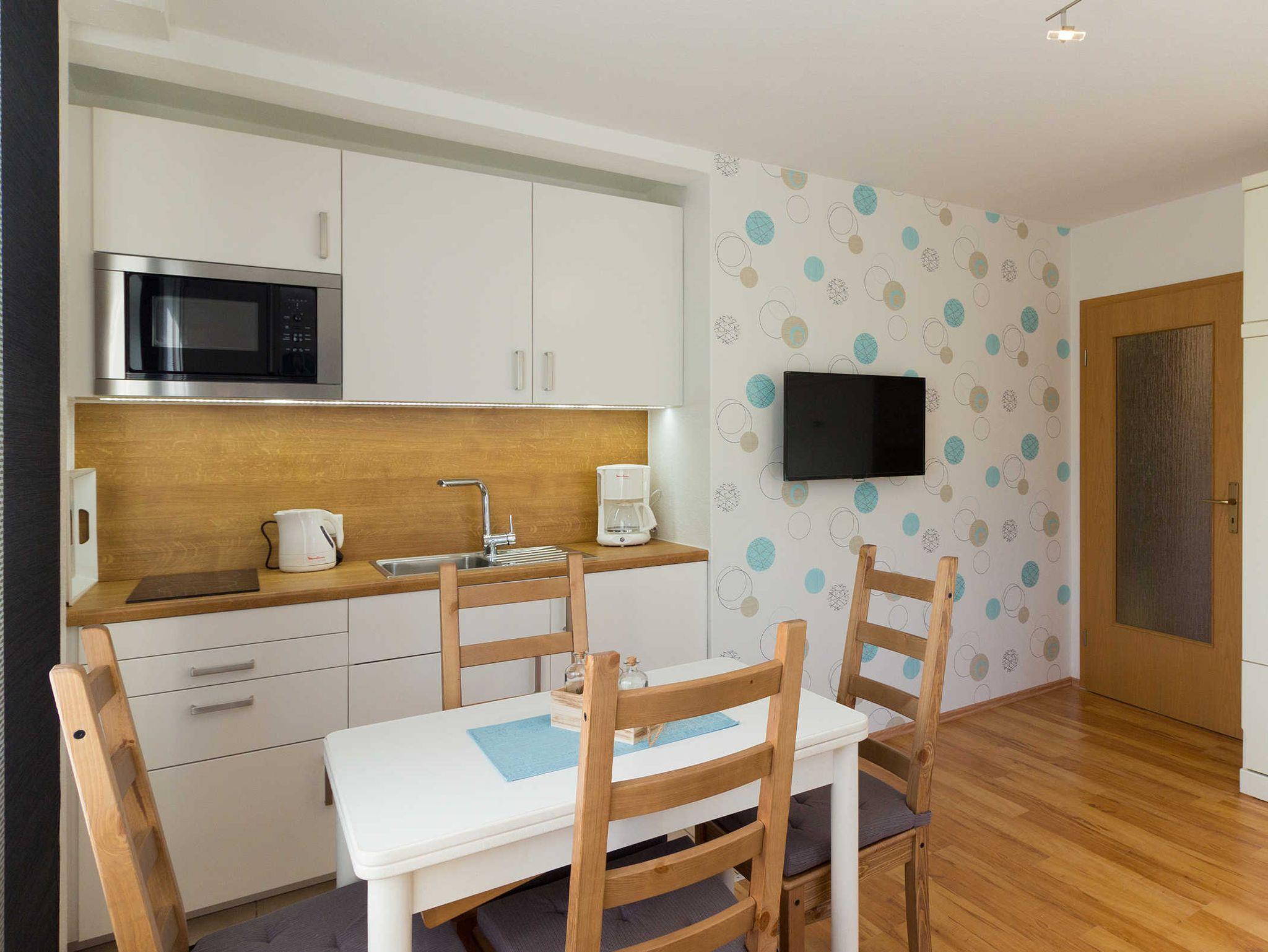 Die Küchenzeile ist mit einem großen Kühlschrank mit Gefrierfach sowie einer Mikrowelle und einem Induktionskochfeld ausgestattet. Außerdem bietet die Küche vom Eierlöffel bis zur Kaffeemaschine; Toaster; Wasserkocher alles, was für eine unbeschwerte Urlaubszeit nötig ist.