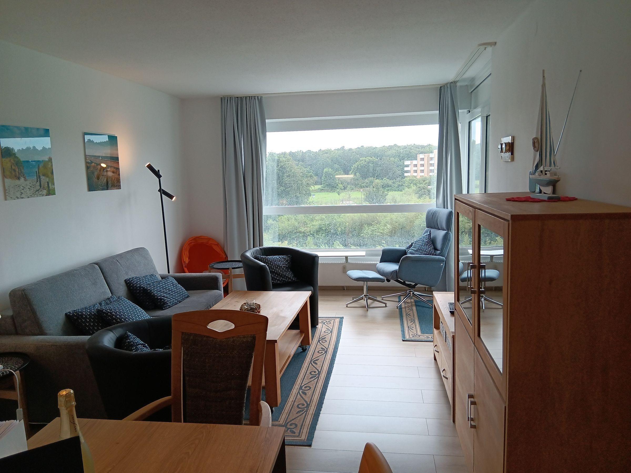 Die Ferienwohnung im Kurteil Sahlenburg bietet Platz für bis zu 5 Personen und überzeugt durch ihre gemütliche Einrichtung. Der Schlafraum ist mit 3 Einzelbetten ausgestattet, während im Wohnzimmer eine Schlafcouch für 2 weitere Personen bereitsteht. Eine Kinderecke sorgt für Unterhaltung der jüngeren Gäste. Die Leseecke am Fenster lädt dazu ein, in Ruhe zu entspannen. Die Küche sowie der Essbereich sind funktionell gestaltet und gut ausgestattet. Das moderne Bad rundet das Angebot ab. Gemeinschaftliche Freizeitmöglichkeiten wie ein hauseigenes Schwimmbad, eine Sauna sowie ein Tennisplatz und Tischtennis sind vorhanden. Von Balkon und Panoramafenster eröffnet sich ein schöner Teil-Seesicht auf den Wernerwald und das Sahlenburger Wattenmeer. Hinweis: Saisonbedingt kann das Schwimmbad geschlossen sein.