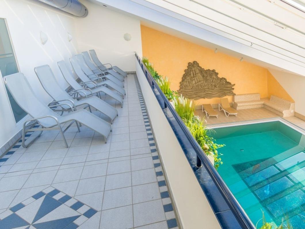 Das helle und einladende Schwimmbad befindet sich im 1. Stock und steht allen Gästen des Hauses kostenlos zur Verfügung. Neben dem 12,5m Schwimmbecken mit Massagedüse und künstlichem Wasserfall befindet sich ein beheizter Whirlpool.