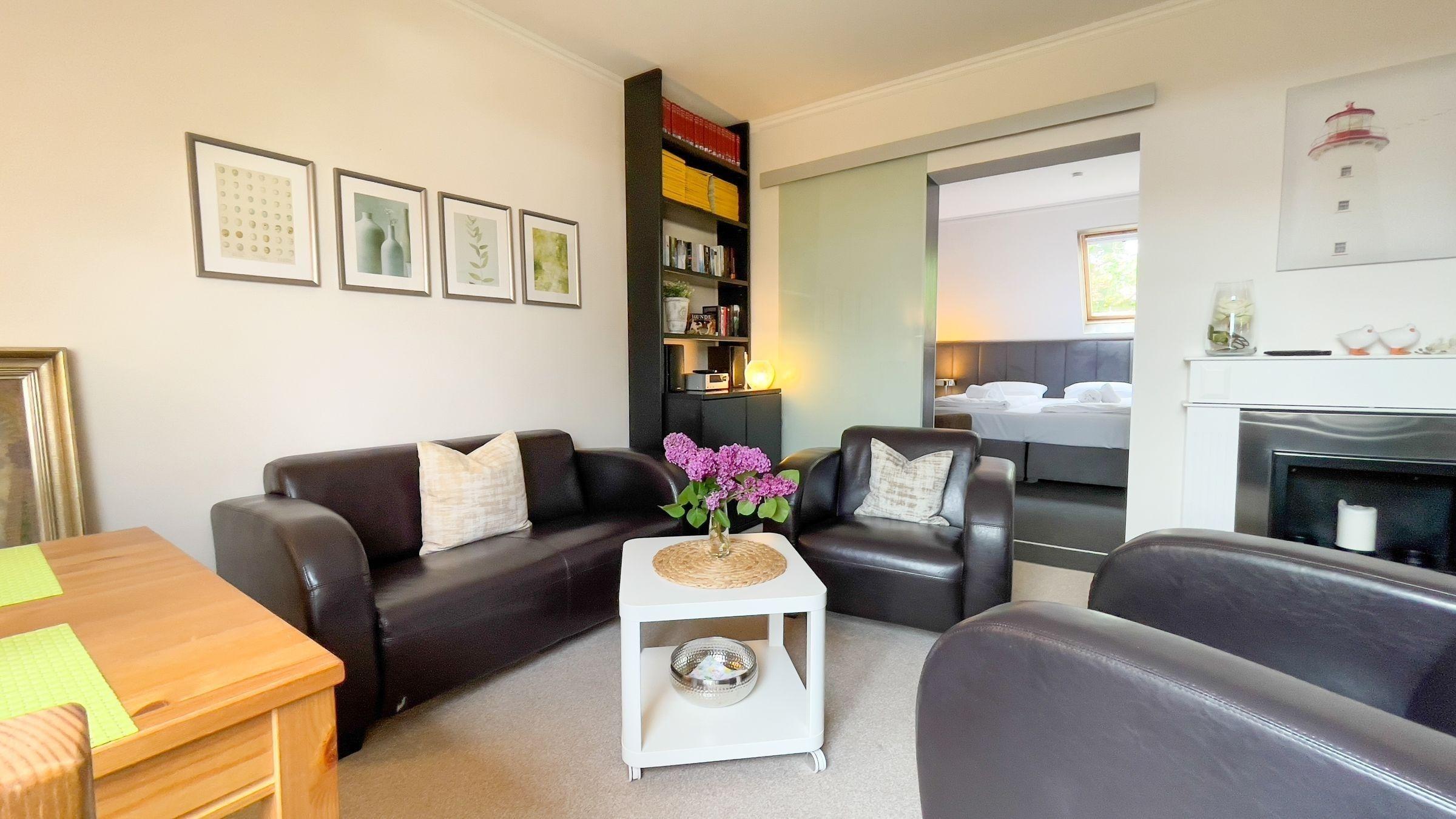 Helle Ferienwohnung in Duhnen, nur wenige Schritte vom Sandstrand, mit moderner Ausstattung und Haustieren erlaubt.
