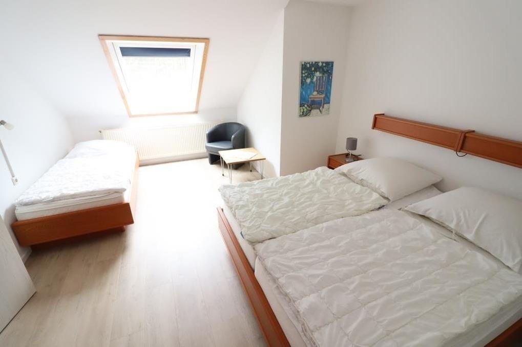 Schöne Ferienwohnung mit einem Schlafraum mit Doppelbett 1,80mx2m, einem Schlafraum mit Doppelbett 1,80mx2m und 1 Einzelbett 0,90mx2m, 1 Wohnraum mit Sofa, Küchenzeile mit Backofen, Kühlschrank, Gefrierfach und Spülmaschine, TV, Dusche /WC