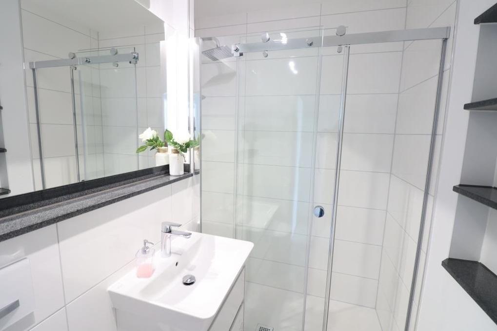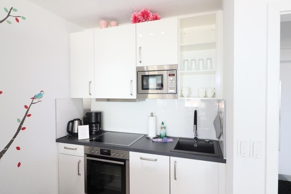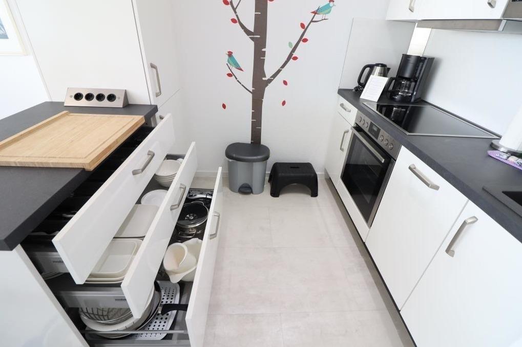 Exklusiv renovierte Ferienwohnung mit einem Schlafraum mit Doppelbett 1,80mx2m, 1 Wohnraum mit Schlafsofa (1,40mx2,00), Küchenzeile mit Backofen, Kühlschrank, Gefrierschrank, Spülmaschine und Mikrowelle, 2xSmart-TV, DU/WC