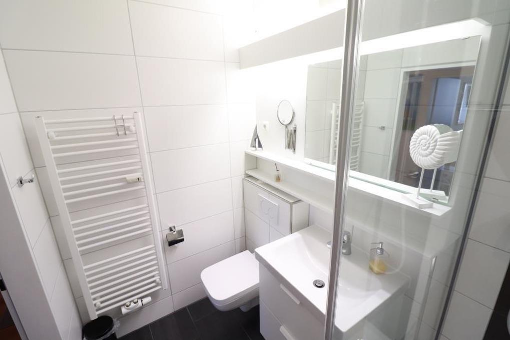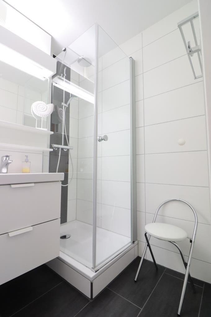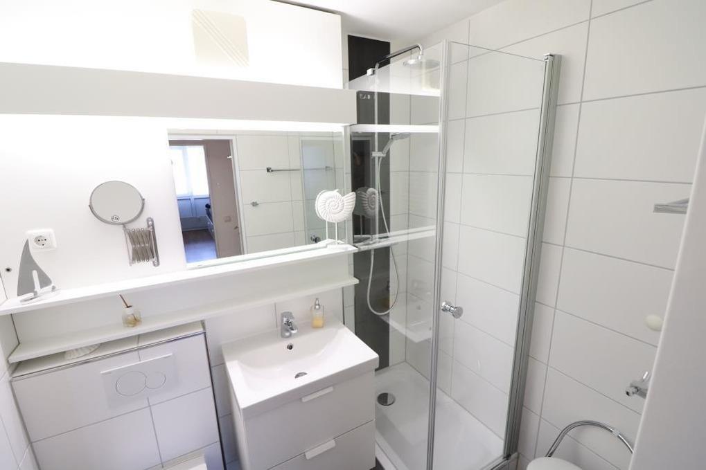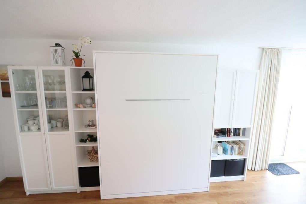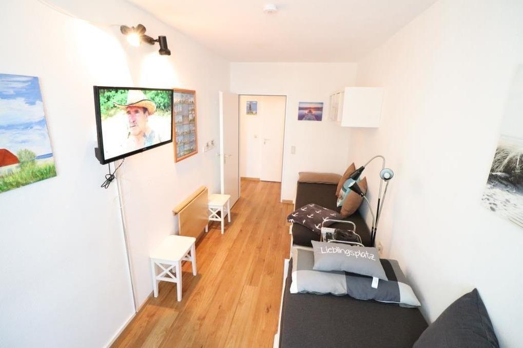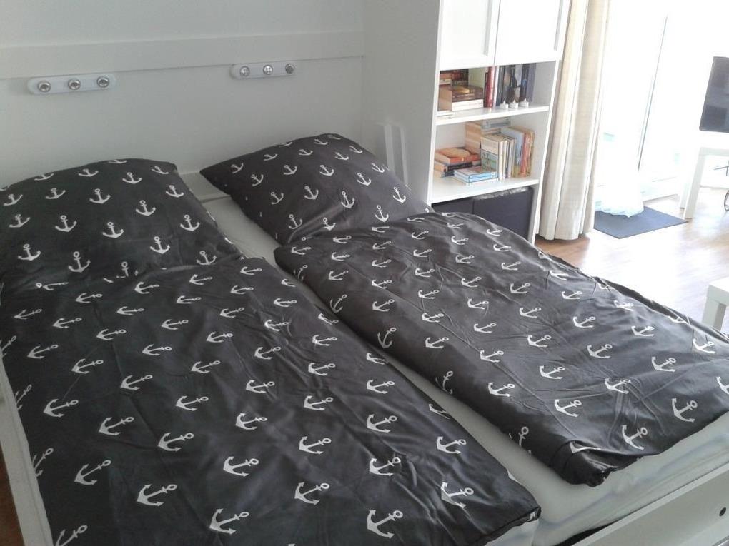 Gemütliche Ferienwohnung "Kleine Muschel" mit einem Schlafraum mit zwei Einzelbetten (davon 1x zum Doppelbett ausziehbar 1,60x2m), 1 Wohnschlafraum mit Schrankbett (1,60mx2m), Küchenzeile mit Backofen, Kühlschrank, Gefrierfach, Spülmaschine und Mikrowelle, 2xTV, Dusche /WC, Föhn