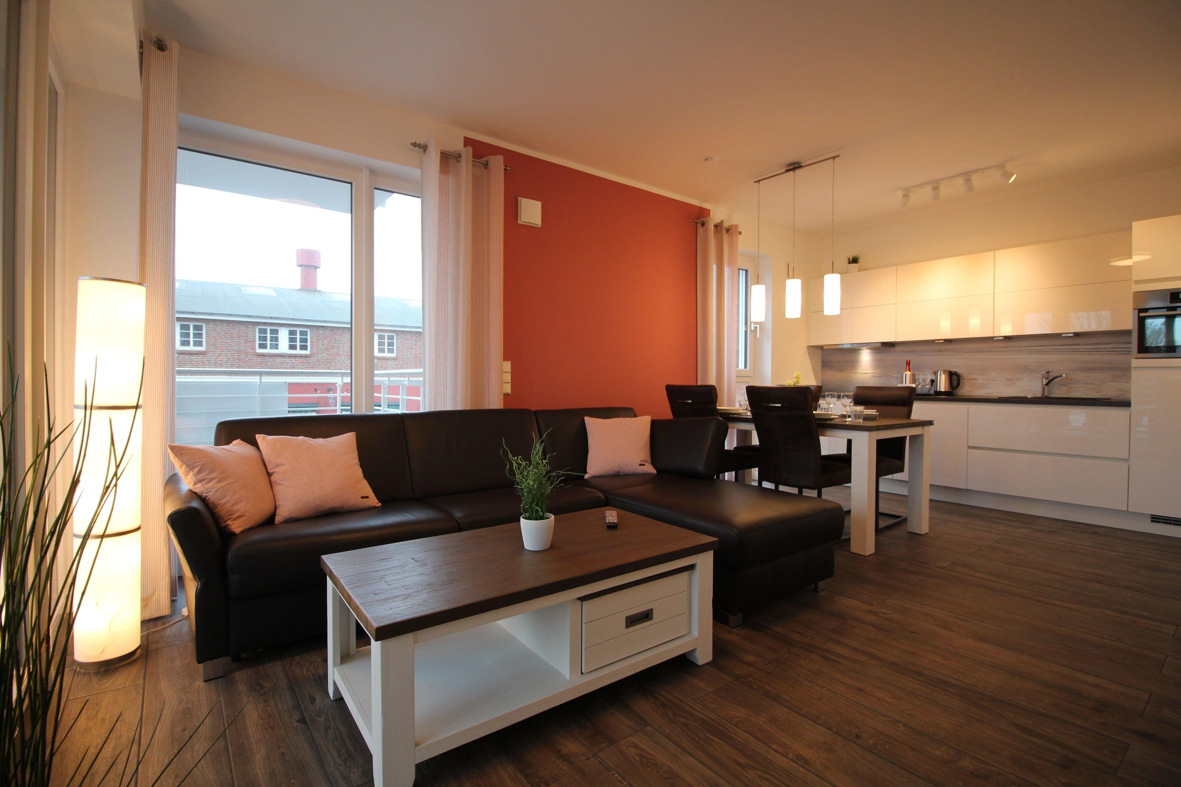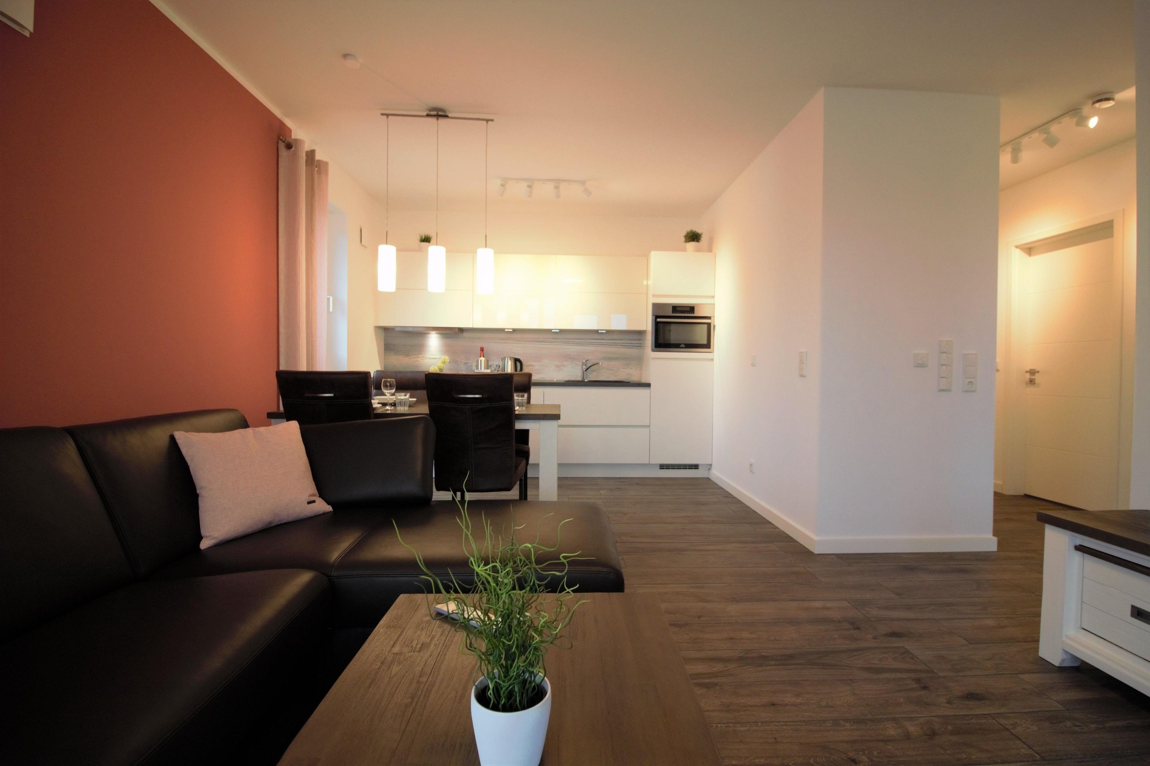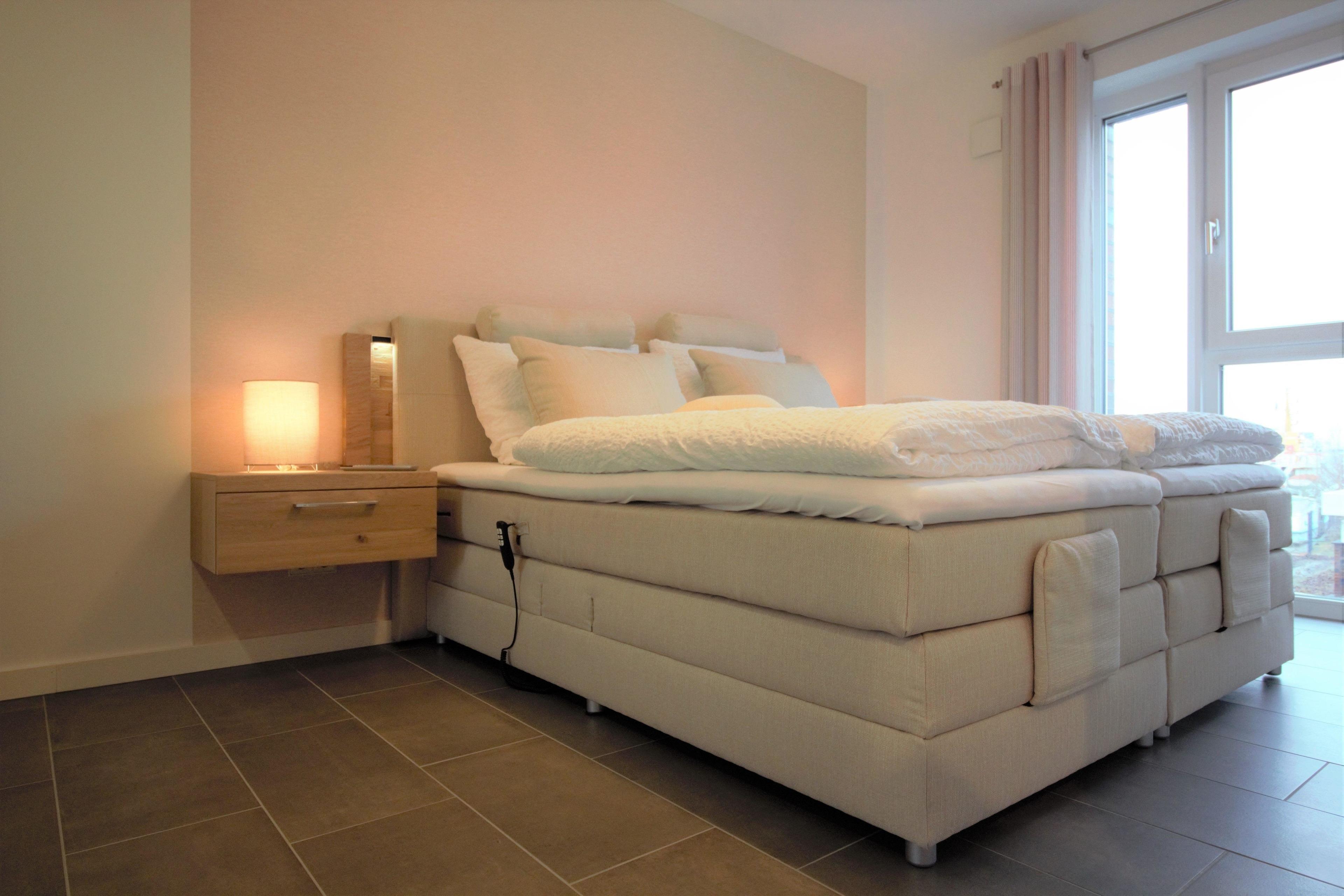 Ferienwohnung an der City-Marina für 4 Personen auf ca. 70qm, bezaubernde 3-Zimmer Luxus Ferienwohnung in der 1. Etage mit Seesicht, Lift, Fußbodenheizung und Lüftungsanlage, elektrisch verstellbare Boxspringbetten im Schlafzimmer I und hohes Einzelbett im Schlafzimmer II, 140cm breites hochwertiges Schlafsofa im Wohnbereich, voll ausgestattete Küche mit Mikrowelle + Spülmaschine.