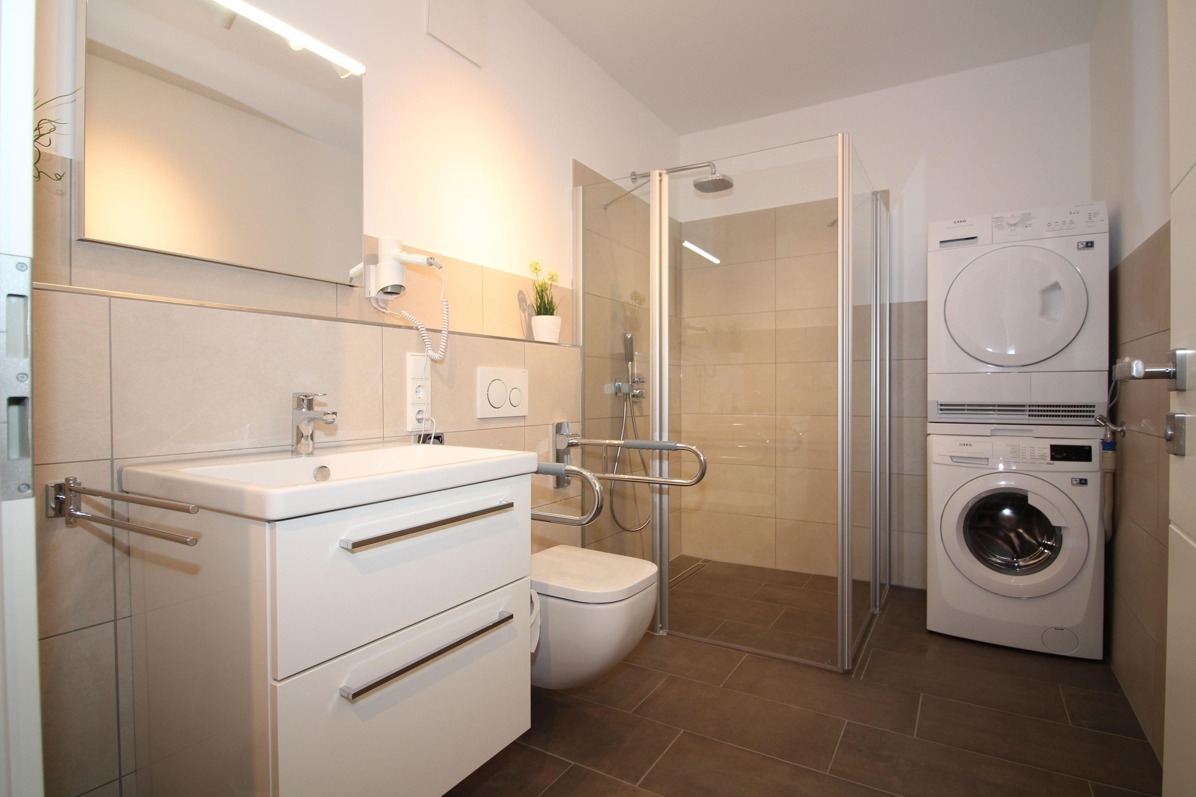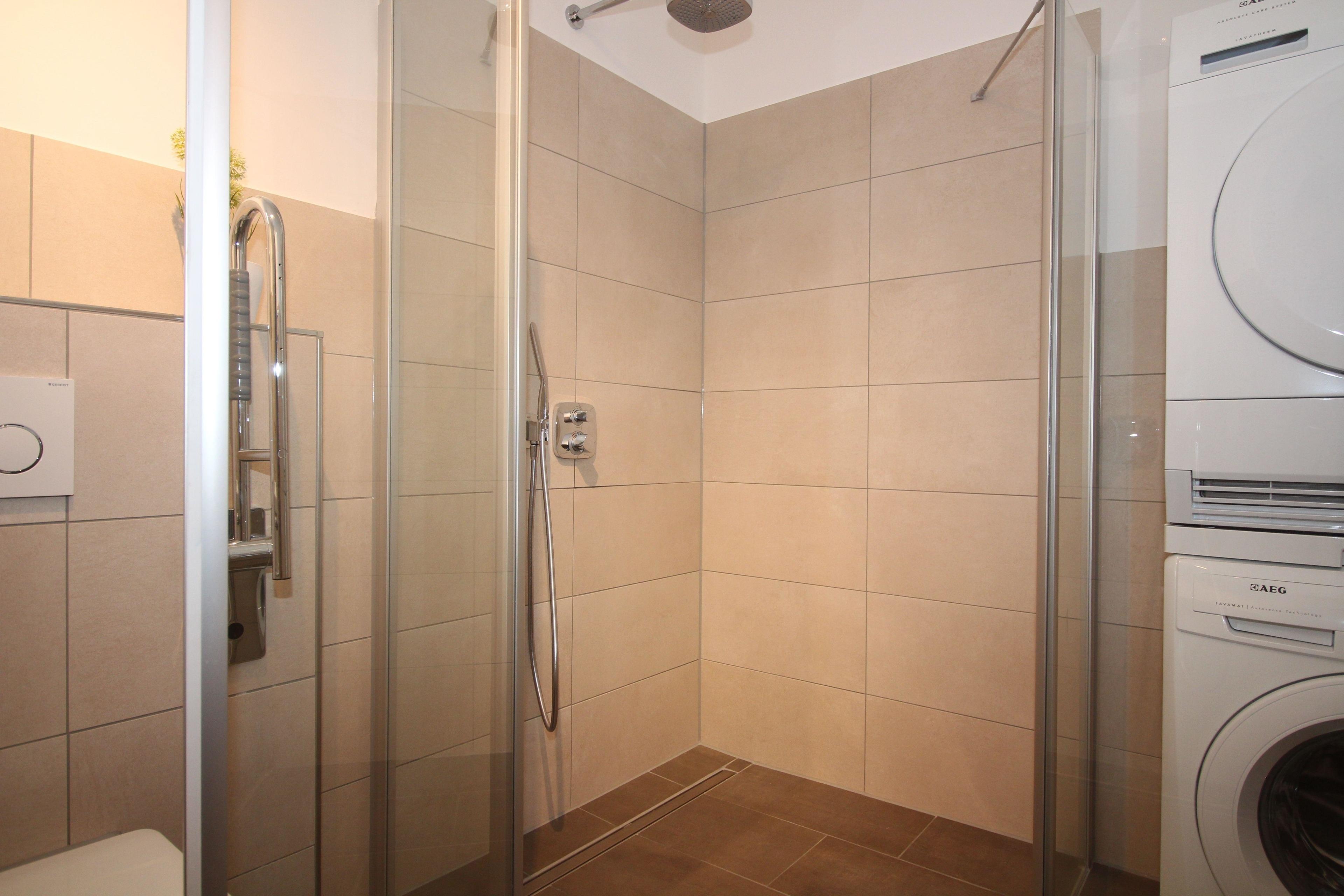 Rollstuhlgeeignete Dusche, Toilette mit Haltegriffen, Waschmaschine und Trockner in der Wohnung, 8cm hohe Schwelle zur Loggia und Balkon, Hocker für die Dusche.