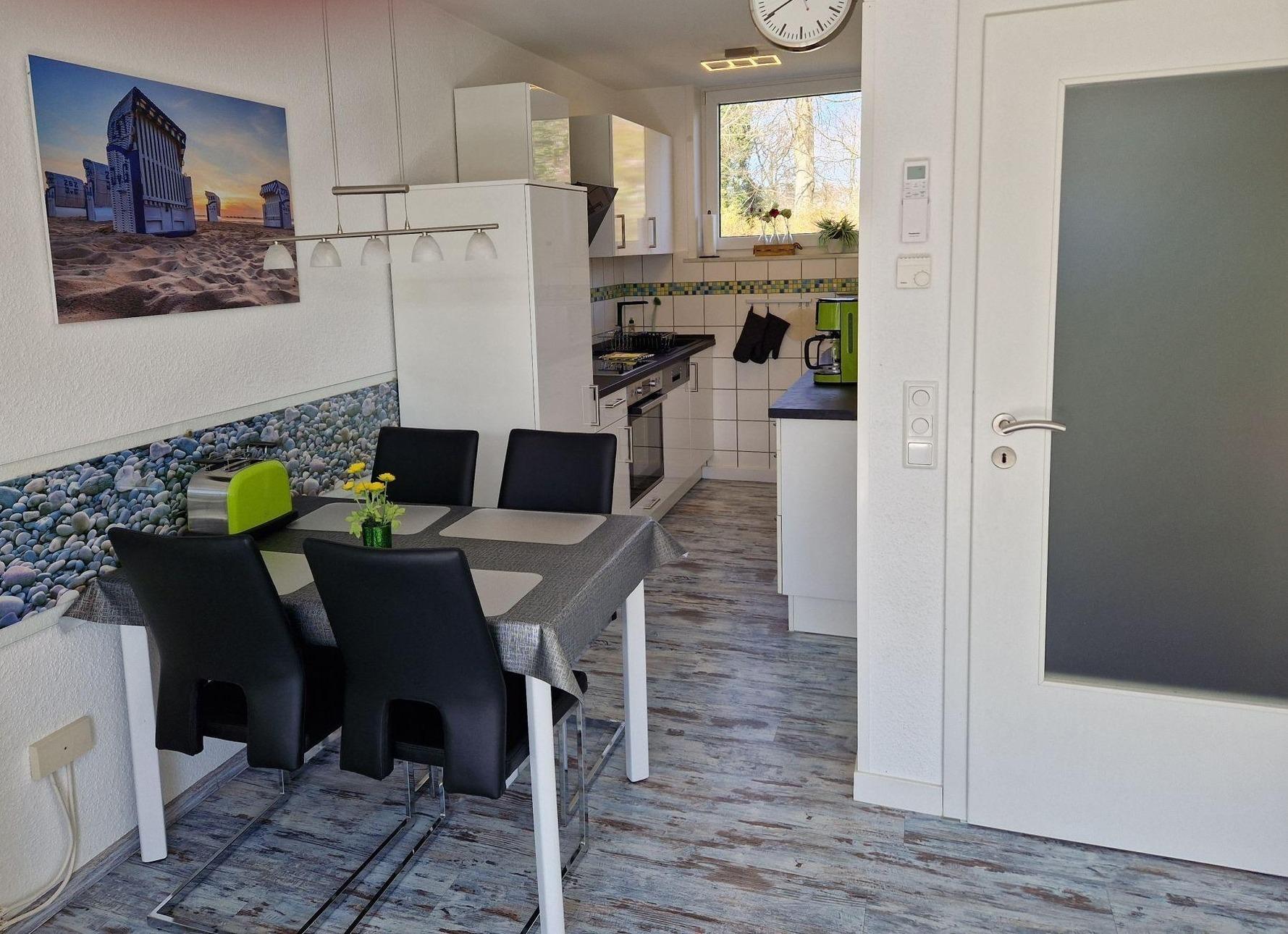 Das Ferienhaus Butendiek 99a in Cuxhaven bietet auf 66 m² Platz für bis zu vier Gäste und überzeugt durch eine geschmackvolle Einrichtung. Es umfasst zwei Schlafzimmer, die Ruhe und Erholung versprechen, sowie zwei Badezimmer, darunter ein Gäste-WC, ideal für Familien oder Paare. Der helle Wohn- und Essbereich ist mit einem gemütlichen Sofa, Fernseher und CD-Spieler ausgestattet und lädt zu entspannten Abenden ein. Die offene Küche, die optimal in den Wohnbereich integriert ist, bietet moderne Annehmlichkeiten wie einen 4-Platten-Herd, Kühlschrank, Spülmaschine und Mikrowelle, die die Zubereitung von Mahlzeiten erleichtern. Ein Esstisch bietet Platz für gemeinsame Mahlzeiten. Alle Räume sind freundlich gestaltet und tragen zu einem angenehmen Urlaubserlebnis bei. Bitte beachten, dass die Ausstattung des Außenbereichs gemeinschaftlich nutzbar ist.