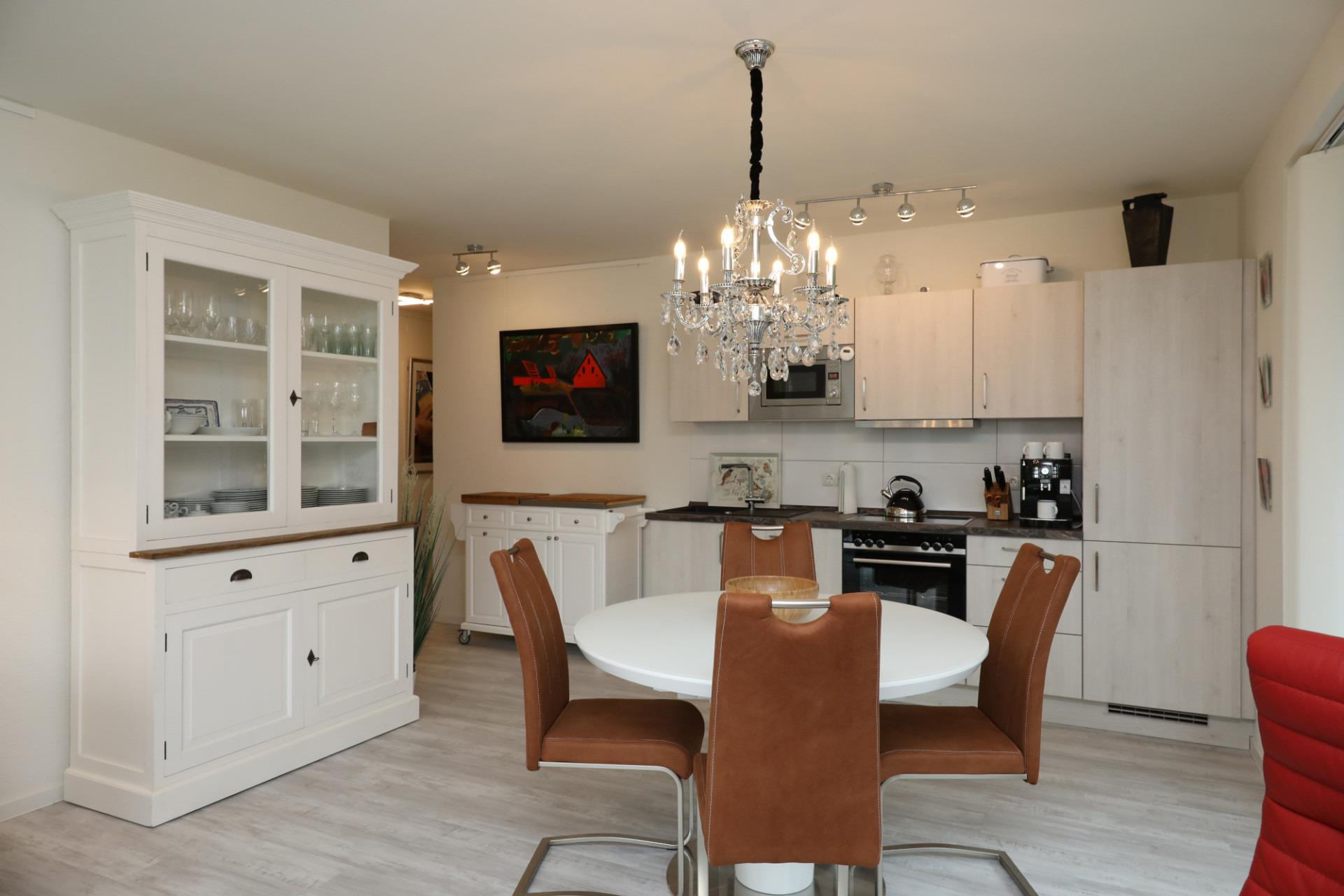 Genießen Sie Ihren Urlaub und die Vorzüge dieser 76 m² großen Neubauwohnung. Ein gemeinsames Frühstück auf dem Balkon ist der perfekte Start in den Tag. Die hochwertige und überdurchschnittlich ausgestattete Küche inklusive Kochutensilien und Fischbesteck, sowie der geräumige Wohn- und Essbereich lassen keine Wünsche offen. Abends können Sie in Ihrer eigenen Sauna entspannen, oder Sie lassen den Tag bei einem Glas Wein in der gemütlichen Sitzecke ausklingen.