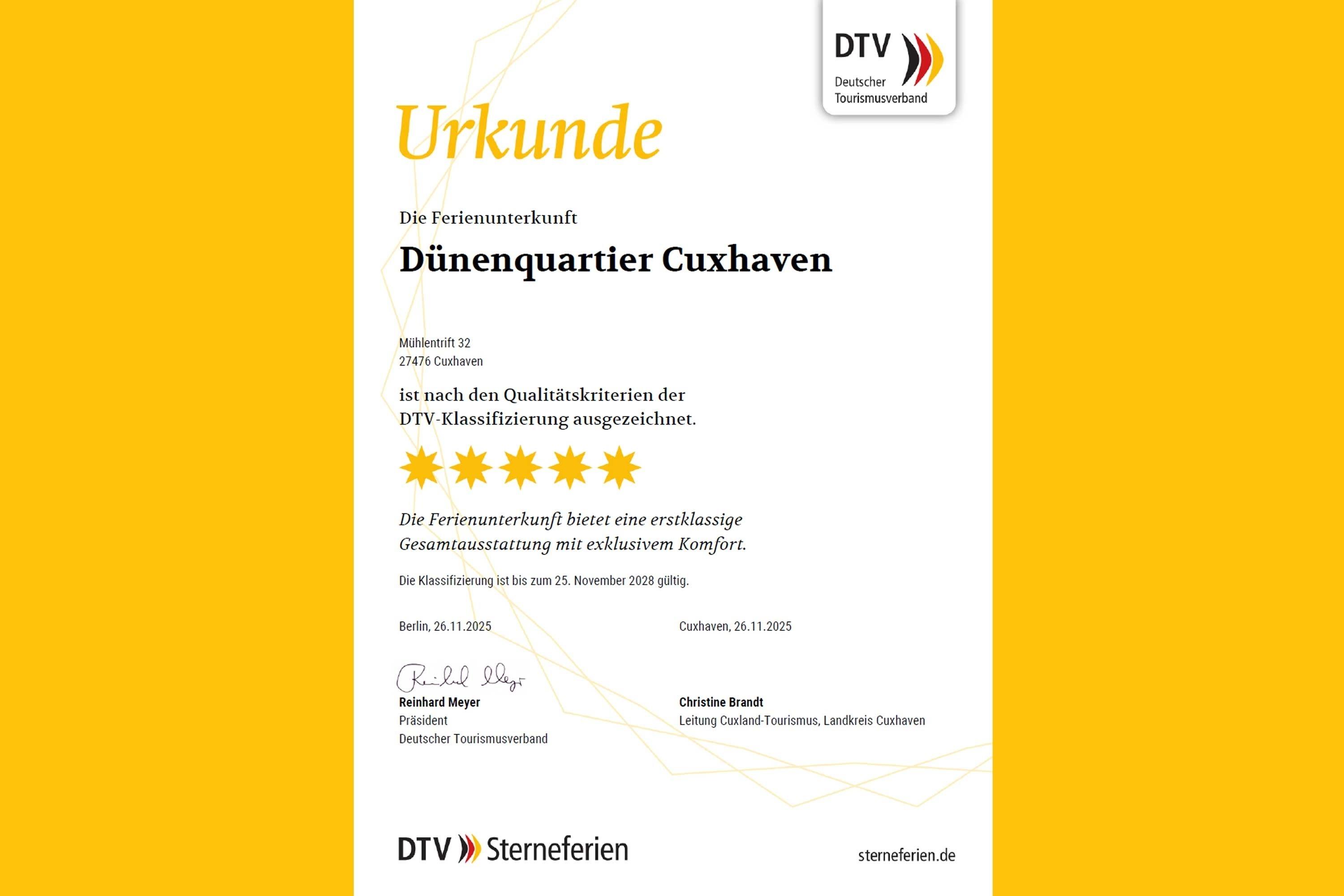 Das Dünenquartier Cuxhaven ist vom Deutschen Tourismusverband mit 5 Sternen ausgezeichnet und verspricht gehobenen Komfort und erstklassigen Service.