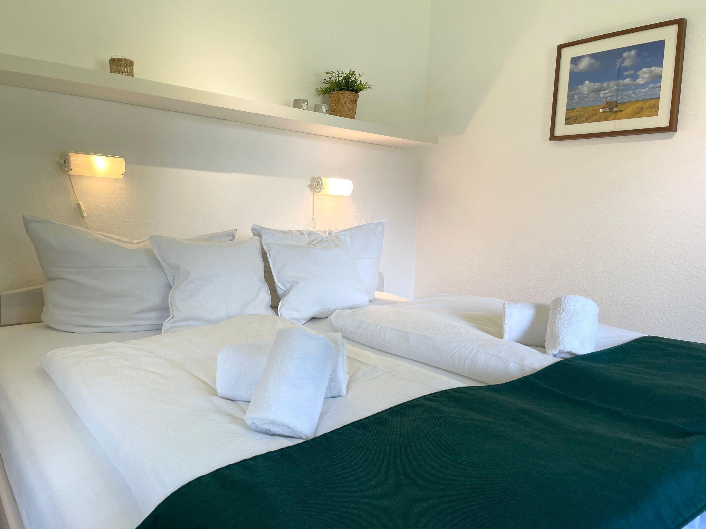 Die 2-Zimmer-Ferienwohnung im Haus "Land und Meer" bietet auf 45 m² einen komfortablen Rückzugsort. Der Wohnraum ist mit einer gemütlichen Sofaecke und einem Fernseher ausgestattet, ideal zum Entspannen. Die Kochnische umfasst einen Geschirrspüler, Kühlschrank mit Gefrierfach, 4-Platten-Herd, Backofen sowie Kaffeemaschine, Toaster und Wasserkocher, ergänzt durch sämtliche Küchenutensilien und Geschirr für die Selbstverpflegung. Ein Essbereich mit Platz für vier Personen rundet das Angebot ab. Das separate Schlafzimmer bietet ein Doppelbett und Blick in den Garten. Das Badezimmer ist mit einer Dusche und WC ausgestattet. Zur gemeinschaftlichen Nutzung stehen eine Münz-Waschmaschine, ein Trockner sowie ein abschließbarer Fahrradraum im Haus zur Verfügung. Parkmöglichkeiten sind direkt vor dem Gebäude vorhanden. Die Wohnung ist barrierefrei und ohne Treppenstufen erreichbar.