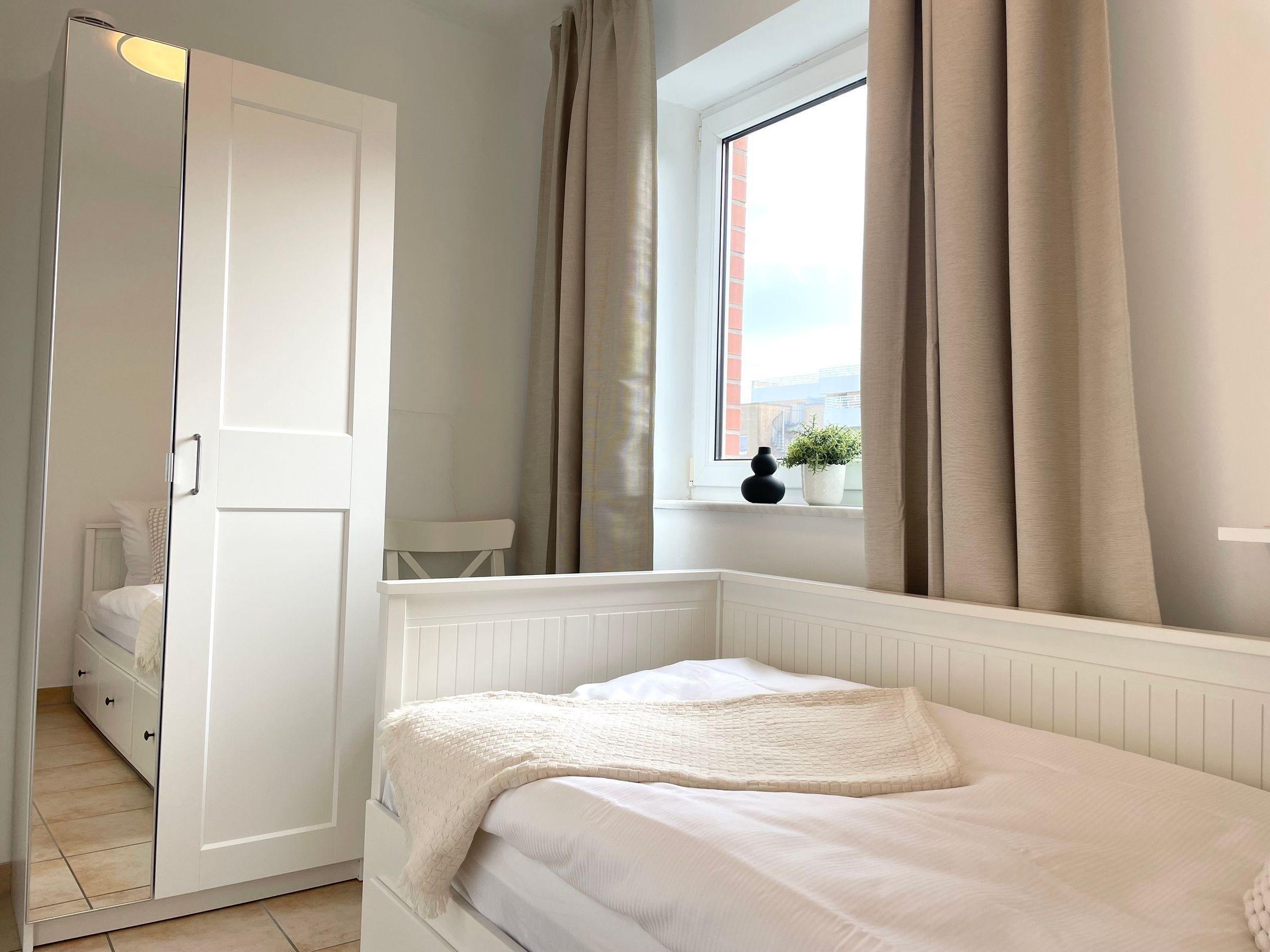 Die Ferienwohnung im 2. Obergeschoss bietet auf 51 qm Platz für bis zu 6 Personen. Sie verfügt über ein Schlafzimmer mit Doppelbett, ein kleineres Schlafzimmer mit ausziehbarem Tagesbett und ein Schlafsofa im Wohnraum. Das geschmackvoll eingerichtete Wohnzimmer ist mit einem Flatscreen-TV ausgestattet. Die Küchenzeile umfasst einen Herd, Mikrowelle, Toaster, Wasserkocher und Kaffeemaschine. Ein Balkon mit Teil-Meerblick lädt zum Entspannen ein. Gemeinschaftlich nutzbar ist der ebenerdig gelegene Fahrradkeller, ideal für die Unterstellung von Fahrrädern. Die Ferienwohnung besticht durch ihre zentrale Lage gegenüber dem Wernerwald und in unmittelbarer Nähe zum Sandstrand, der nur 400 Meter entfernt ist.
