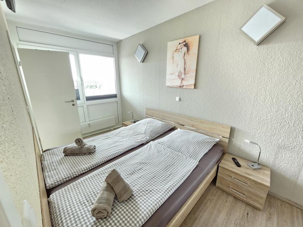 Treten Sie ein und lassen Sie sich von der modernen Einrichtung begeistern. Der geräumige Schlafraum verfügt über ein komfortables Doppelbett, das Ihnen erholsame Nächte garantiert. Genießen Sie den Luxus eines eigenen Rückzugsorts mit gemütlichem Ambiente und einem atemberaubenden Blick aus der 12. Etage.