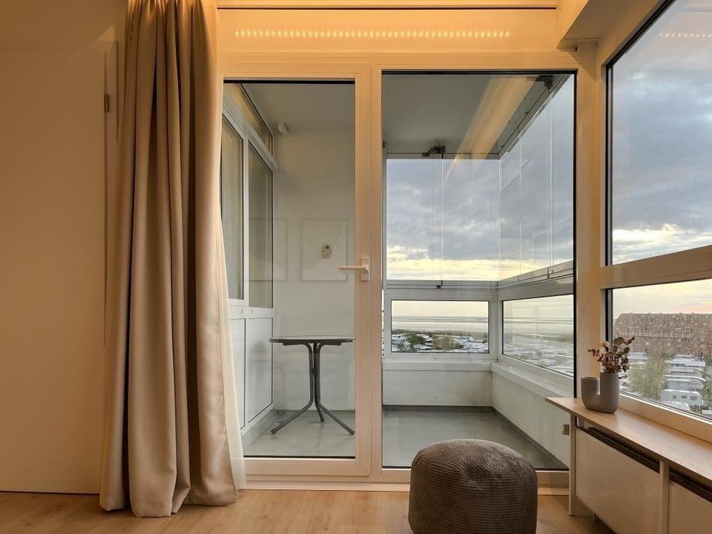 Die Wohnung befindet sich auf der 5. Etage und bietet Ihnen einen schönen Blick auf das Weltkulturerbe Wattenmeer und seine Umgebung. Der Balkon lädt dazu ein, den Tag mit einem entspannten Frühstück im Freien zu beginnen oder bei einem Glas Wein den Sonnenuntergang zu genießen.