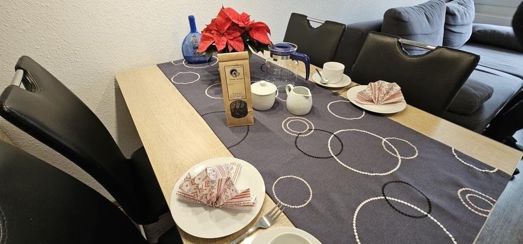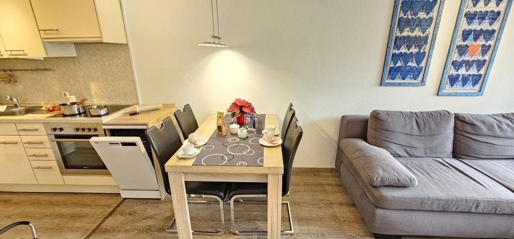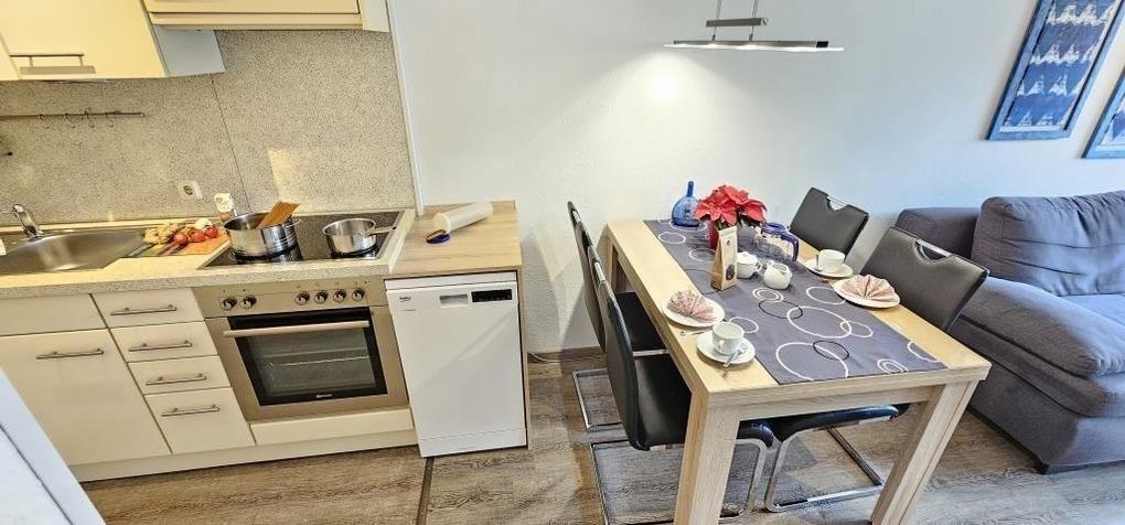 In dieser Ferienwohnung steht Ihnen ein Wohnraum mit einem Doppelbett 1,60mx2m zur Verfügung. Am Wohnraum befindet sich ein Balkon mit Sitzgelegenheit. 1 TV und ein kostenloser WLAN-Hotspot steht Ihnen zur Unterhaltung zur Verfügung. In der neuen Küchenzeile finden Sie einen Backofen, Kühlschrank mit Gefrierfach und einen Geschirrspüler. Da lassen sich einige Köstlichkeiten zubereiten und man kann kochen und miteinander schnacken wunderbar verbinden. Das Badezimmer verfügt über Badewanne und ein WC.