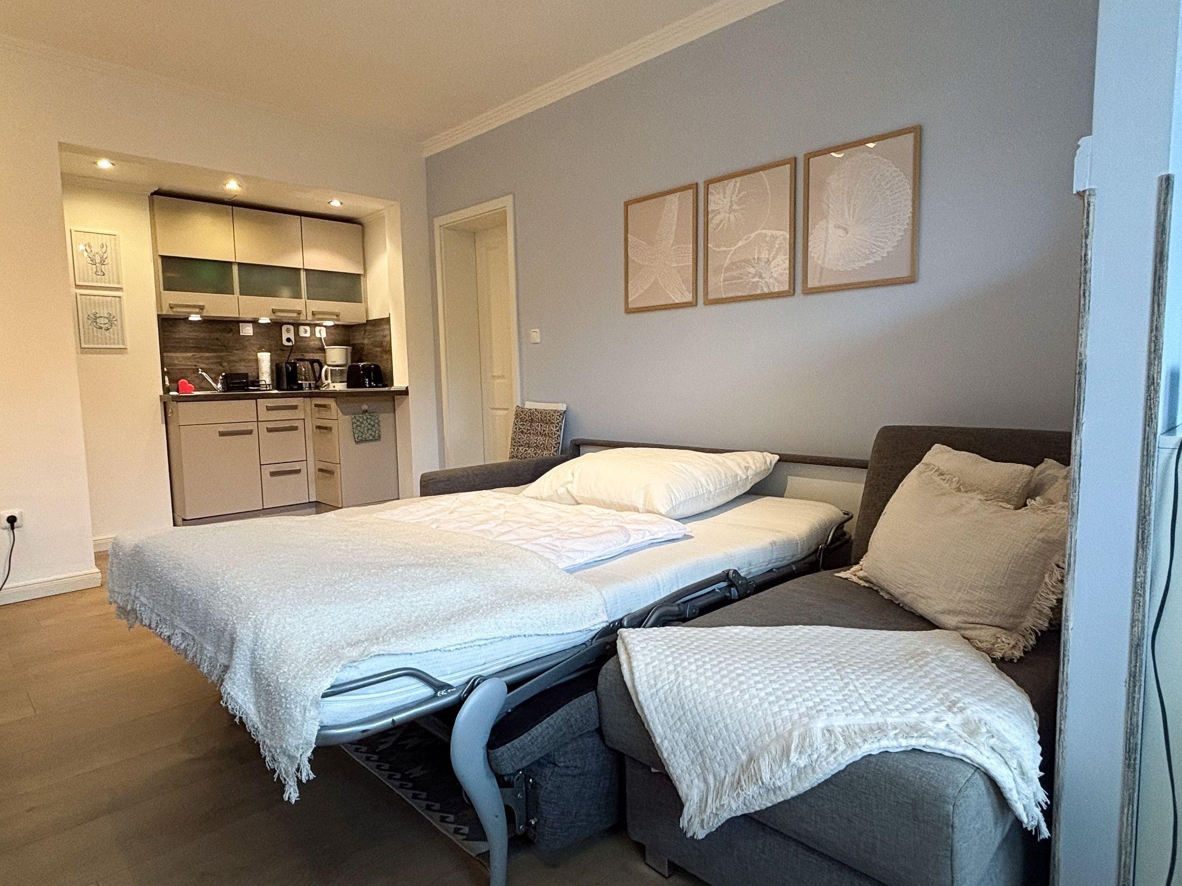 Das KüstenNest Frauenpreiss 57 ist eine charmante Zwei-Zimmer-Ferienwohnung in Cuxhaven-Sahlenburg, nur 300 Meter vom Strand entfernt. Auf 37 m² bietet sie Platz für bis zu drei Gäste und vereint helle Farben mit natürlichen Materialien für eine einladende Atmosphäre. Die Wohnung besteht aus einem separaten Schlafzimmer mit bequemem Bett und Lesesessel sowie einem Wohnbereich mit Schlafcouch, Esstisch und Fernseher. Die offene Küche ist mit einer Nespresso- und Filterkaffeemaschine, Wasserkocher, Toaster, Zwei-Platten-Herd und Kühlschrank mit Gefrierfach ausgestattet. Ein modernes Badezimmer mit Dusche rundet die Ausstattung ab. Für Entspannung sorgt ein beheizter Indoor-Pool und eine Sauna, die gemeinschaftlich nutzbar sind. WLAN und ein kostenfreier Parkplatz sind ebenfalls vorhanden.