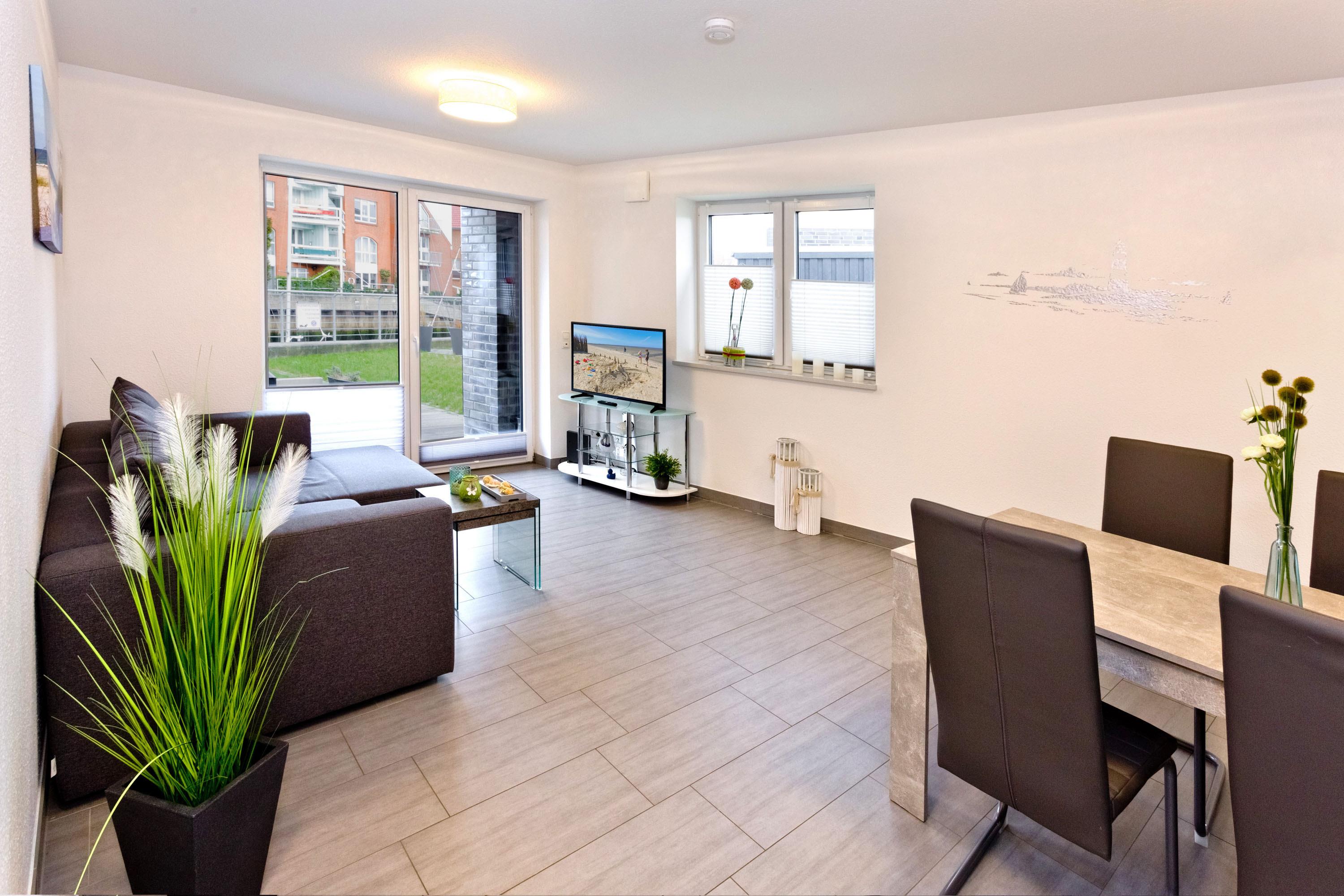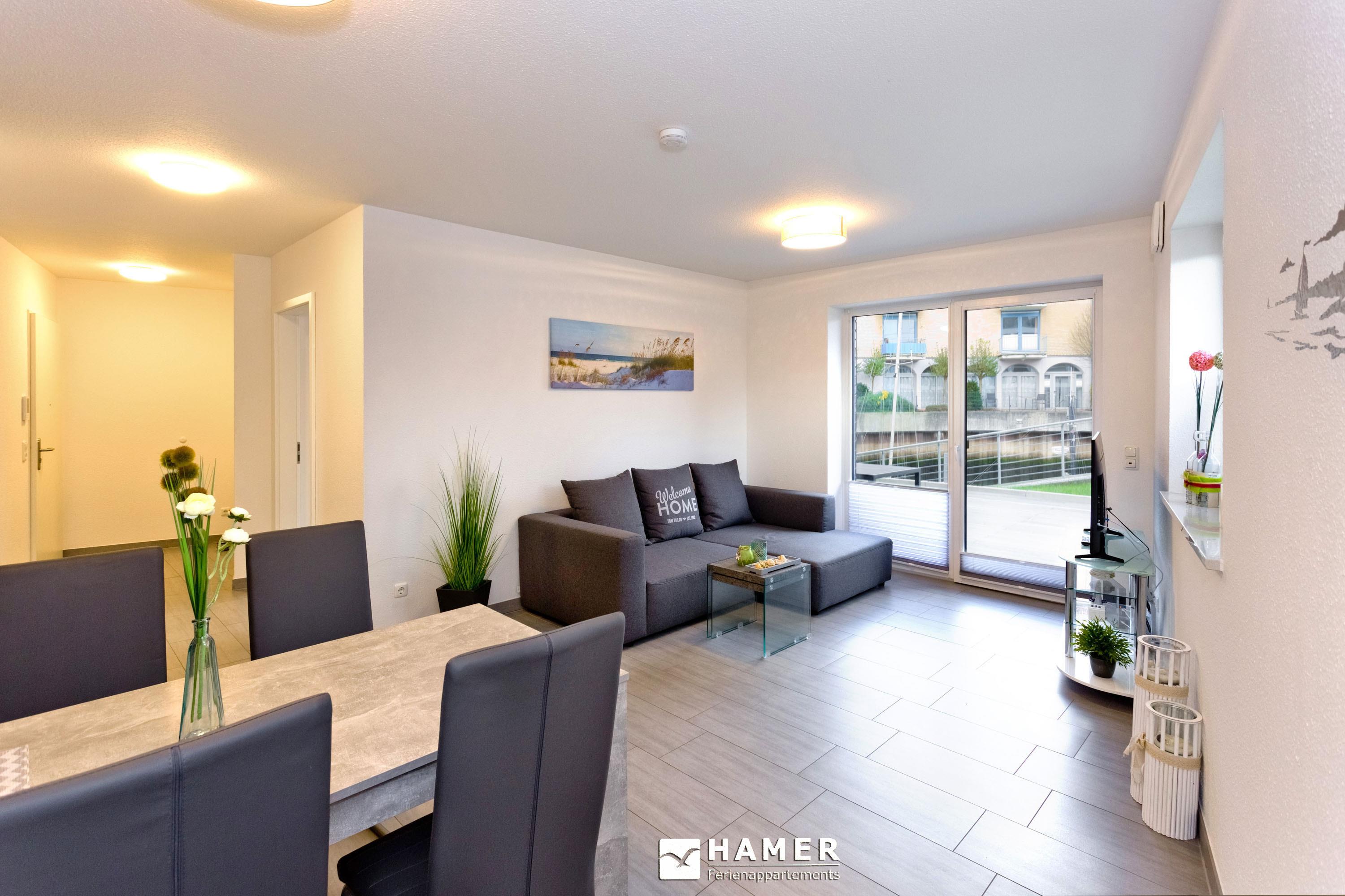 Neue 2-Raum-Wohnung für 2 Pers. in der City Marina im Erdgeschoss mit großer Terrasse (west) direkt am Hafenbecken. Voll ausgestattete Küchenzeile mit Backofen, Geschirrspüler etc.. Wohn- Esszimmer mit Smart-TV, Schlafzimmer mit Doppelbett [&] elektr.. Rollläden, Badezimmer mit ebenerdige Dusche/WC. Waschmaschine i.d. Wohnung, kostenloses W-Lan, Stellplatz #2 und großer separater Abstellraum mit E-Bike Lademöglichkeit, keine Haustiere und natürlich Nichtraucher.