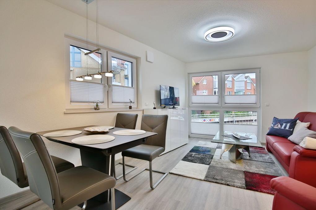 Schöne 2-Raum-Wohnung für 2 Pers. in der City Marina auf der 1.Etage mit überdachtem Balkon (süd-west). Voll ausgestattete Küchenzeile mit Backofen, Geschirrspüler etc.. Wohn- Esszimmer mit TV, Radio, und Blick in die Marina, Schlafzimmer mit Doppelbett, Badezimmer mit ebenerdige Dusche/WC, kostenloses Wlan, alle Fenster mit elktr. Rollläden, Aufzug, Stellplatz #3 und großer separater Abstellraum mit E-Bike Lademöglichkeit, Waschmaschine/Trockner i.d. Wohnung, keine Haustiere und natürlich Nichtraucher.