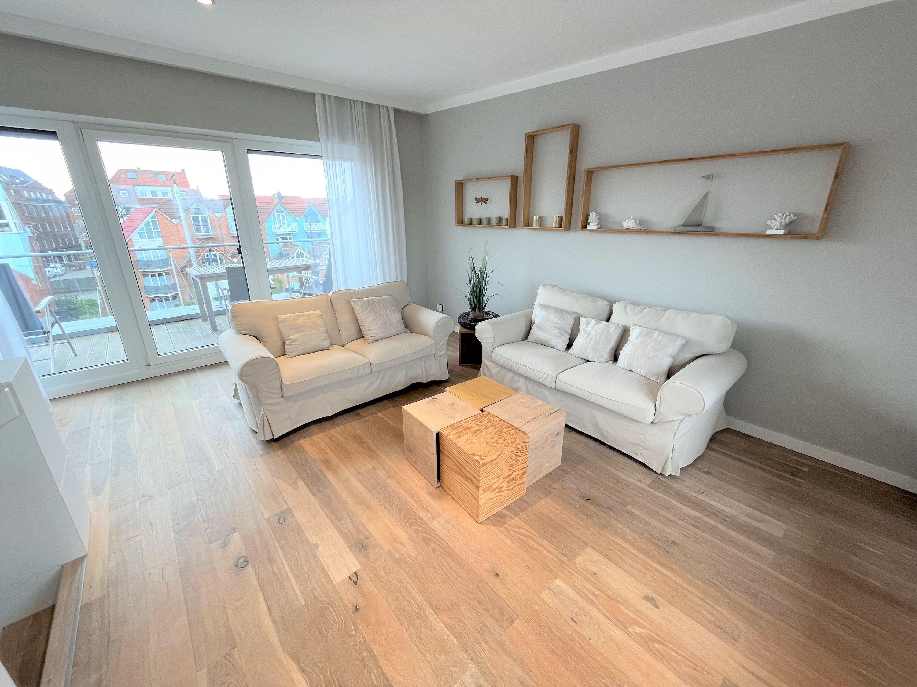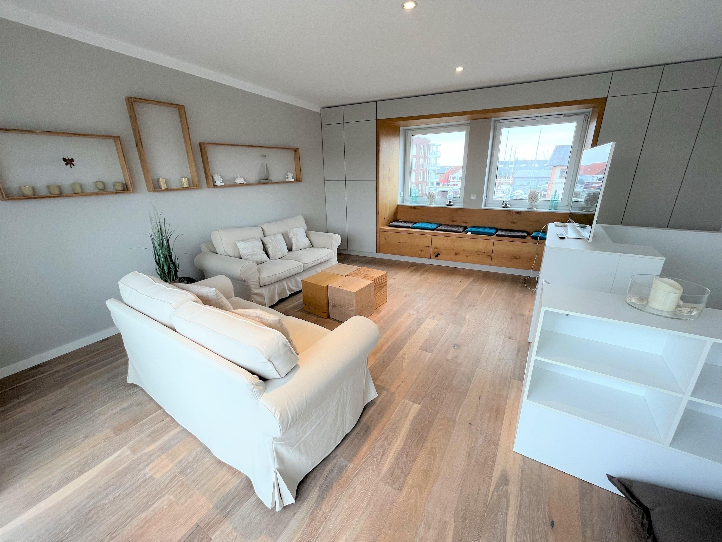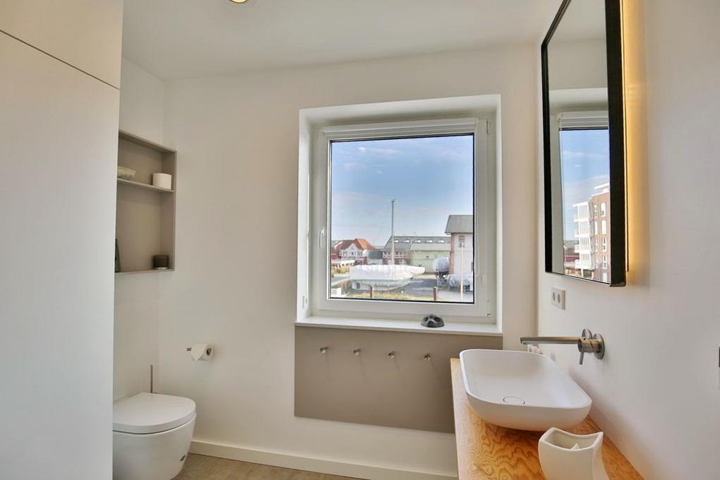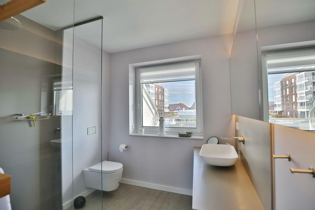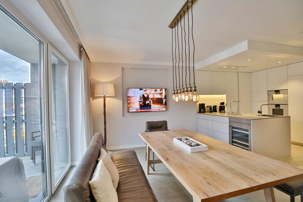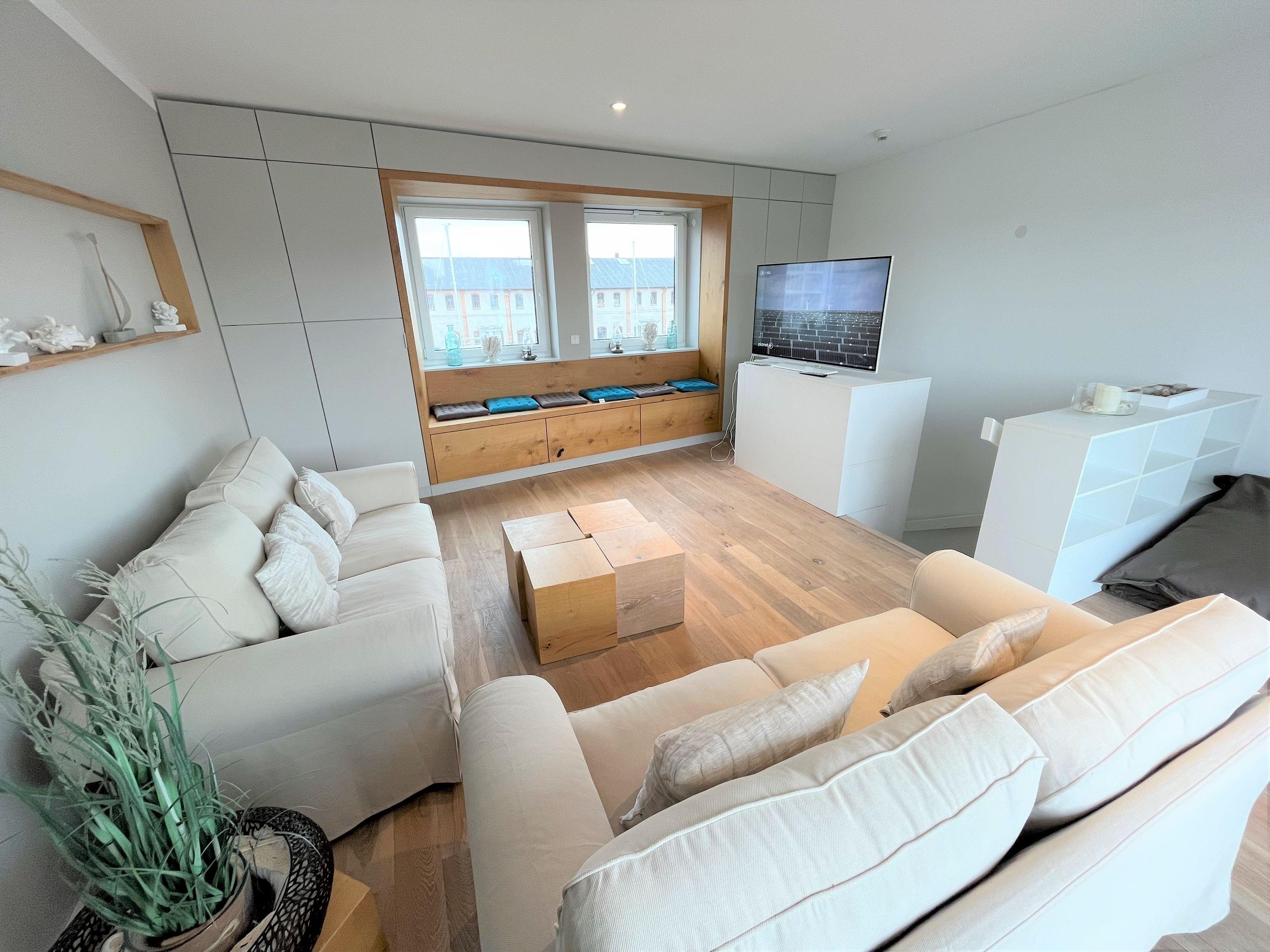 Purer Luxus für bis zu 6 Pers. auf 4 Etagen. Großer Wohnbereich mit offener Designerküche (Backofen, Geschirrspüler etc.), TV, Terrasse (west) direkt in der Marina, Gäste/WC, Flur/Garderobe. 1. Etage: Großes Schlafzimmer mit Doppelbett, TV, Bad en Suite (Du/WC) [&] Ostbalkon. 2. Etage: Ein Schlafzimmer (Doppelbett) [&] TV, 1 Schlafzimmer (Etagenbett, oben 0,80m x 2,00m, unten 1,40 x 2,00), Dusche/WC (mit Waschmaschine [&] Trockner). 3. Etage: Wohnbereich in der Lounge mit großer Dachterrasse (west). Blick in die Marina aus allen Räumen, Lichtkonzept mit integrierter Beleuchtung, TV (Antennenempfang, nur öffentlich-rechtliche-Sender), Lautsprecher in den Wänden, kostenfreies W-Lan-Internet, Fahrradschuppen, 1 PKW-Stellplatz am Haus, Nichtraucher, keine Haustiere.