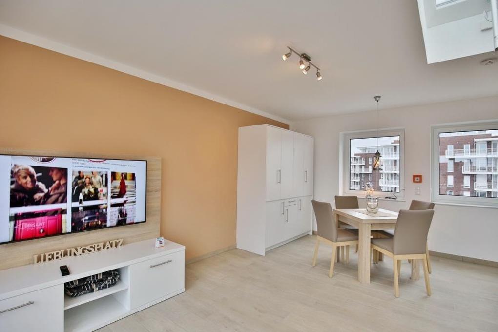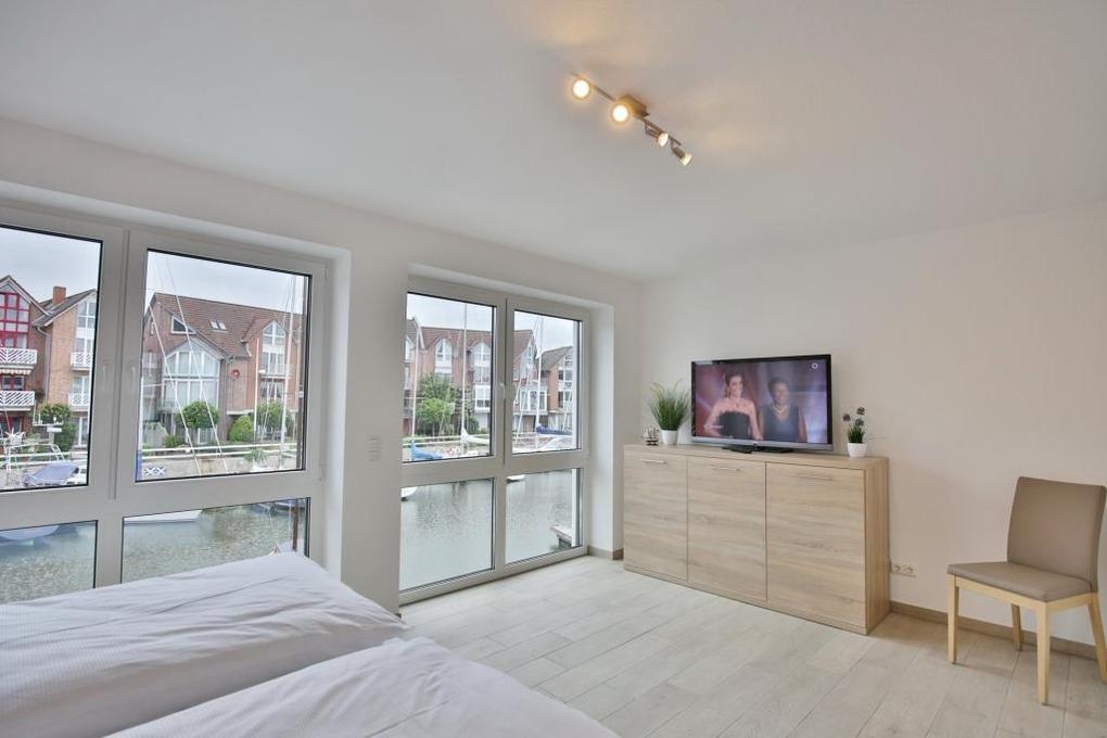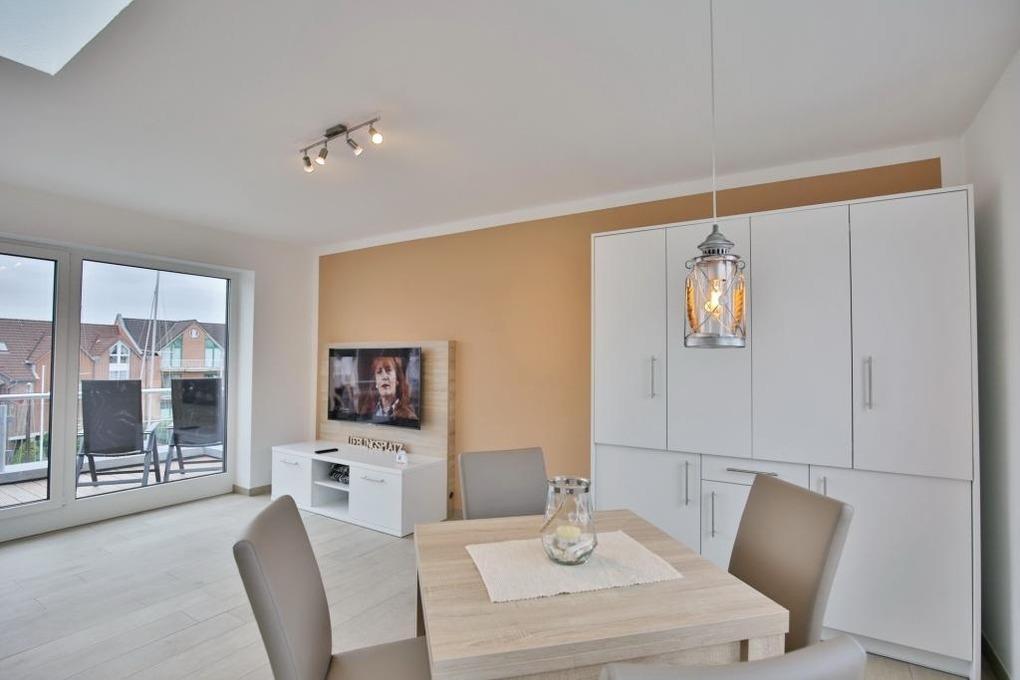 Modernster Neubau für bis zu 6 Pers. auf 4 Etagen mit höchstem Komfort. 2 Wohnzimmer, 3xBalkon/Terrasse, 3 Schlafzimmer mit Doppelbetten, 5 x LCD-TV bis 65", Bluray 4K-Player, alle Fenster mit elektrischen Außenrollläden, Fußbodenheizung, W-LAN, offene Küchenzeile (Backofen, Geschirrspüler, Nespresso Maschine etc.), große Terrasse (west) mit Blick in die Marina, Gäste/WC. 1. Etage: Großes Schlafzimmer mit Doppelbett mit TV, Du/WC mit Waschmaschine/Trockner [&] 1 Balkon (ost). 2. Etage: Zwei Schlafzimmer (Doppelbetten) [&] TV, Badewanne/Dusche/WC. 3. Etage: Lounge mit großer Dachterrasse (west), TV und kleiner Küchenzeile [&] Nespressomaschine. Fahrradschuppen (eBike Lademöglichkeit), 1 PKW-Stellplatz am Haus, keine Haustiere gestattet, Nichtraucher.