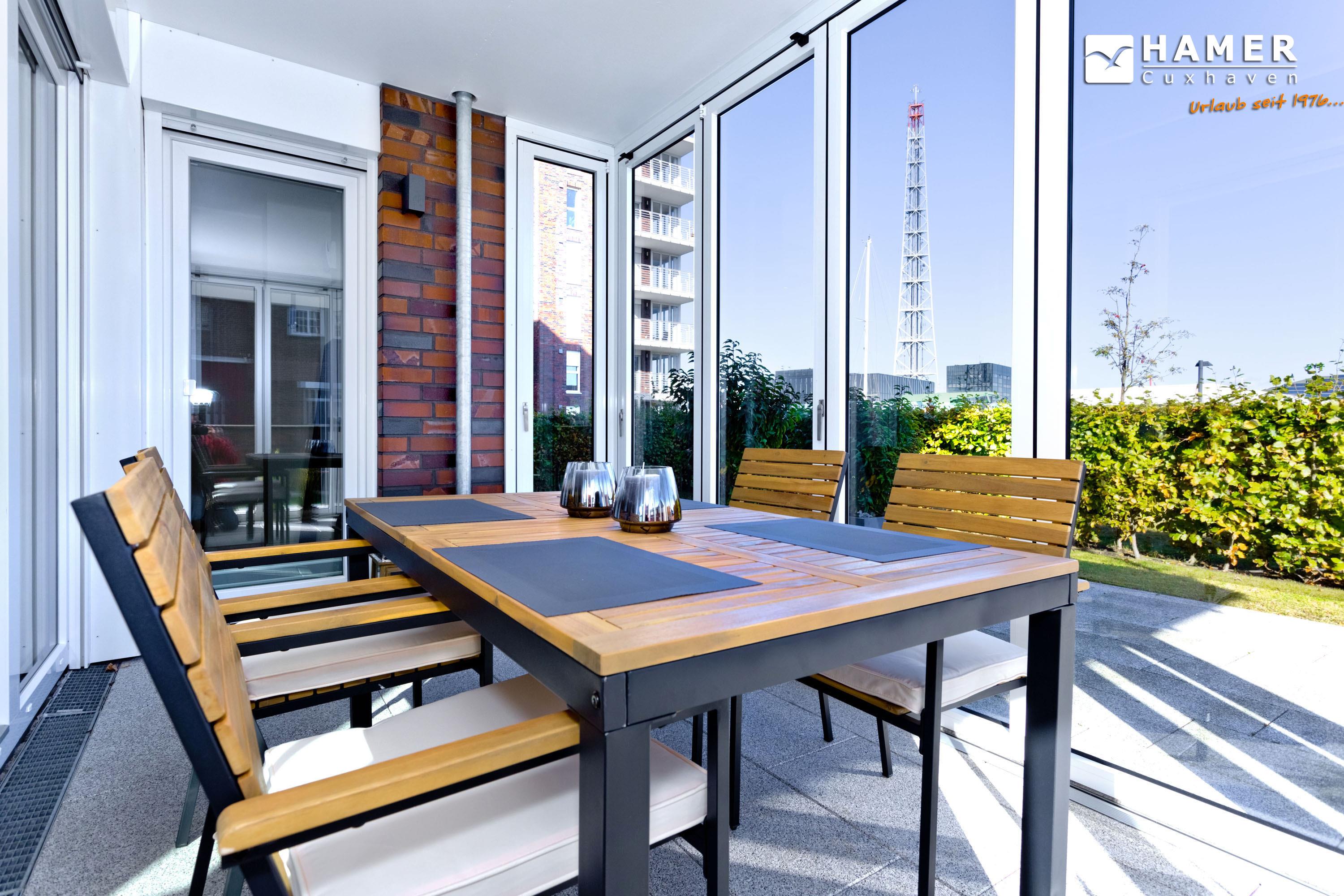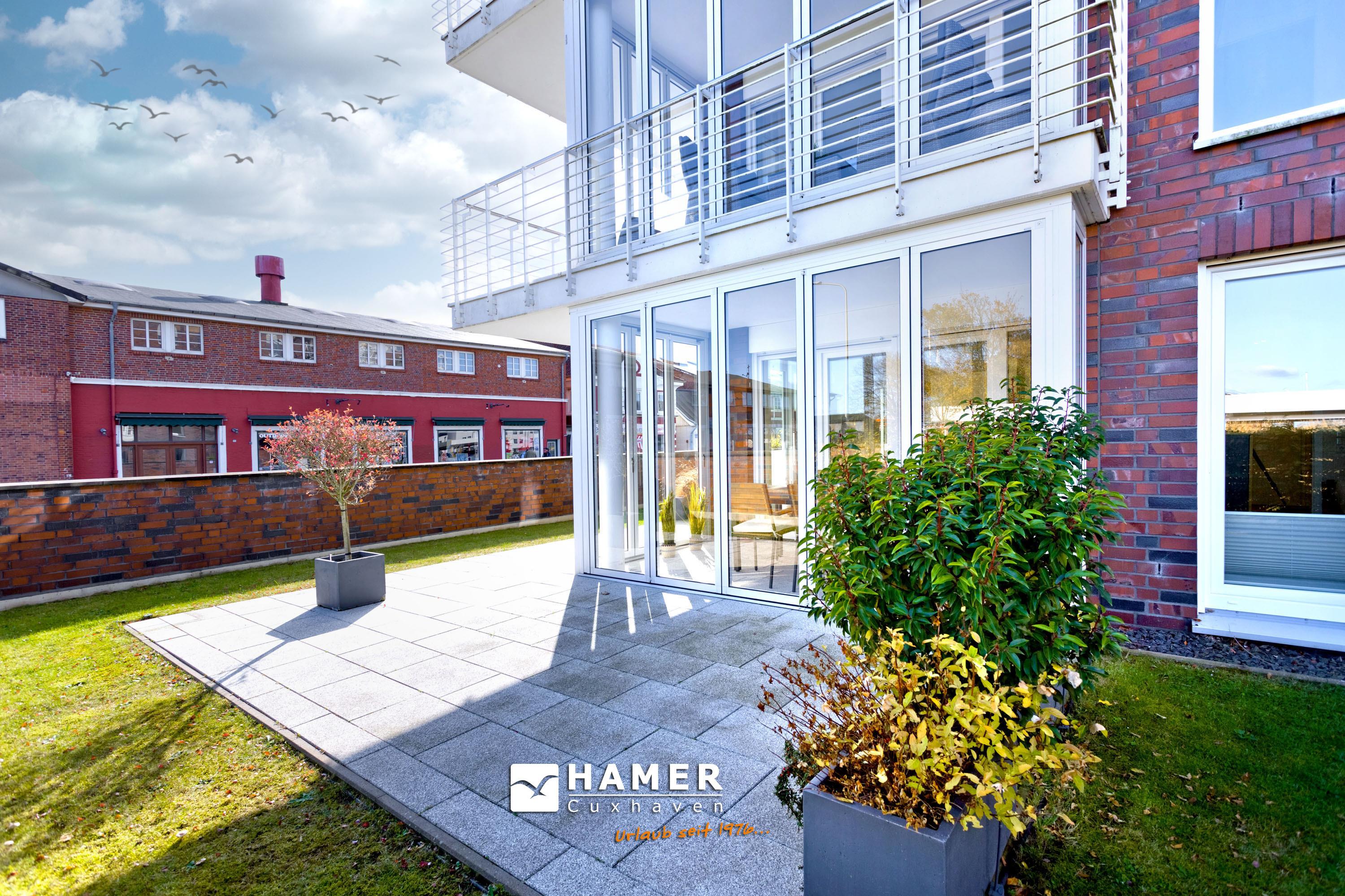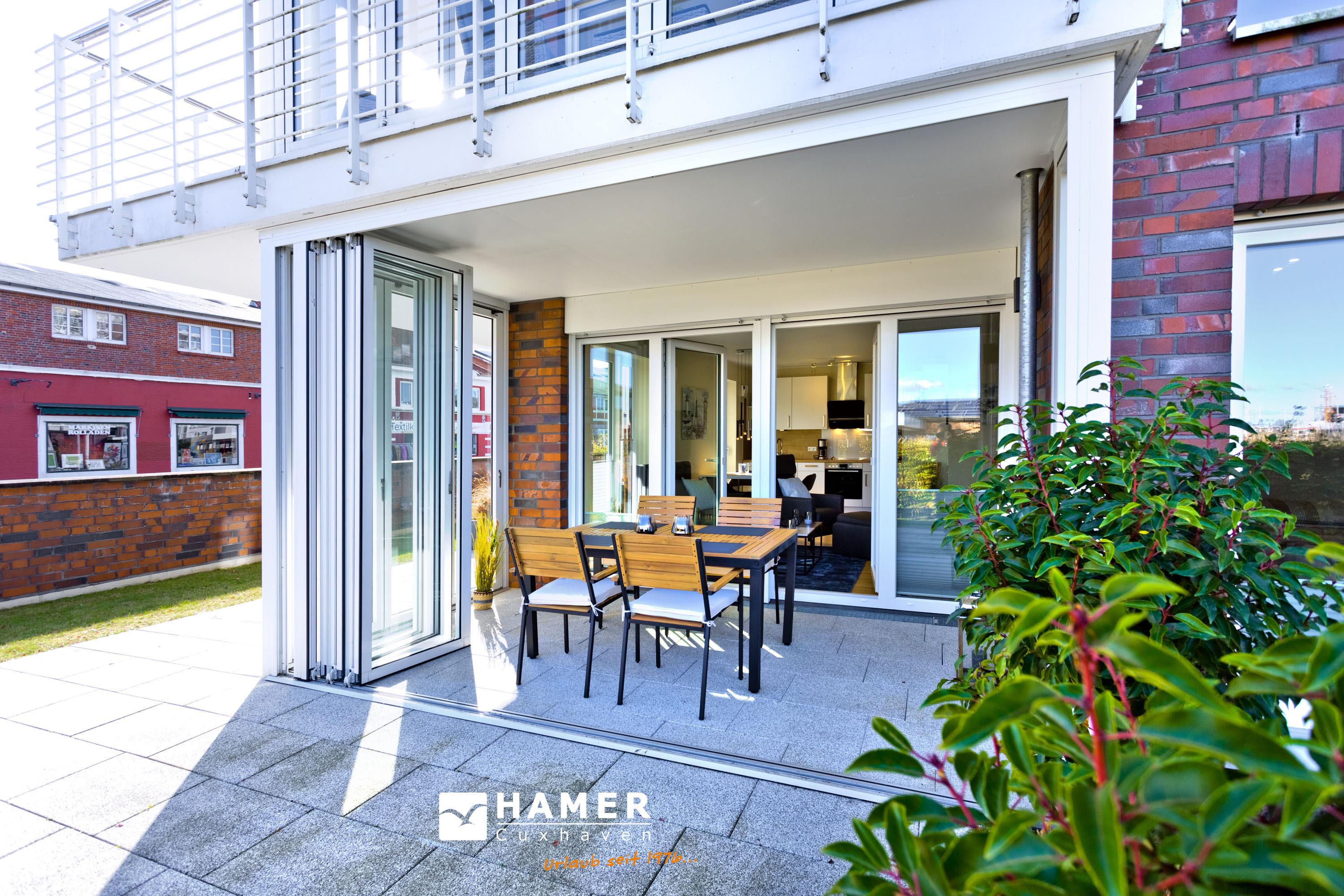 Haus Kapitän Alexander, direkt an der Marina Cuxhaven gelegene Neubauwohnung – NEU RENOVIERT und NEU MÖBLIERT Oktober 2024 – ca. 78m². Tolle 3 Zimmer-Luxus-Wohnung im Erdgeschoss für max. 3 Pers. ausgestattet. Großzügiges Wohnzimmer mit Terrasse (nord/ost). Die Terrasse ist teilweise windgeschützt als Loggia zu nutzen. Vollständig ausgestattete Küchenzeile, 1 Schlafzimmer mit Doppelbett (RÖWA Lattenrost elektr. verstellbar) und TV, Fliegengitter und großem Einbauschrank, 1 Schlafzimmer mit Einzelbett (Lattenrost elektr. verstellbar). Alle Räume sind über elektr. Außenjalousien zu verdunkeln. Fußbodenheizung, Kostenfreies W-Lan-Internet, Kabel-TV und Magenta TV, Nespresso Maschine, barrierefreie Dusche/WC, Miele-Waschmaschine und Miele-Trockner in der Wohnung. Reservierter Pkw-Stellplatz im Carport #8, Fahrradkeller, Nichtraucher und es sind keine Haustiere gestattet.