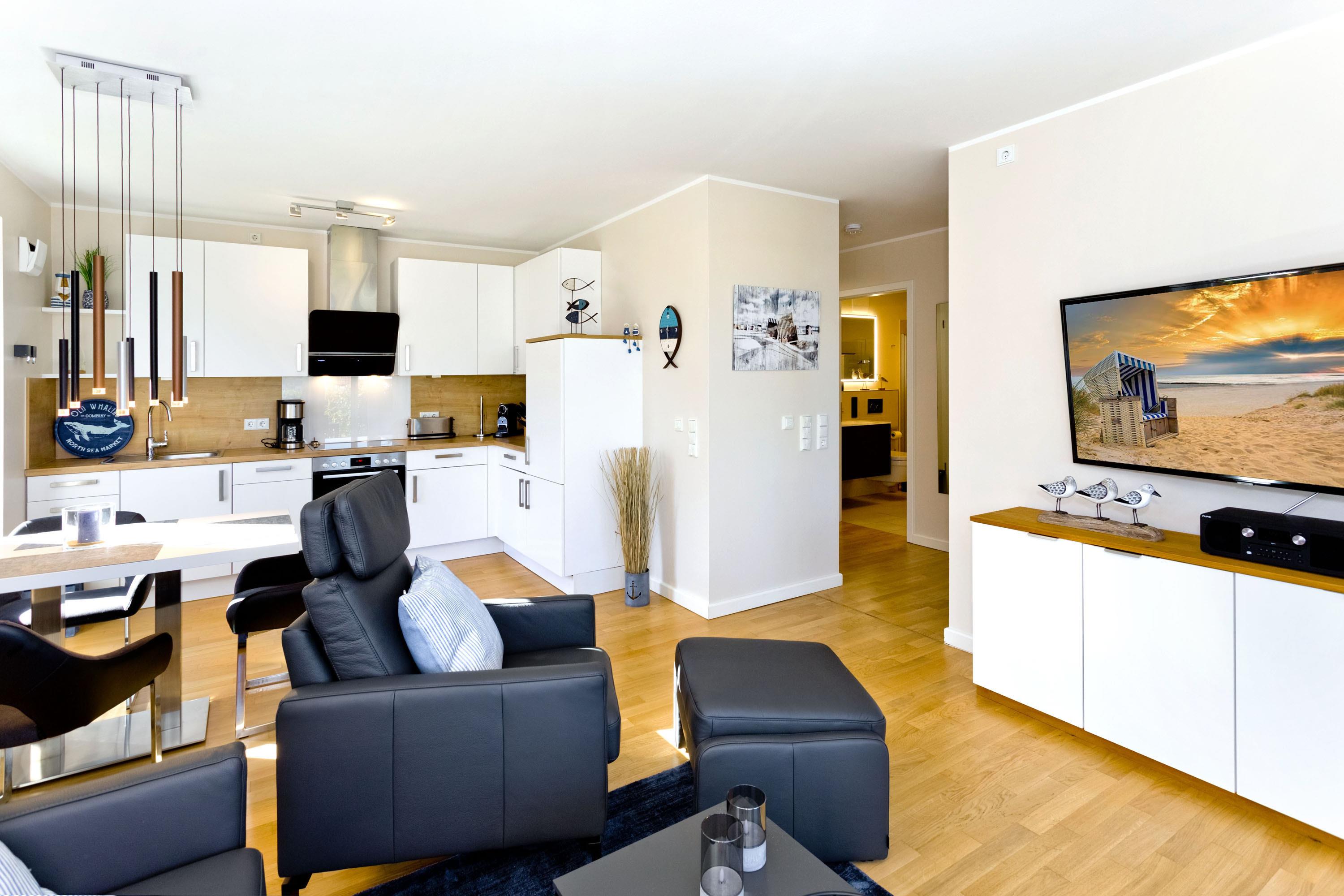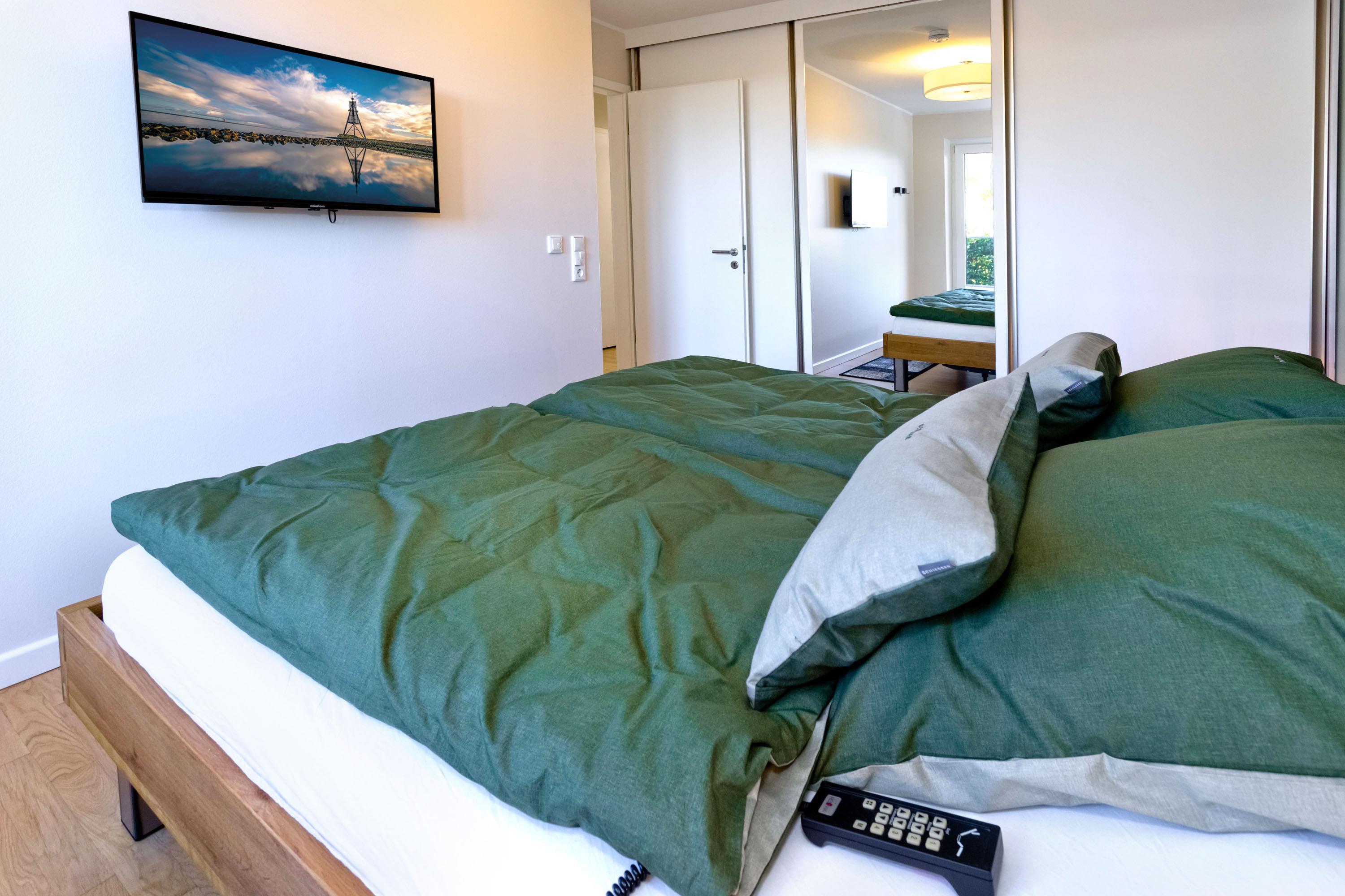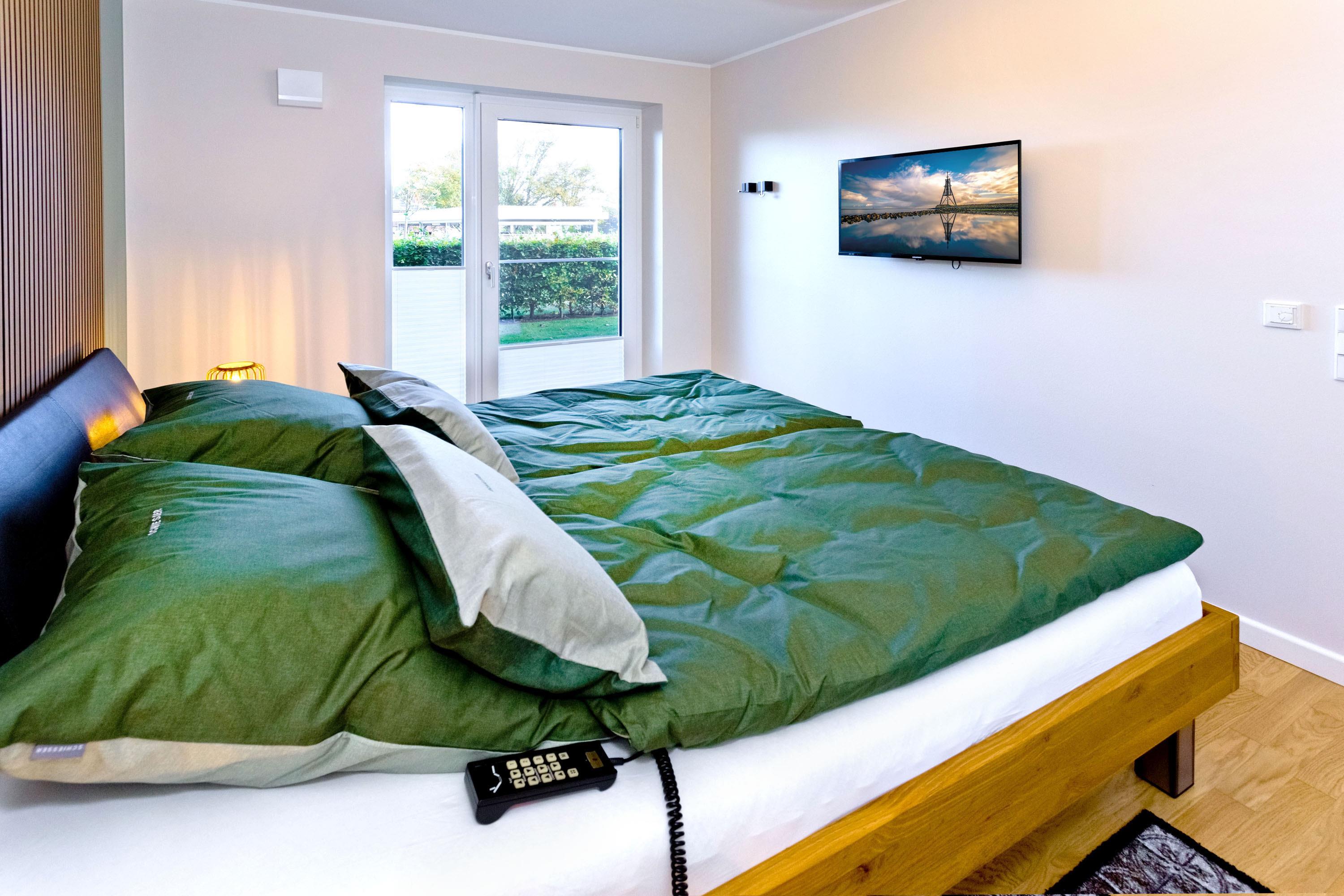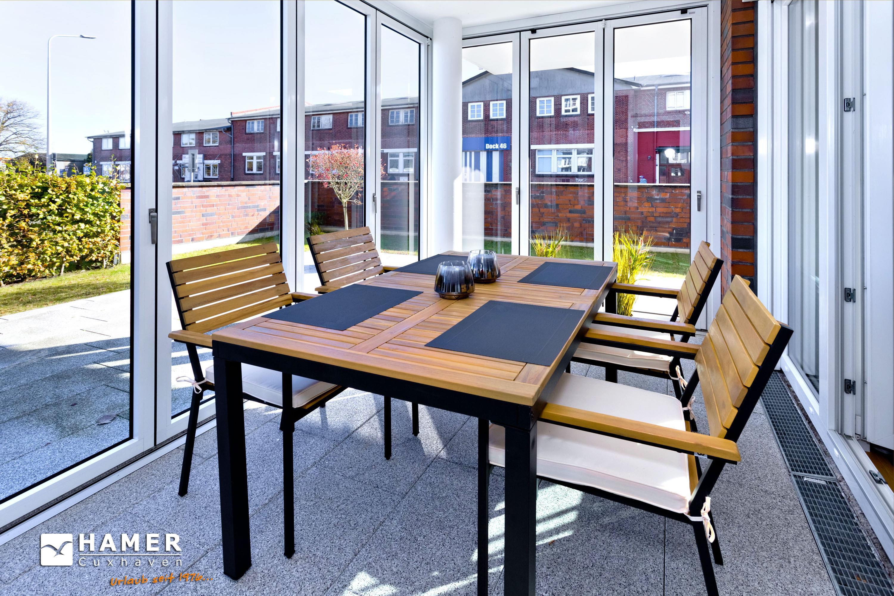 Haus Kapitän Alexander, direkt an der Marina Cuxhaven gelegene Neubauwohnung – NEU RENOVIERT und NEU MÖBLIERT Oktober 2024 – ca. 78m². Tolle 3 Zimmer-Luxus-Wohnung im Erdgeschoss für max. 3 Pers. ausgestattet. Großzügiges Wohnzimmer mit Terrasse (nord/ost). Die Terrasse ist teilweise windgeschützt als Loggia zu nutzen. Vollständig ausgestattete Küchenzeile, 1 Schlafzimmer mit Doppelbett (RÖWA Lattenrost elektr. verstellbar) und TV, Fliegengitter und großem Einbauschrank, 1 Schlafzimmer mit Einzelbett (Lattenrost elektr. verstellbar). Alle Räume sind über elektr. Außenjalousien zu verdunkeln. Fußbodenheizung, Kostenfreies W-Lan-Internet, Kabel-TV und Magenta TV, Nespresso Maschine, barrierefreie Dusche/WC, Miele-Waschmaschine und Miele-Trockner in der Wohnung. Reservierter Pkw-Stellplatz im Carport #8, Fahrradkeller, Nichtraucher und es sind keine Haustiere gestattet.