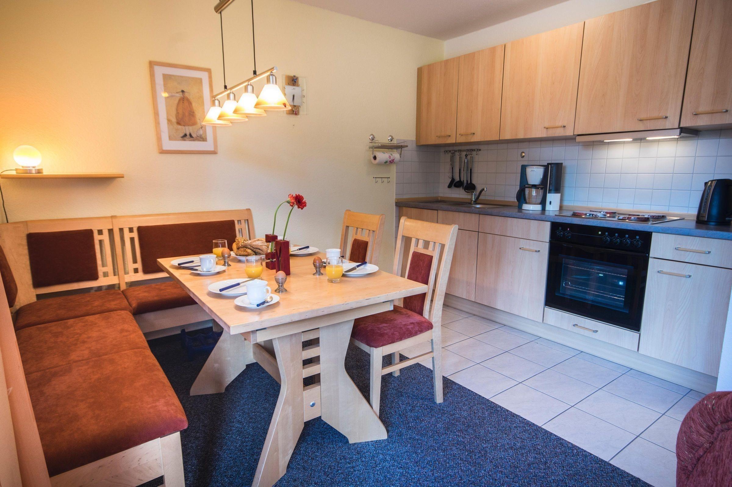Die gemütliche 4-Personen-Ferienwohnung im Erdgeschoss bietet auf 60 qm eine praktische Raumaufteilung und moderne Ausstattung. Sie verfügt über zwei komfortable Schlafzimmer, in denen Gäste zur Ruhe kommen können. Die offene Küche ist mit einem 4-Platten-Herd, Backofen, Mikrowelle, Kühlschrank mit Gefrierfach sowie Küchenkleingeräten wie Kaffeemaschine, Toaster und Wasserkocher ausgestattet. Das einladende Wohnzimmer mit einem Schlafsofa lädt zu geselligen Abenden ein. Ein Badezimmer ist ebenfalls vorhanden.