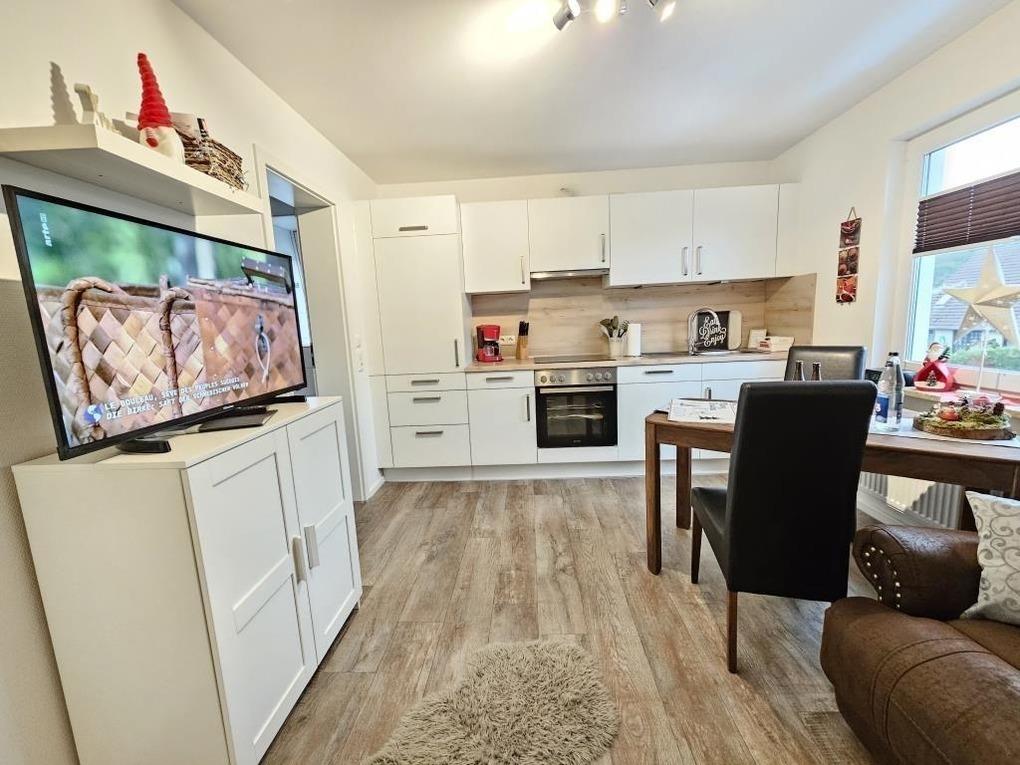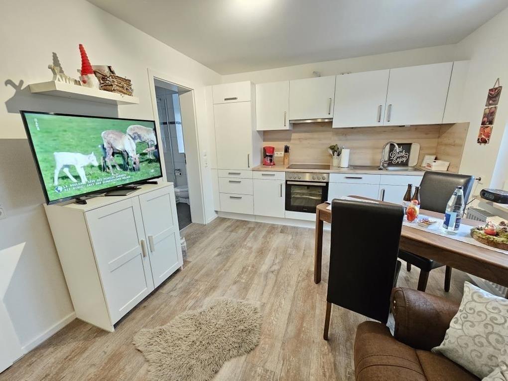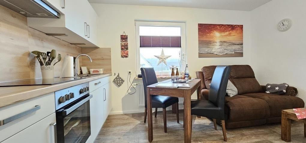 Ferienwohnung mit 1 Schlafraum mit Doppelbett 1,80mx2m, 1 Wohnraum mit Küchenzeile mit Backofen, Kühlschrank, Gefrierfach und Geschirrspüler, Sofa, CD-Radio, neu renoviertes Badezimmer mit Dusche/WC, Föhn, Nichtraucher, WLAN kostenlos, Parkplätze am Haus