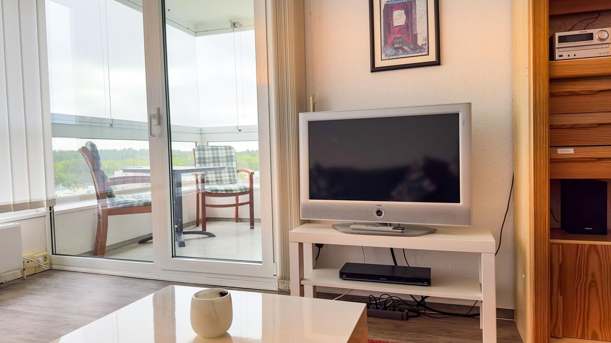 Der Außenbereich der „Frischen Brise FeWo 07.03“ ist ein Highlight für jeden Gast. Die Ferienwohnung bietet eine eigene, überdachte und geschlossene Loggia von etwa 4,5 m², die auch an windigen Tagen genutzt werden kann und einen beeindruckenden Meerblick verspricht. Des Weiteren steht den Gästen ein gemeinschaftlicher Wellnessbereich zur Verfügung, der eine Sauna und einen beheizten Indoor-Pool beinhaltet – ideale Orte zur Entspannung nach einem aktiven Tag. Der Sandstrand liegt nur 300 Meter entfernt und lädt zu Spaziergängen oder Wassersportaktivitäten ein. Umgeben von einem Waldgebiet, bietet die Umgebung zahlreiche Wander- und Joggingmöglichkeiten. Die Kombination aus Strandnähe und der idyllischen Natur macht diese Ferienwohnung zur perfekten Wahl für Erholungsuchende und Aktive.