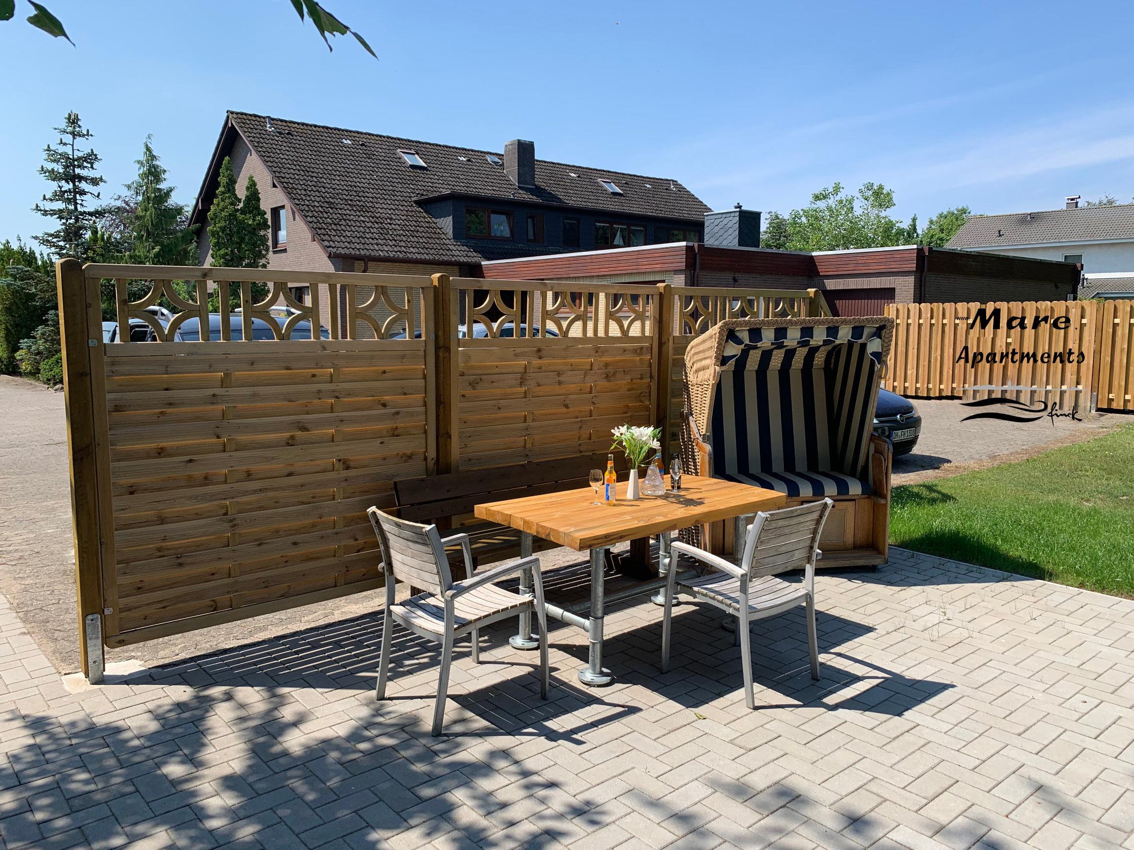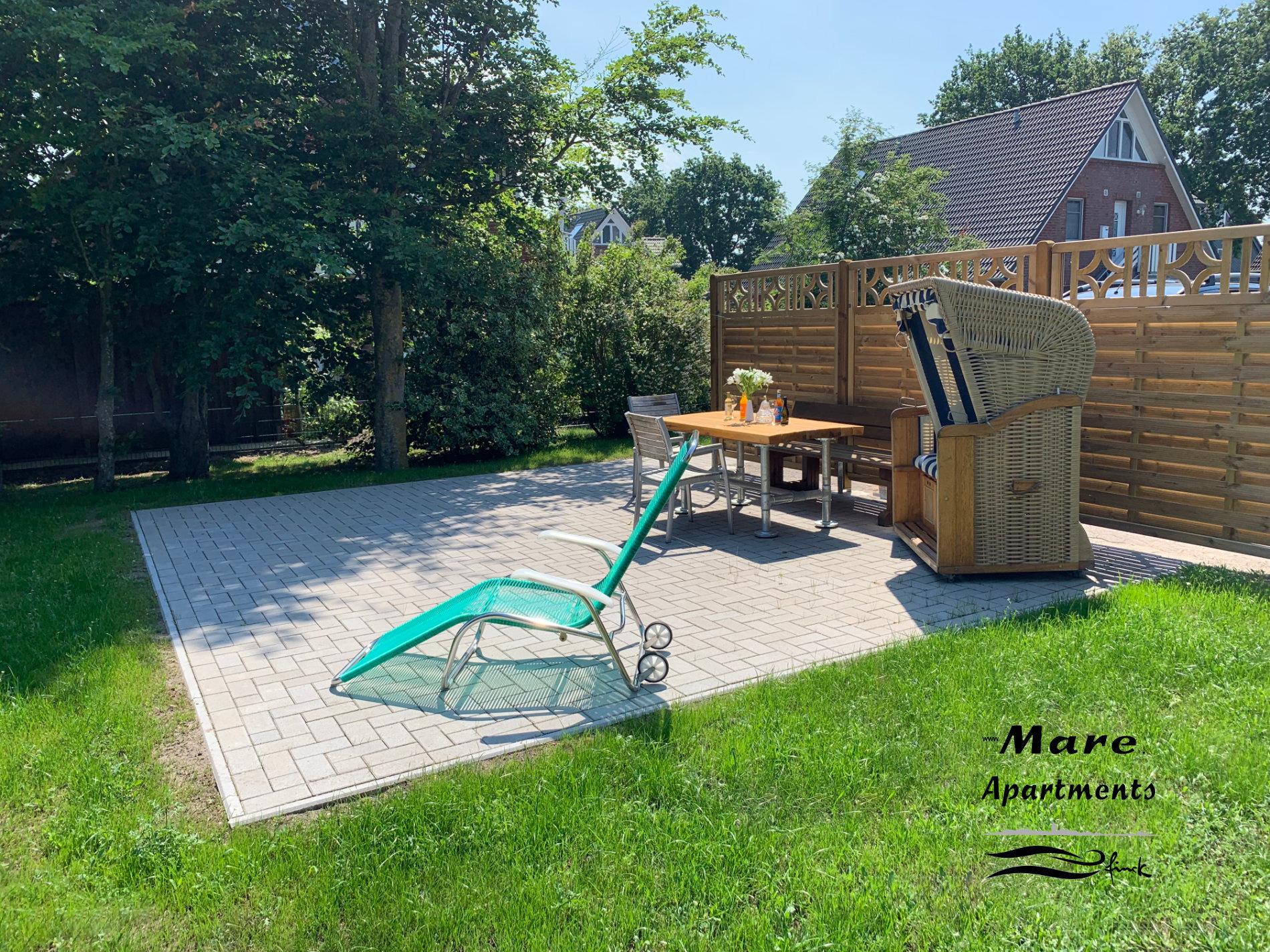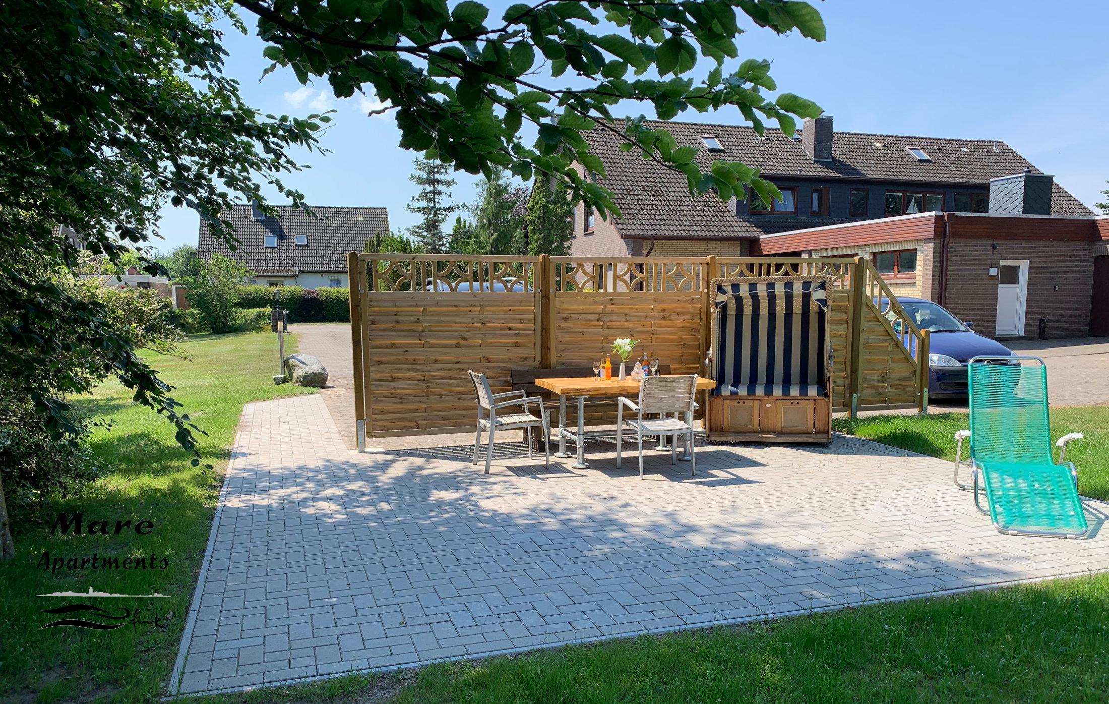 Gartenfläche mit Sitzmöglichkeiten und Strandkorb (saisonbedingt ), Abstellraum für Fahrräder usw, PKW-Stellplatz .