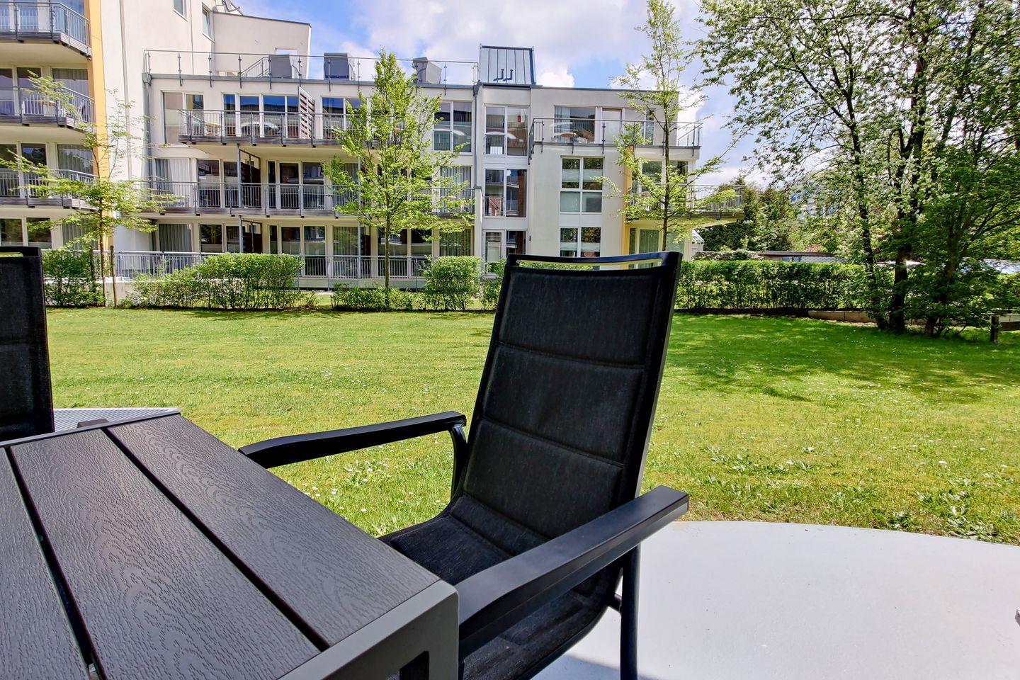 Sie wohnen in unmittelbarer Strandnähe in einem schönen 2-Zimmer Appartement für bis zu 4 Personen mit überdachter Terrasse auf ca. 40 m² Wohnfläche. Das kleine Schlafzimmer mit getrennten Betten (ca. 90 x 190 cm) verfügt über einen eigenen Zugang zur Terrasse. Der Wohnraum ist ausgestattet mit einem bequemen Essplatz sowie einer Doppelbett-Schlafcouch mit eigener Matratze (160 x 200 cm Liegefläche). Ein modernes Duschbad, Einbauschränke im Eingangsbereich und ein bequem zugänglicher Tiefgaragenplatz (Durchfahrtshöhe: 190 cm) für Ihren PKW mit Fahrstuhl zur Wohnung runden das Angebot ab.