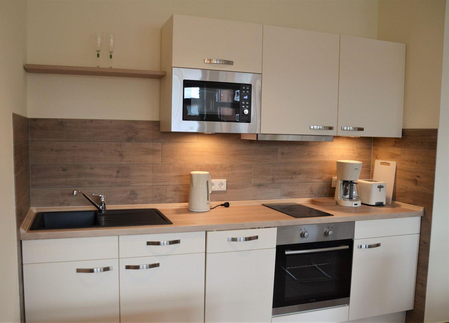 Die Küchenzeile ist voll ausgestattet und verfügt über eine Mikrowelle, einen Geschirrspüler und einem Kühlschrank mit Gefrierfach. Das Bad ist voll gefliest und bietet