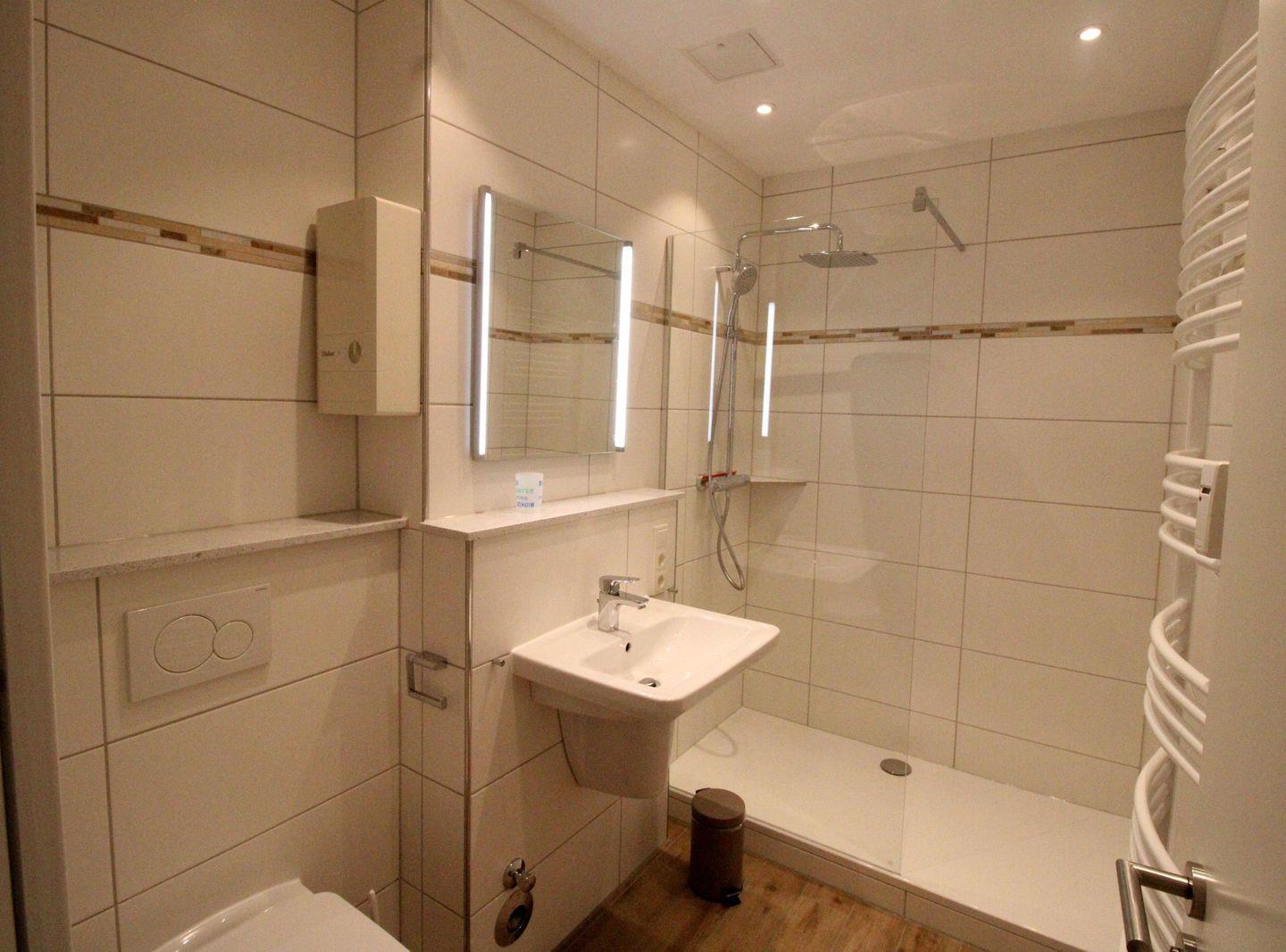einen niedrigen EInstieg zur Dusche, ein Waschbecken, WC, Ablagen und eine hohe Wandheizung.
