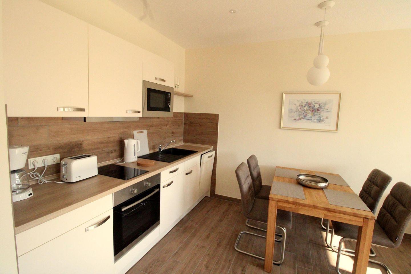 Die Küchenzeile ist voll ausgestattet und verfügt über eine Mikrowelle, einen Geschirrspüler und einem Kühlschrank mit Gefrierfach. Das Bad ist voll gefliest und bietet einen niedrigen EInstieg in die Dusche und ein WC.