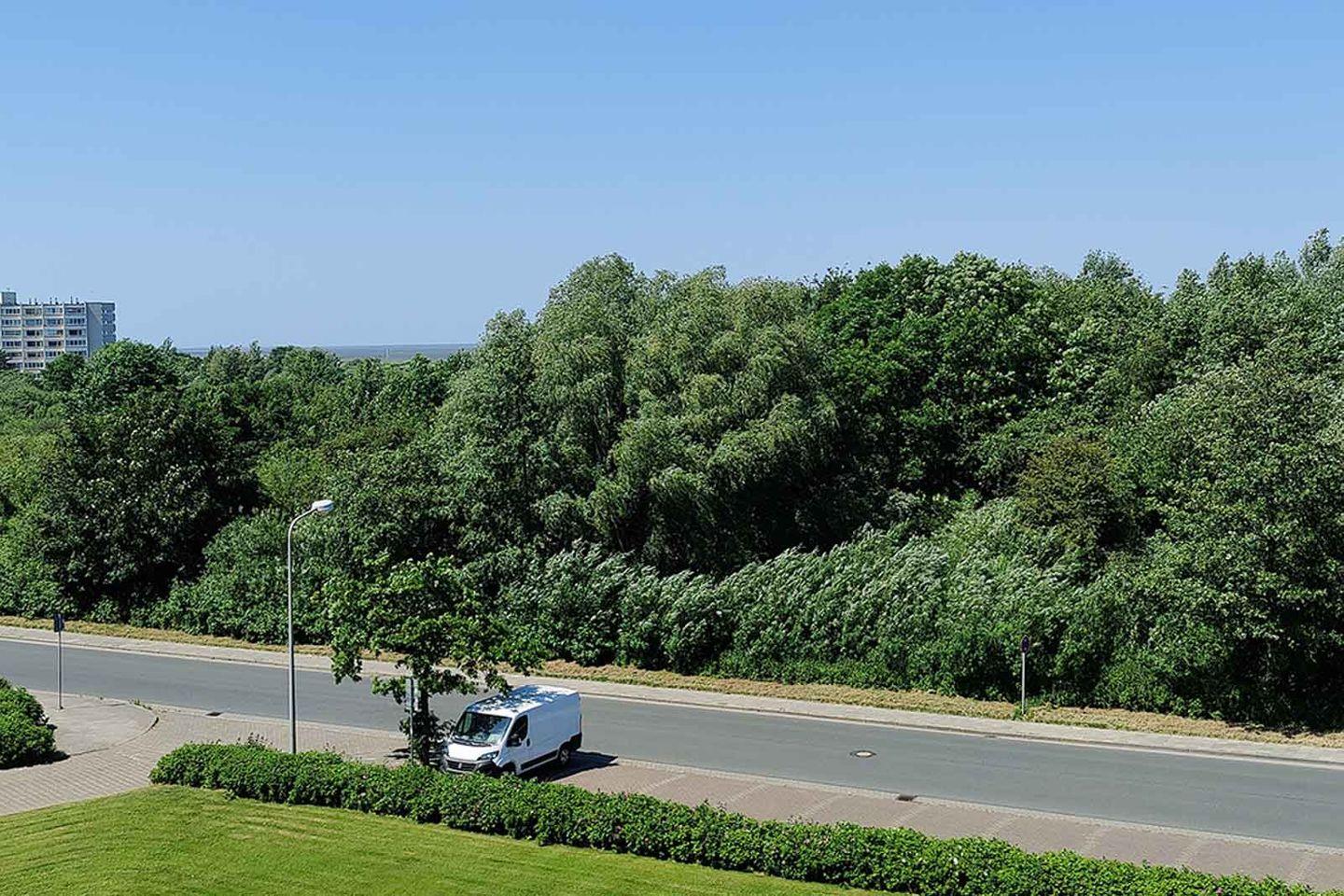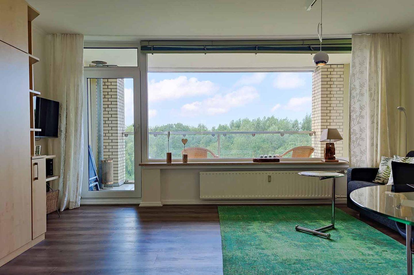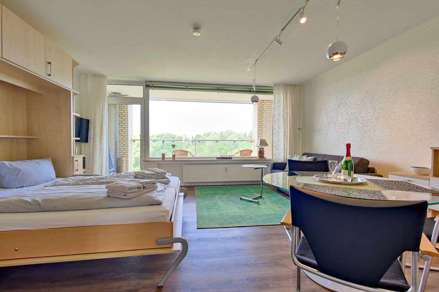 Sie wohnen auf der dritten Etage in einer 1-Raum-Ferienwohnung mit separater, neuer Küche und luxuriösem Duschbad. Der große, verglaste und überdachte Balkon erlaubt den Blick auf ein kleines Wäldchen, welcher zum Nationalpark Wattenmeer gehört, und auf das Wattenmeer links und rechts vom Wäldchen.