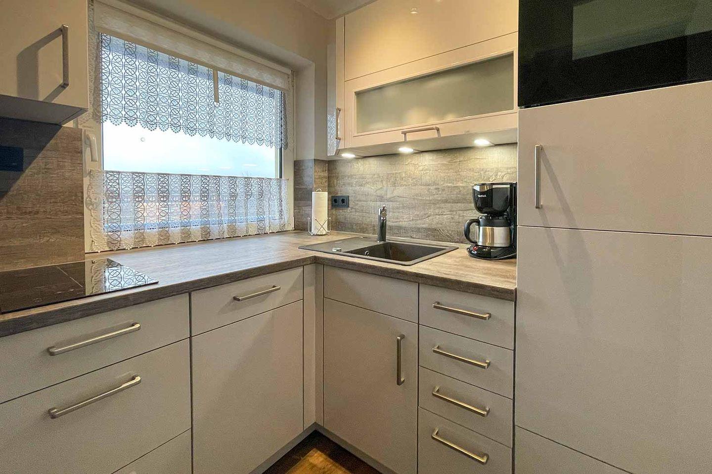 Der große Wohnraum ist durchdacht eingerichtet: Das moderne Schrankbett mit 2 Betten á 90x200 cm lässt sich bequem ausklappen, dabei müssen keine Möbel verrückt werden. Im Schrank gibt es genügend Unterbringungsmöglichkeiten für Ihre Kleidung. Der große Glastisch bietet viel Platz und hat zudem in der Mitte eine Drehplatte. Vom Schlafsofa (160x200 cm Liegefläche) genießen Sie den Blick aufs Meer und auch der Balkon ist gemütlich eingerichtet, wahlweise mit Korb- und/oder modernen Relaxstühlen. Die moderne und in 2022 fertig gestellte Einbauküche lässt keine Wünsche offen und wurde mit modernen E-Geräten wie einem Induktionsherd mit zwei Platten ausgestattet.