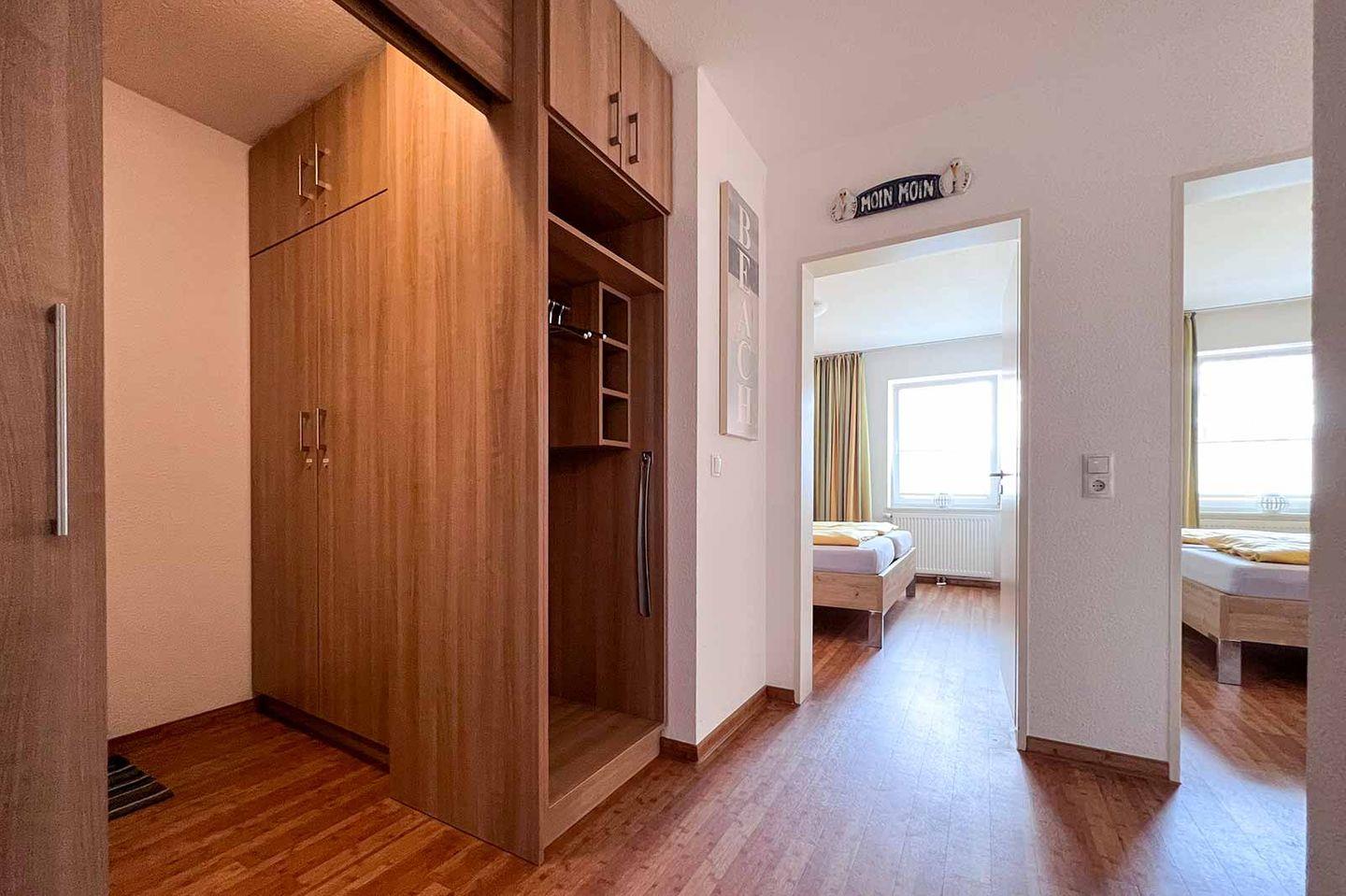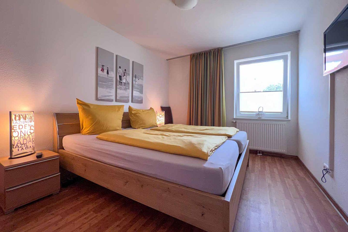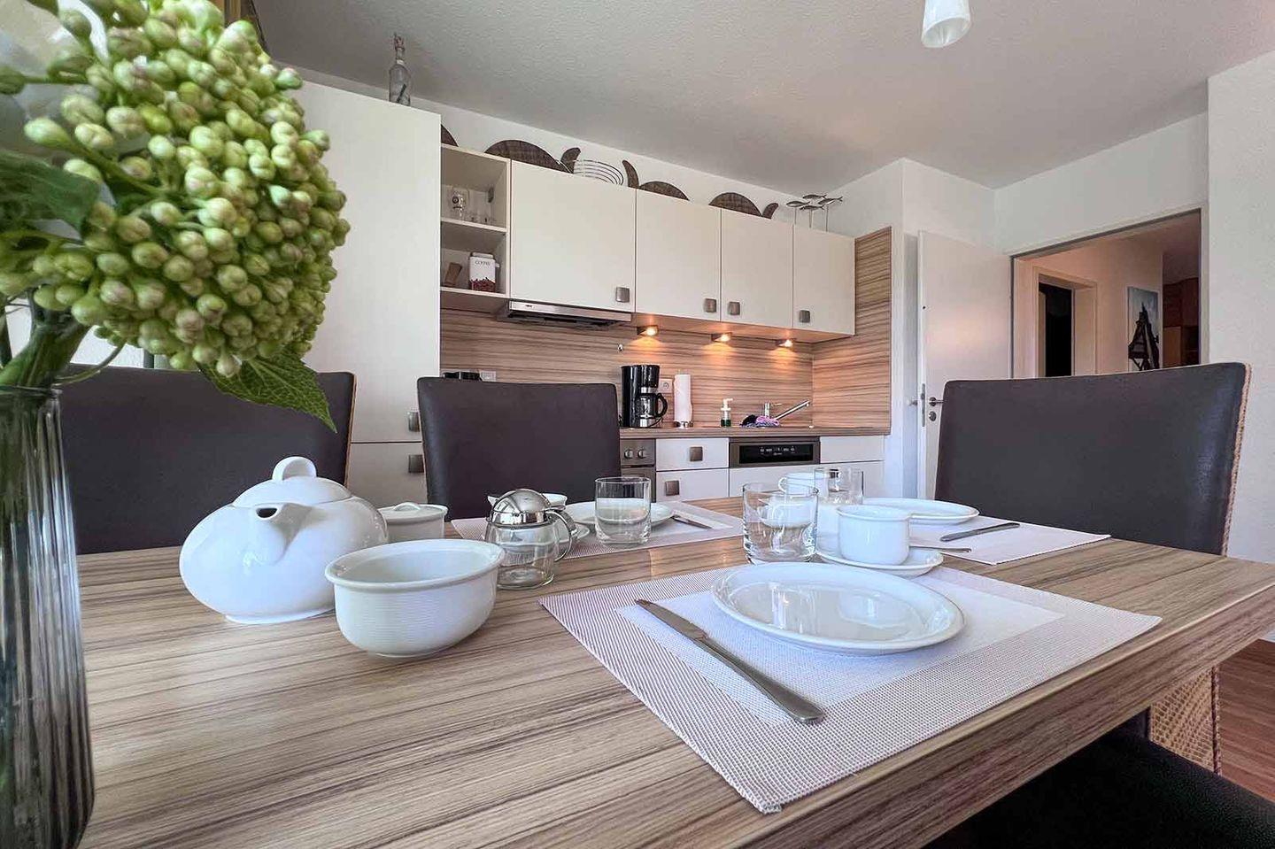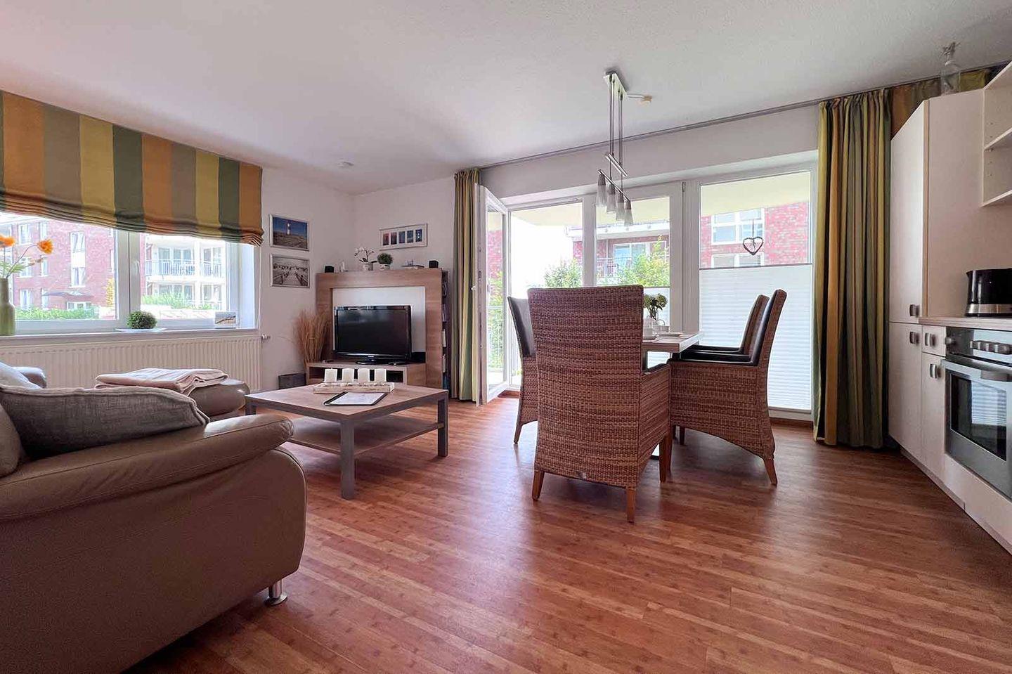 Beide Schlafzimmer sind ausgestattet mit Doppelbetten und in einem der beiden Räume steht zudem ein TV-Gerät zur Verfügung. Der Wohnraum, von dem der Balkon abgeht, ist offen zur Küche gestaltet und bildet so den zentralen Punkt der familienfreundlichen Wohnung. Genießen Sie beim Frühstück die Morgensonne auf dem Ost-Balkon. Ein modern und hell gestaltetes Duschbad ergänzt das Raumkonzept.