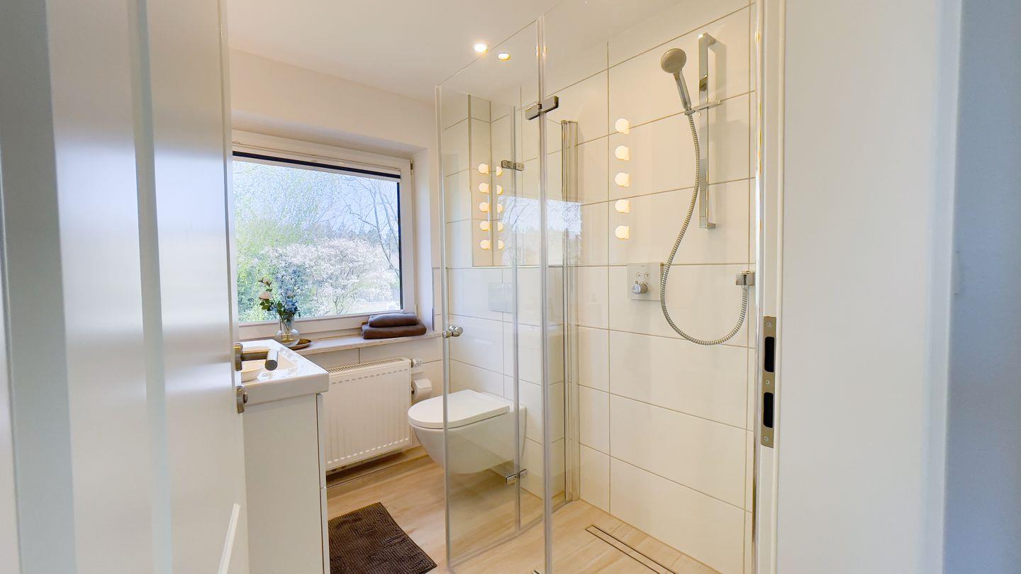 Das moderne, helle Tageslichtbad ist mit einer bodengleichen Dusche ausgestattet.
